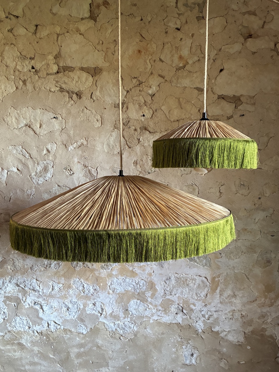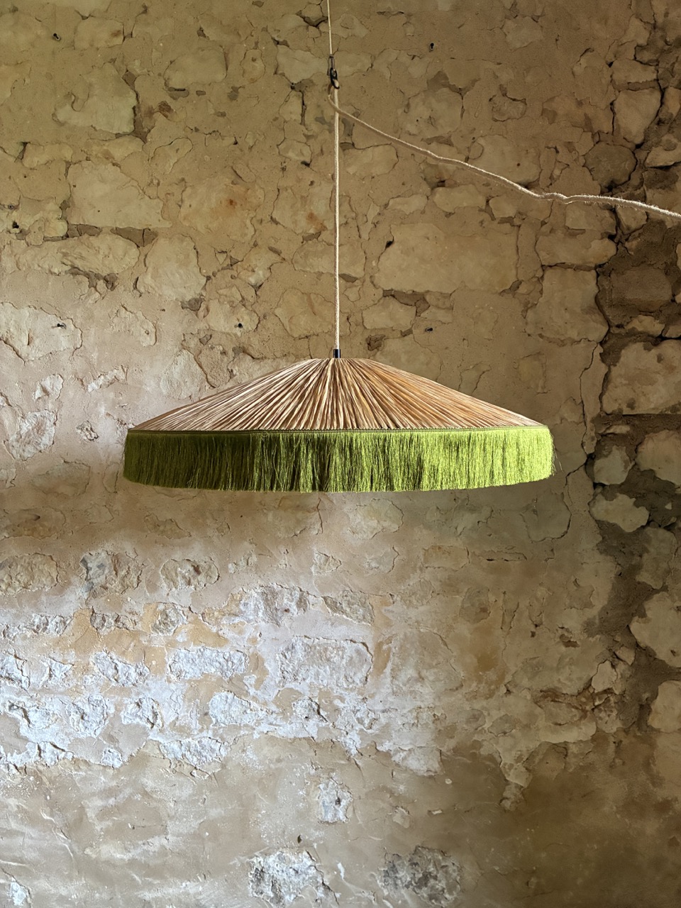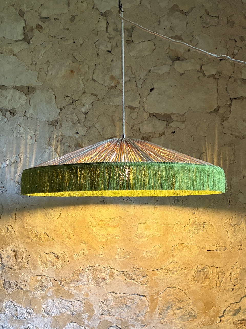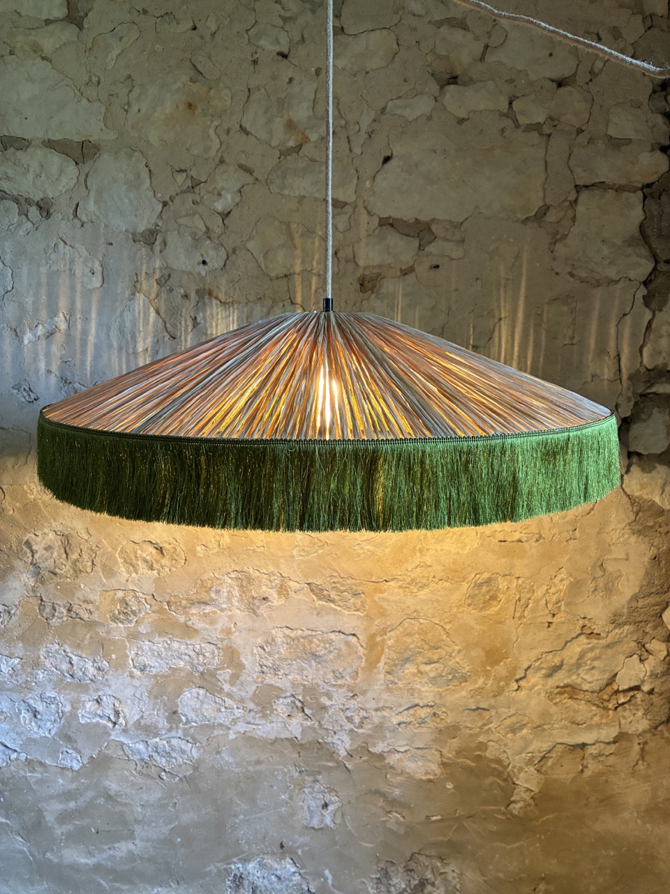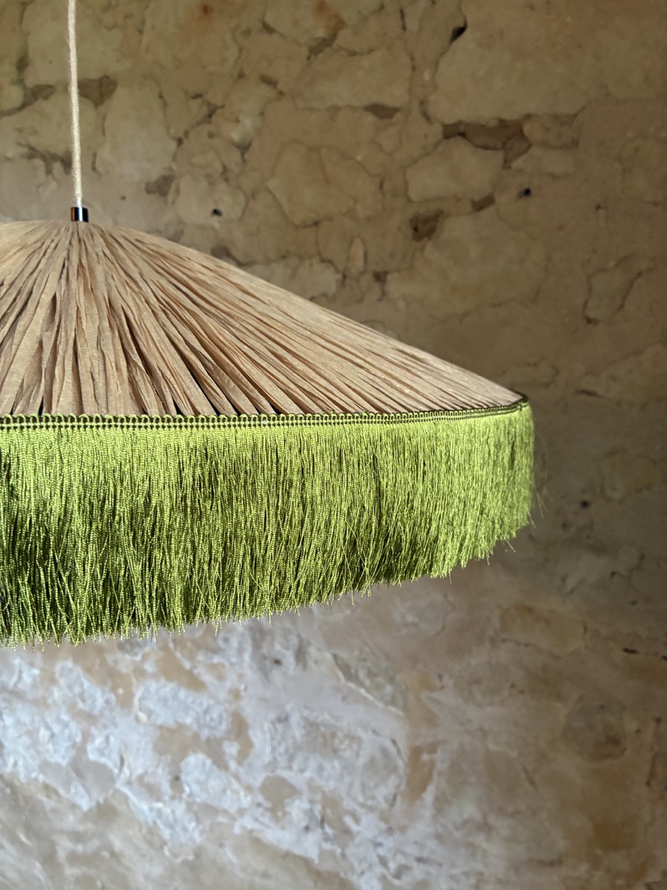 Abat-jour de suspension en passementerie et papier façon raphia.