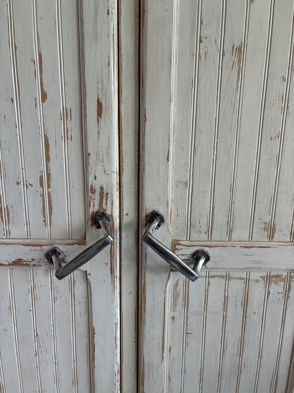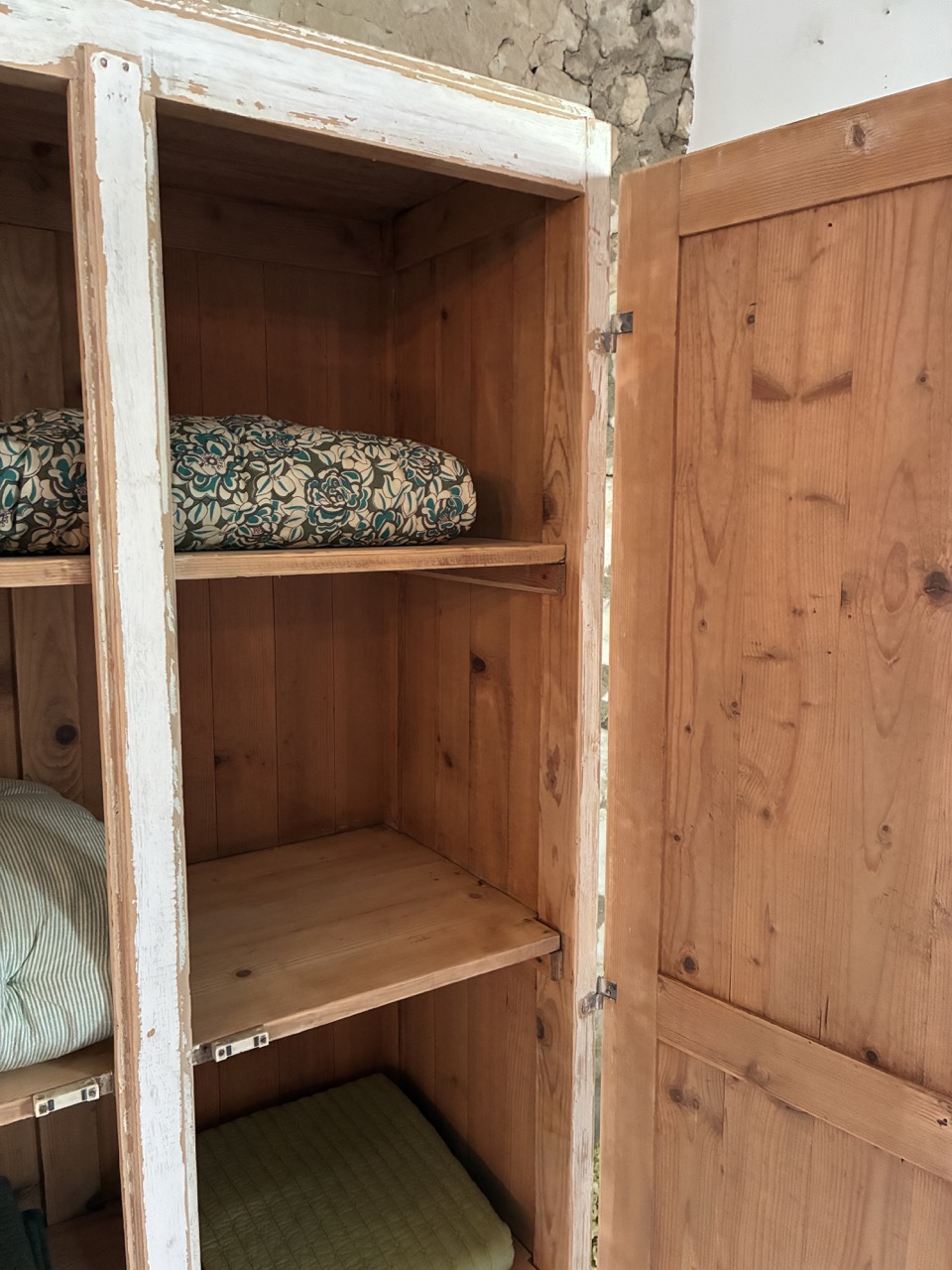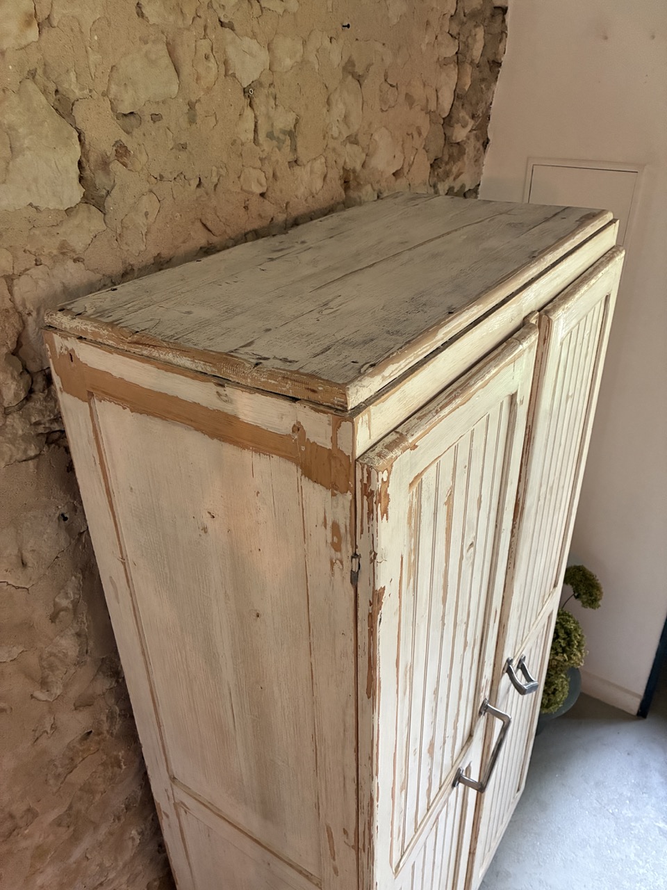 Belle armoire patinée blanche. Fonctionnelle et robuste, elle offre un vaste espace de rangement pour organiser les vêtements et linge de maison afin de préparer l’automne.