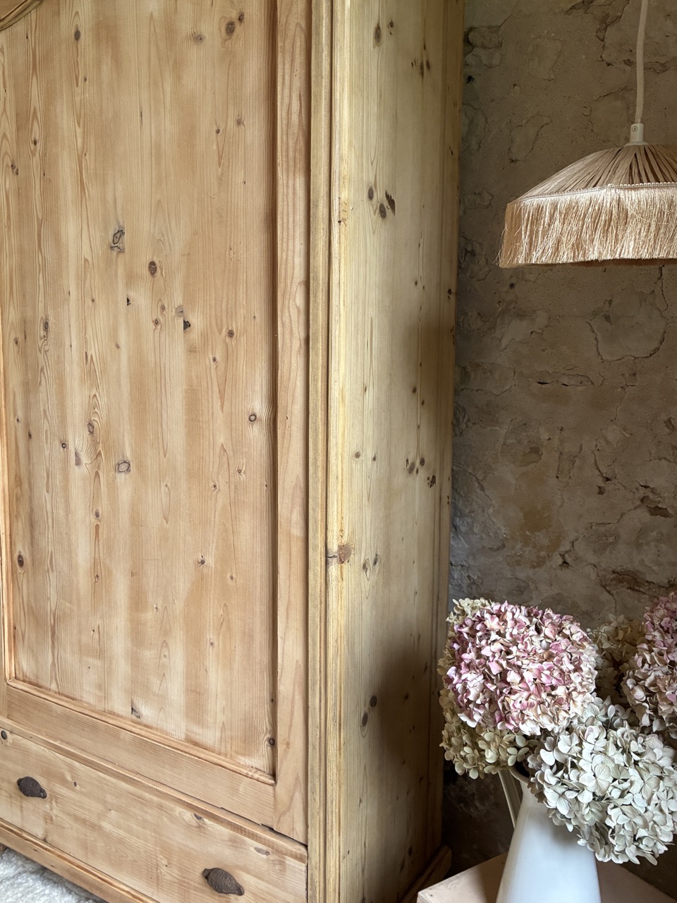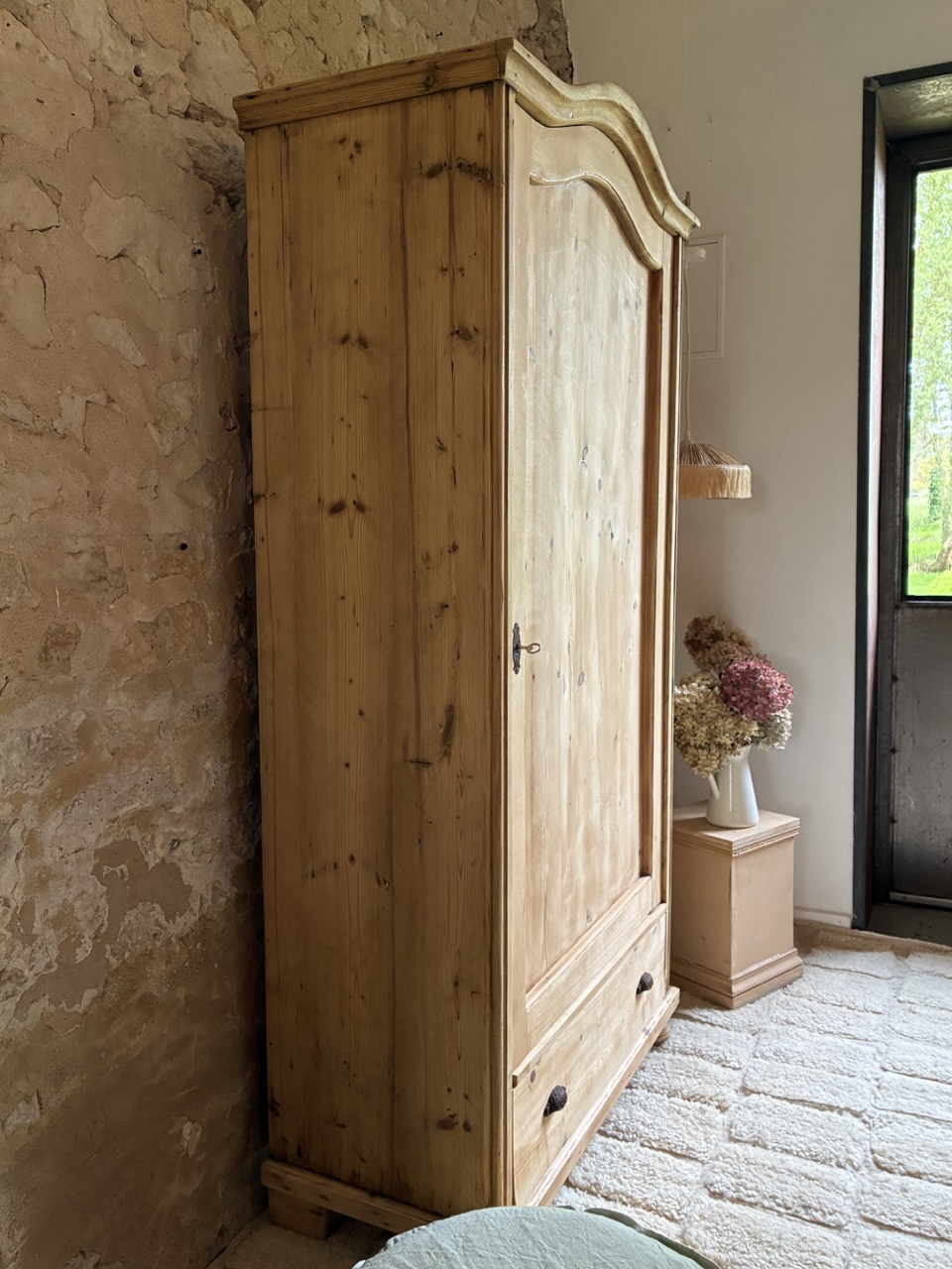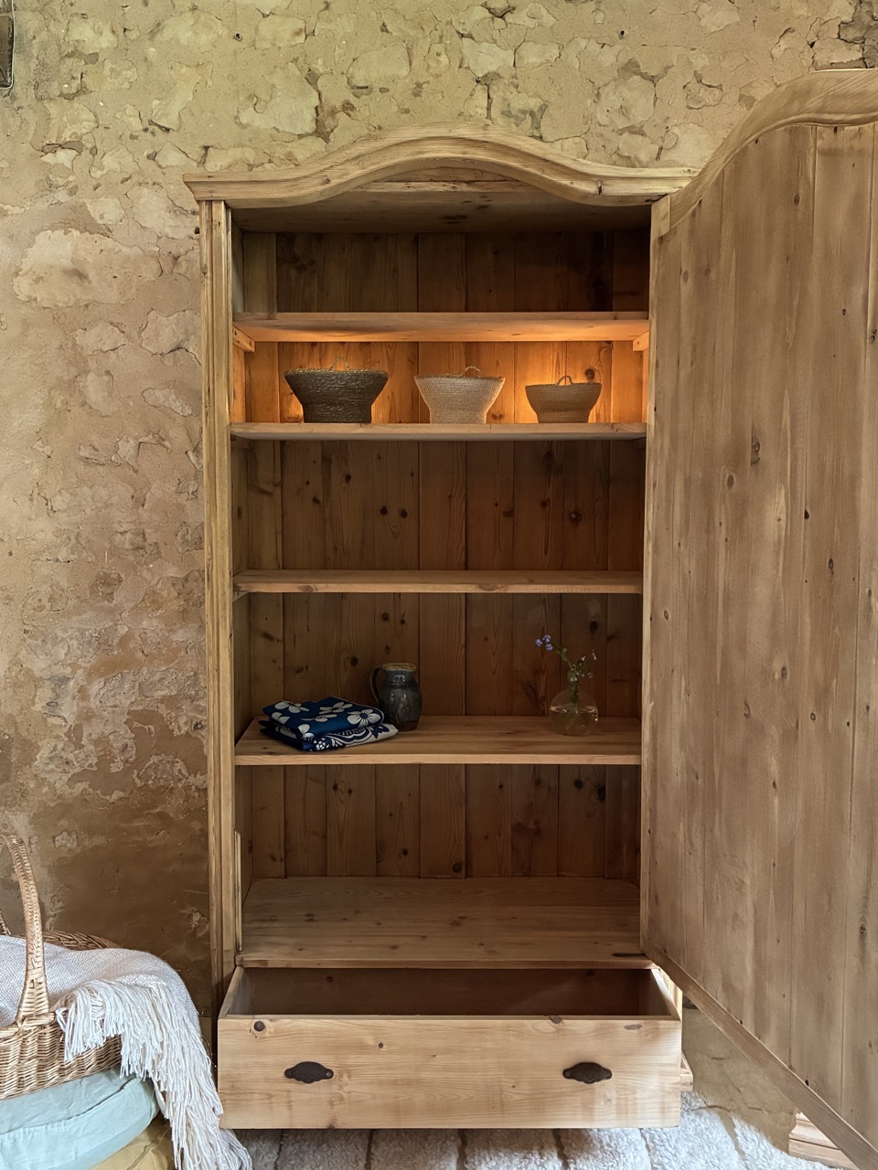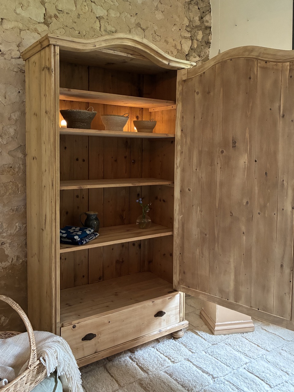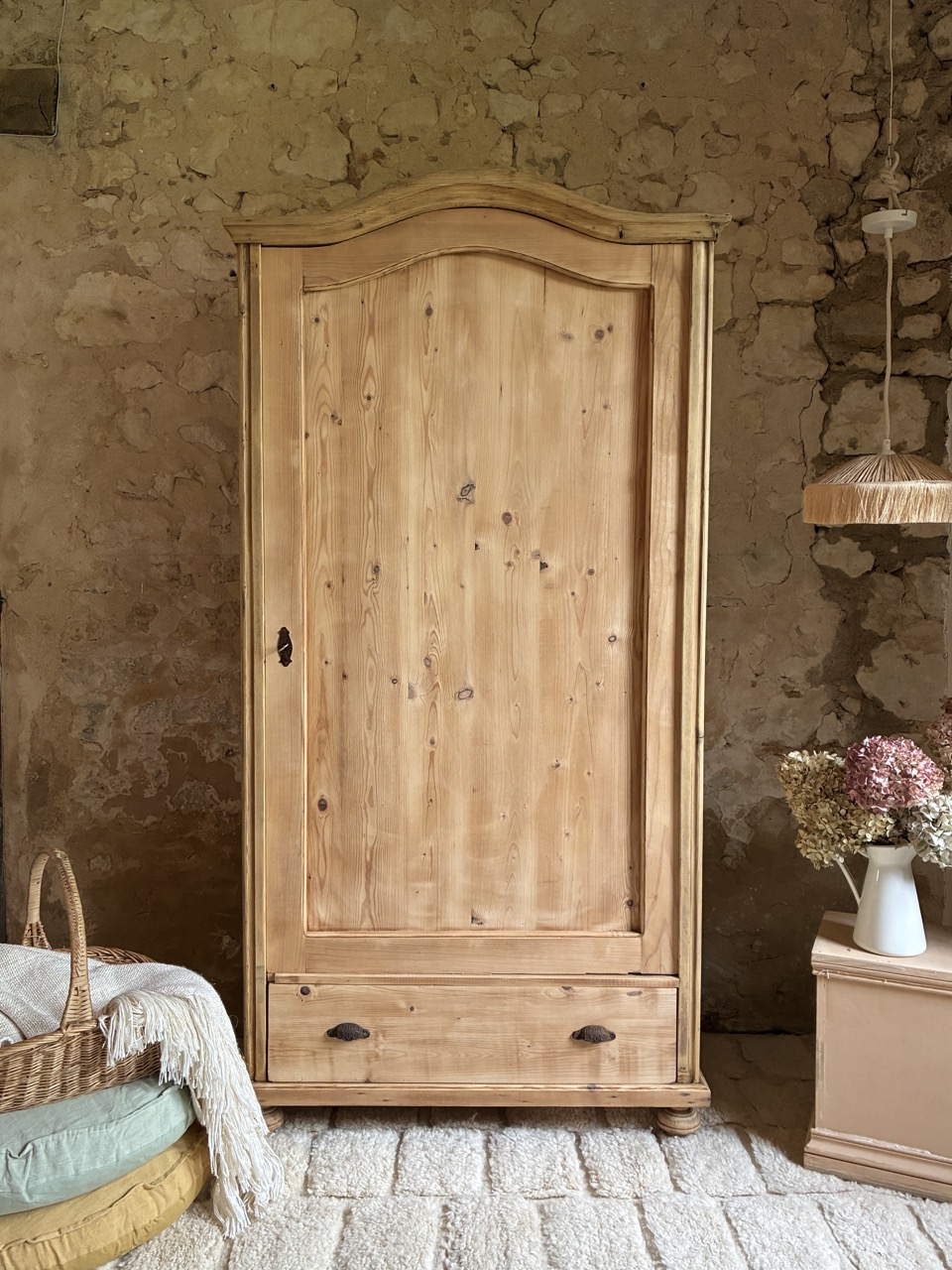 On craque pour cette armoire en pin. Elle est idéale pour une chambre à coucher. Elle offre un bel espace de rangement grâce à ses cinq niveaux et son tiroir. Sa serrure fonctionnelle vous permet de fermer à clefs vos trésors.