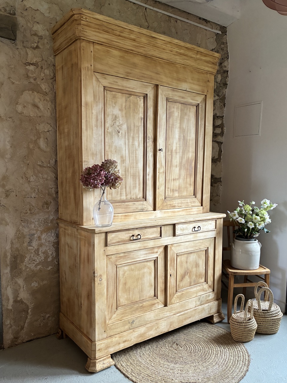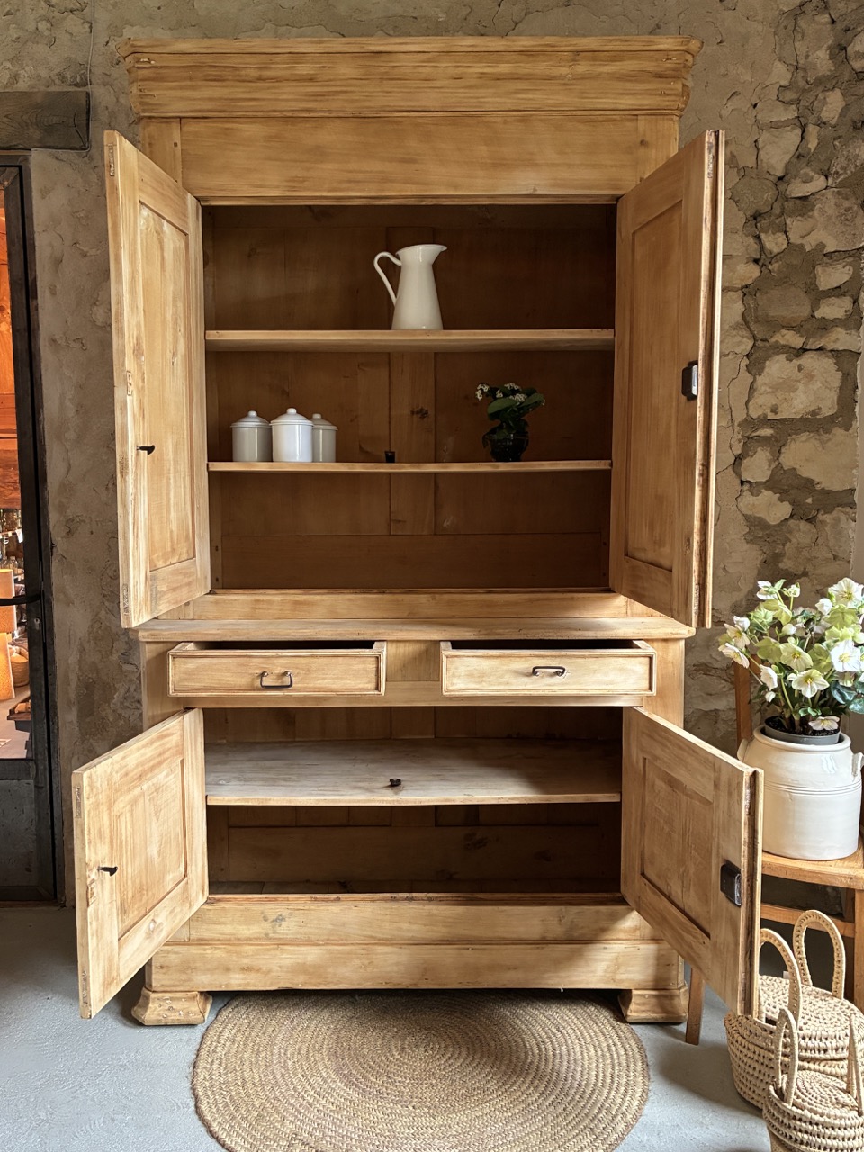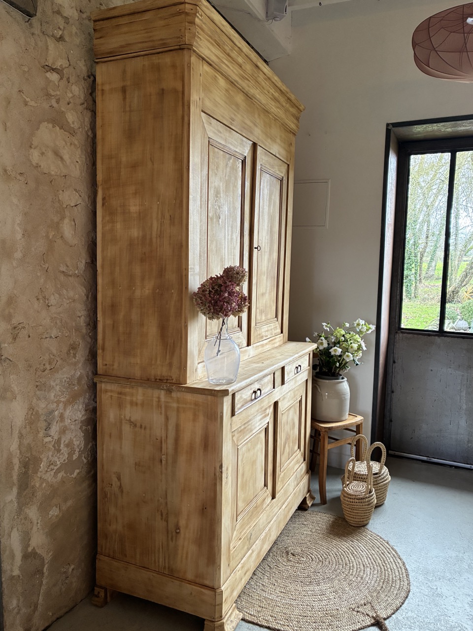 Il est imposant par sa prestance, voici un magnifique buffet deux-corps en peuplier. Sa partie basse est composée de deux portes et deux tiroirs, et sa partie haute de deux portes. Sa corniche vient marquer sa hauteur et asseoir son esthétisme. Son aspect brut le rend lumineux, et ses dimensions lui offrent une très large capacité de rangement. Ce deux-corps a tout pour être la pièce maîtresse de votre cuisine ou de votre salle à manger.