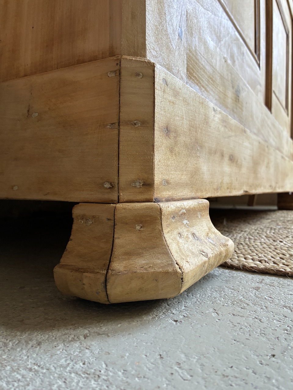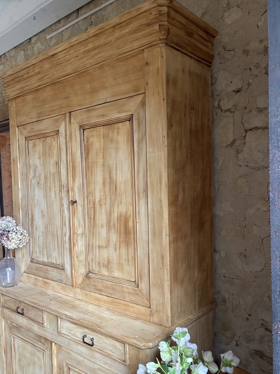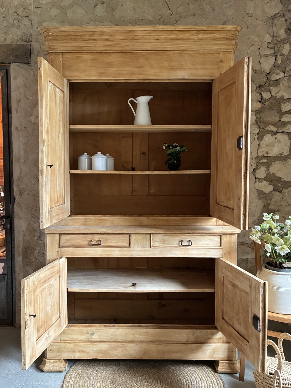 Il est imposant par sa prestance, voici un magnifique buffet deux-corps en peuplier. Sa partie basse est composée de deux portes et deux tiroirs, et sa partie haute de deux portes. Sa corniche vient marquer sa hauteur et asseoir son esthétisme. Son aspect brut le rend lumineux, et ses dimensions lui offrent une très large capacité de rangement. Ce deux-corps a tout pour être la pièce maîtresse de votre cuisine ou de votre salle à manger.