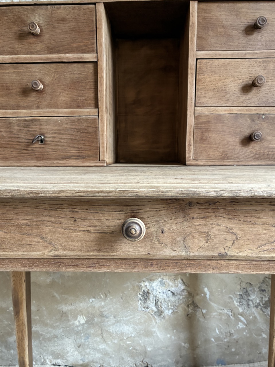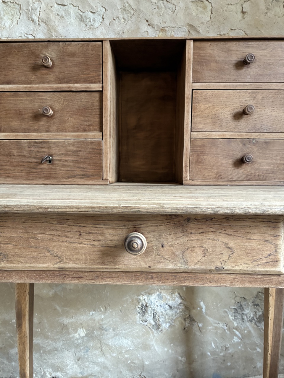 Il possède 6 tiroirs de rangement, une alcôve et un tiroir compartimenté sous son plateau.