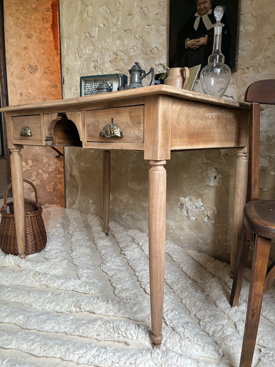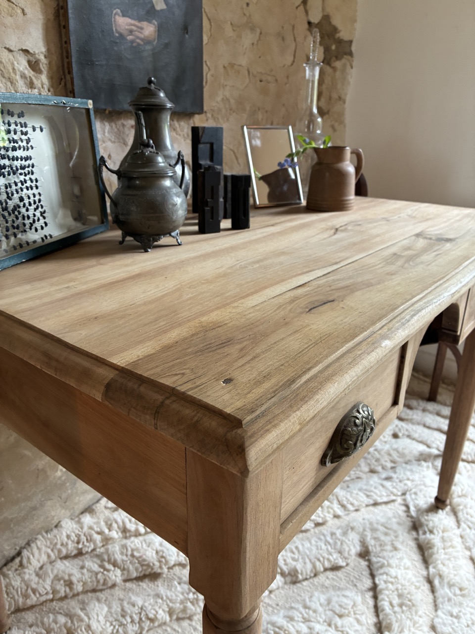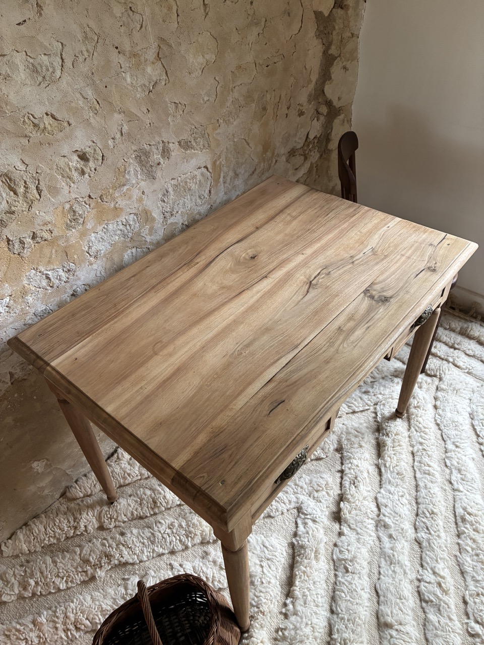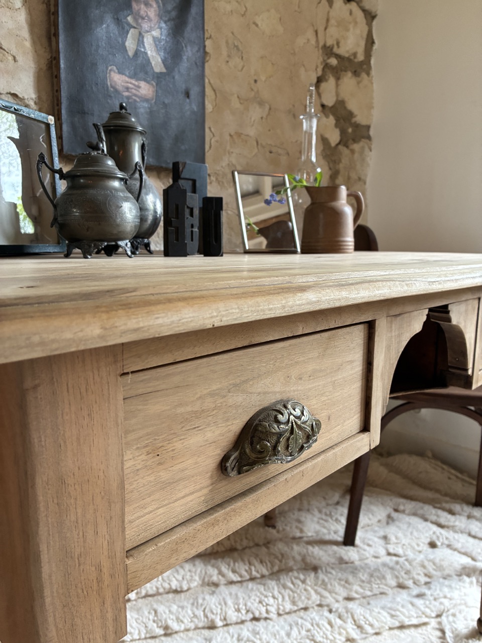 C’est une beauté ! Ce bureau a été fraichement ponçé par l’équipe de l’atelier. Fait de teck, il est robuste et offre des tonalités de bois chaudes. On aime son petit casier et les deux tiroirs profonds de chaque côté.