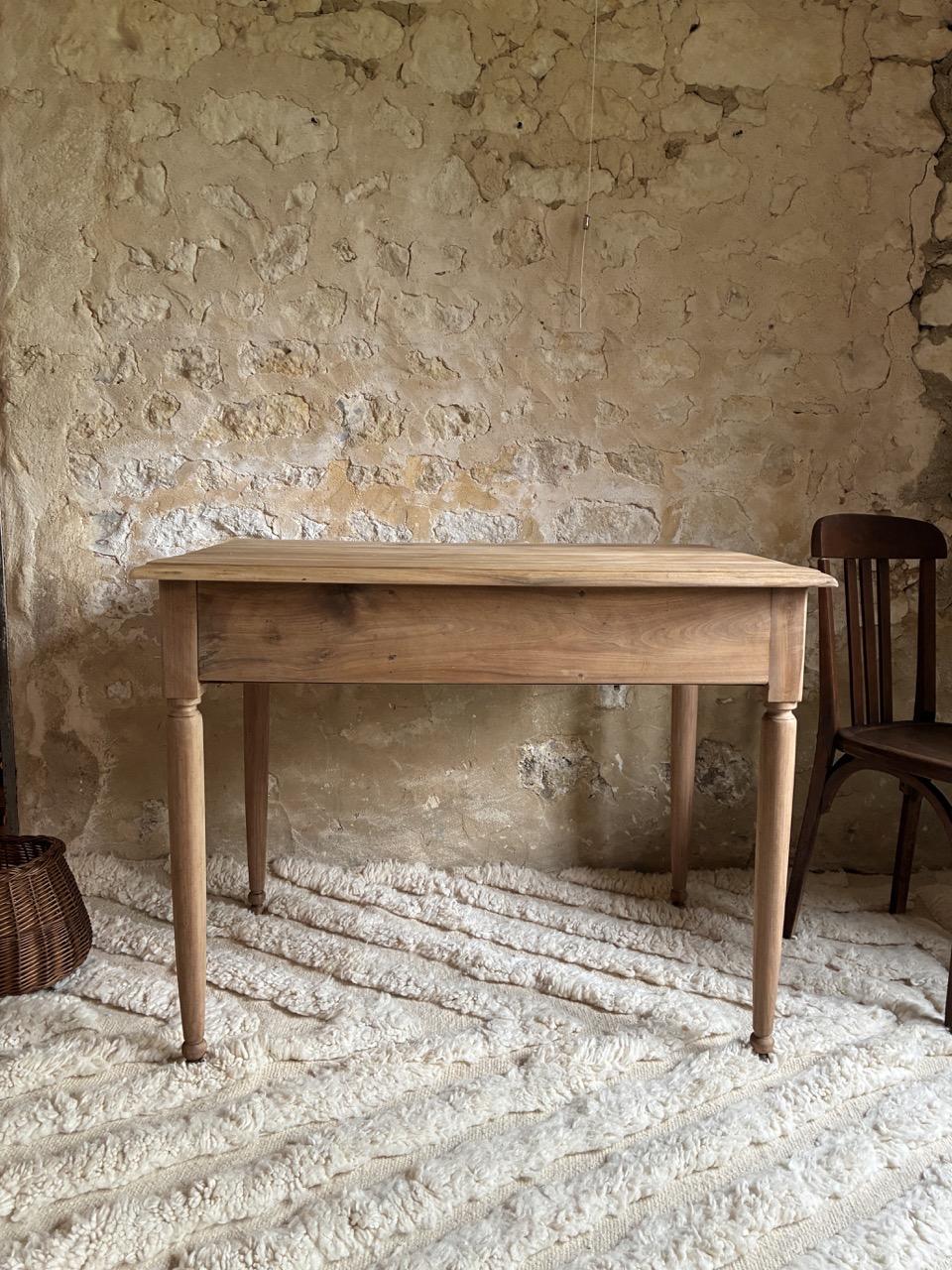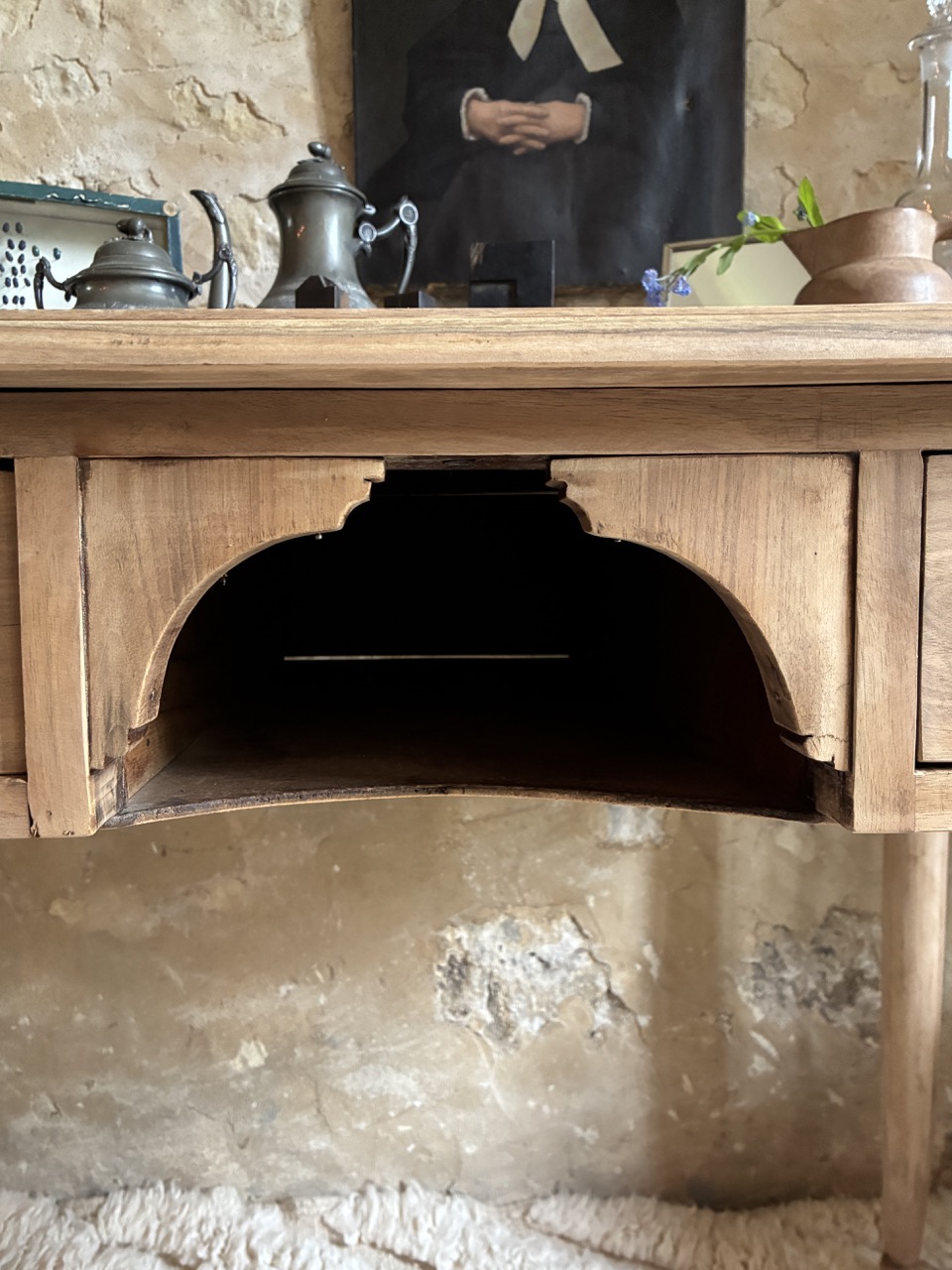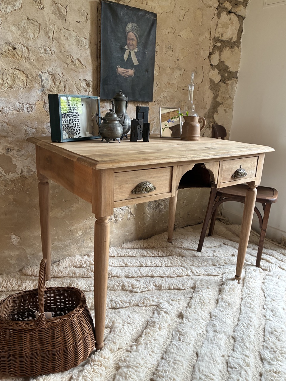 C’est une beauté ! Ce bureau a été fraichement ponçé par l’équipe de l’atelier. Fait de teck, il est robuste et offre des tonalités de bois chaudes. On aime son petit casier et les deux tiroirs profonds de chaque côté.