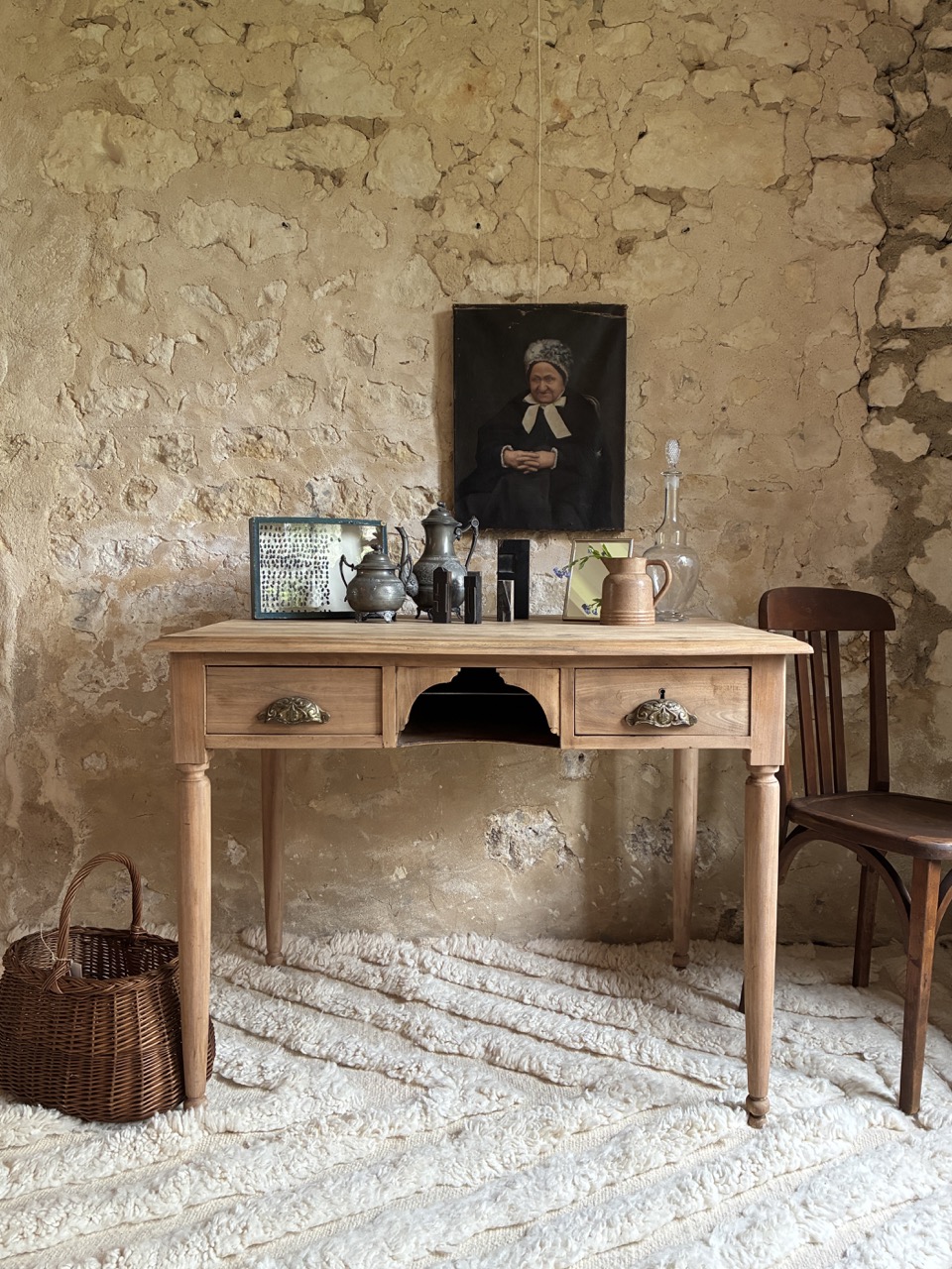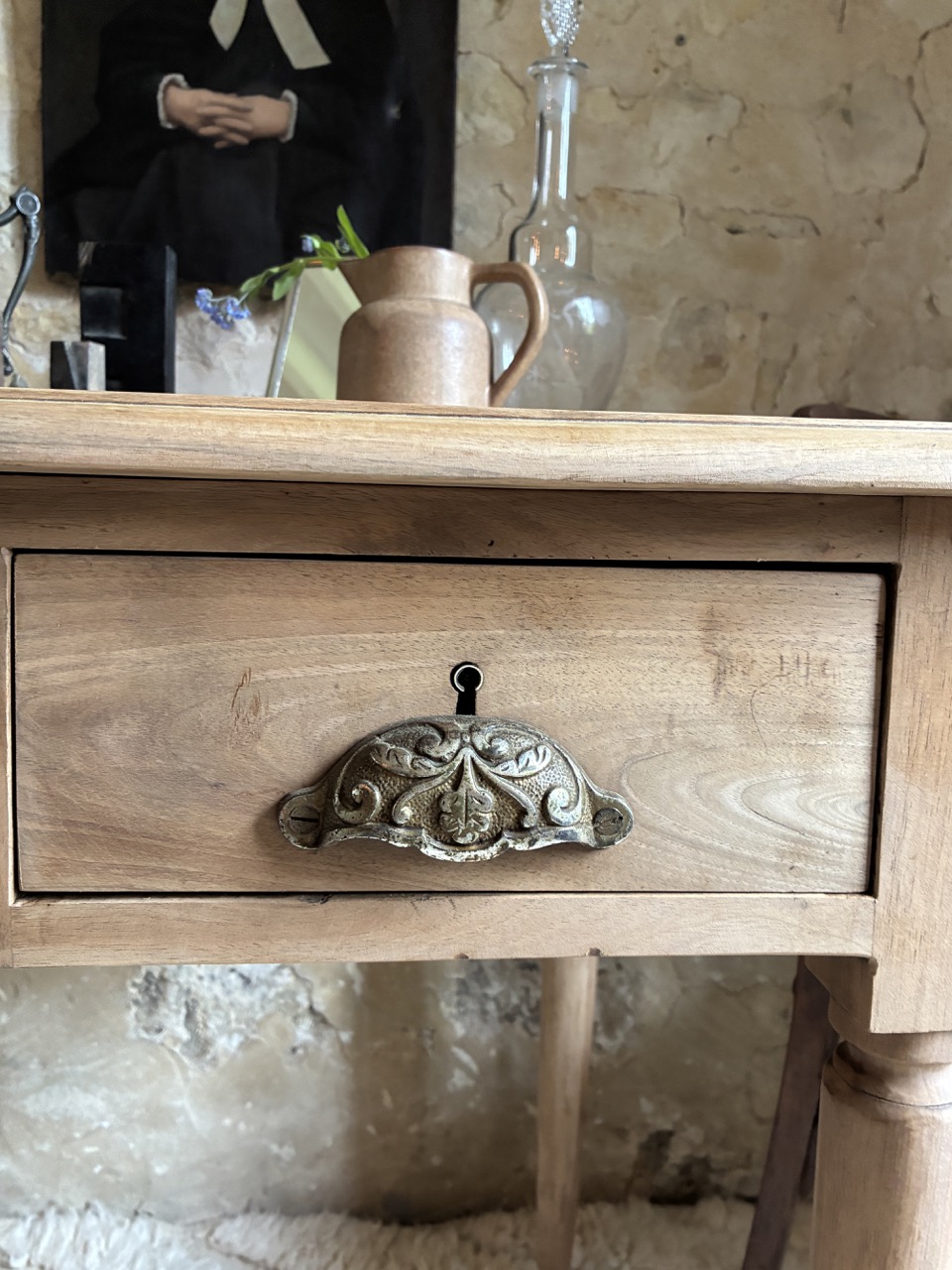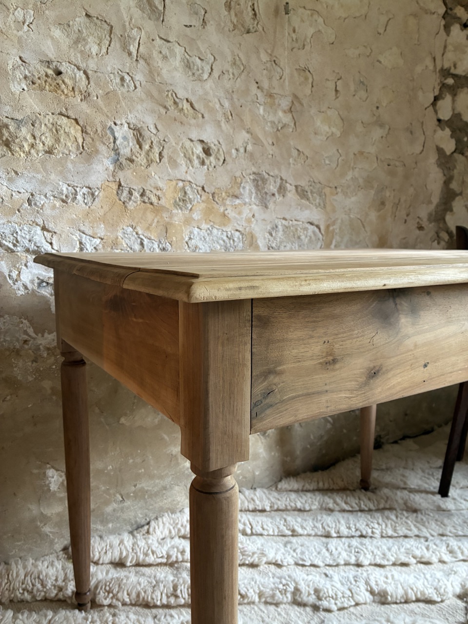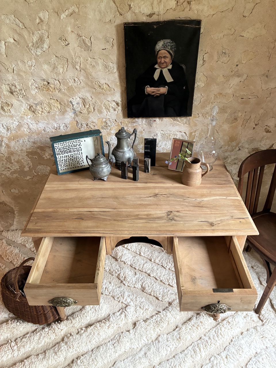C’est une beauté ! Ce bureau a été fraichement ponçé par l’équipe de l’atelier. Fait de teck, il est robuste et offre des tonalités de bois chaudes. On aime son petit casier et les deux tiroirs profonds de chaque côté.