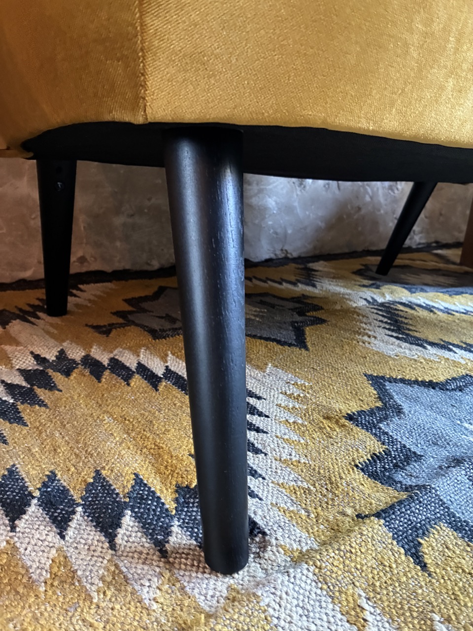 | Matière | Velours ras ocre, pieds en bois noir. |