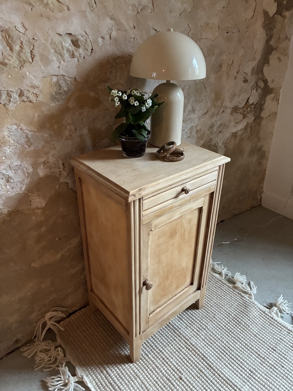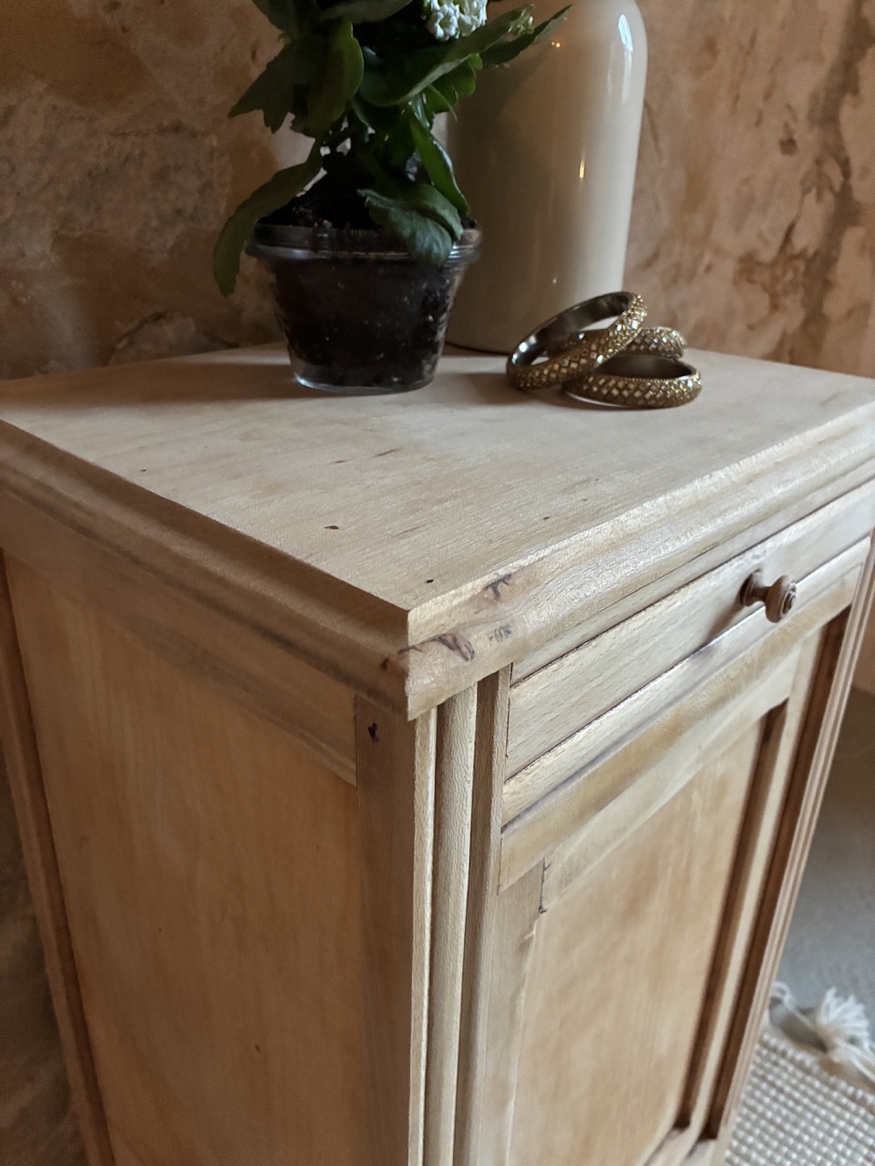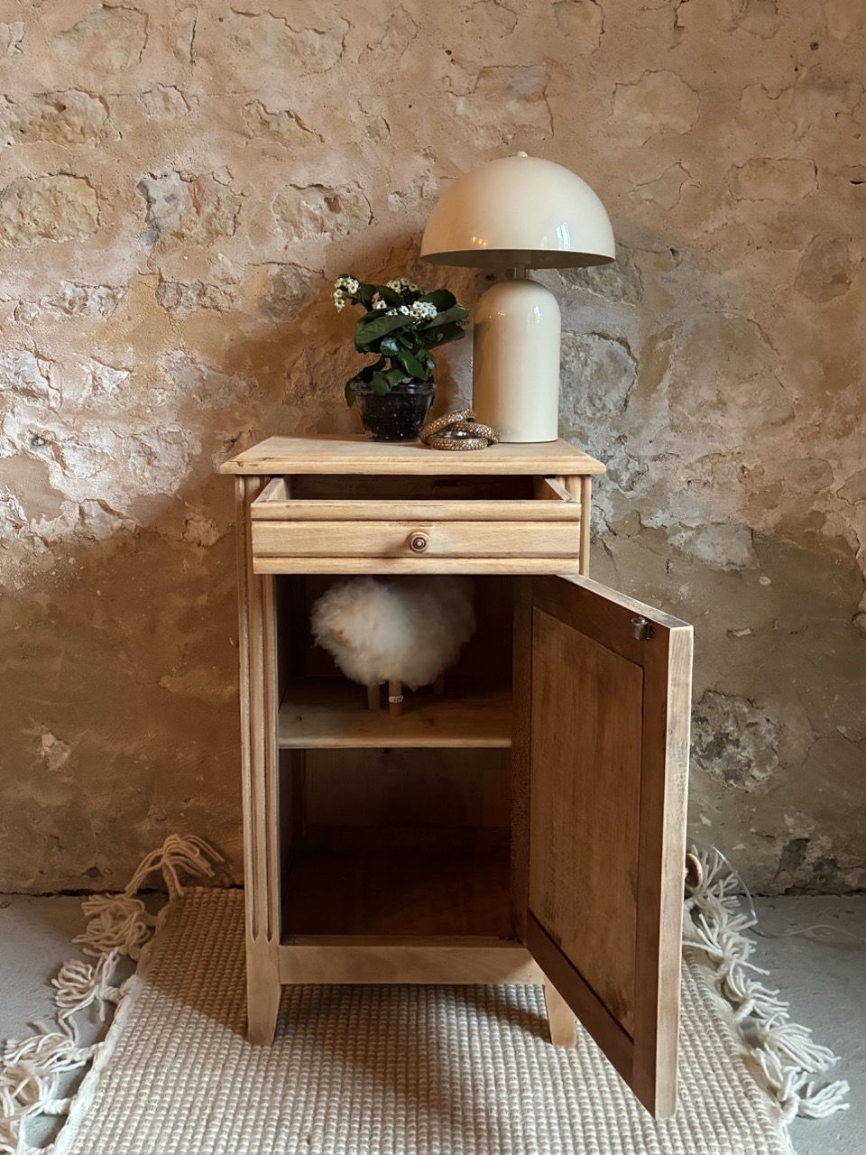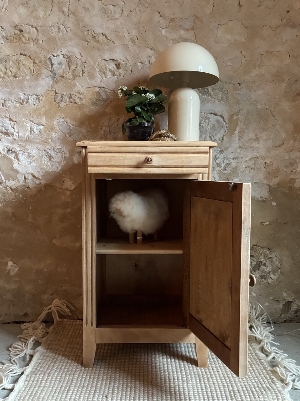 Le deuxième de la journée ! Joli chevet, cette fois-ci comprenant un tiroir et une porte. Il est brut en bois clair. Idéal pour y cacher vos secrets et poser une lampe de chevet.