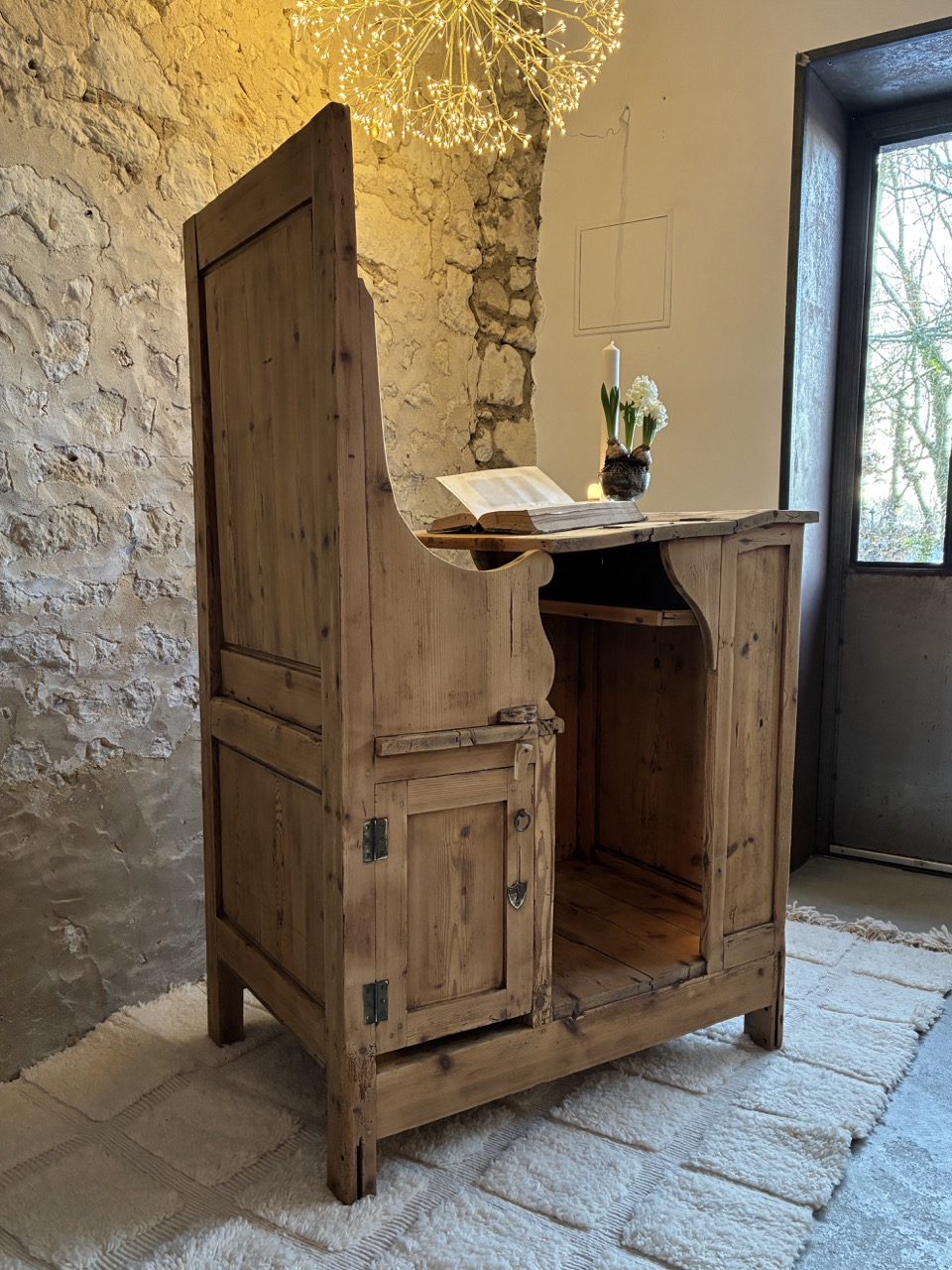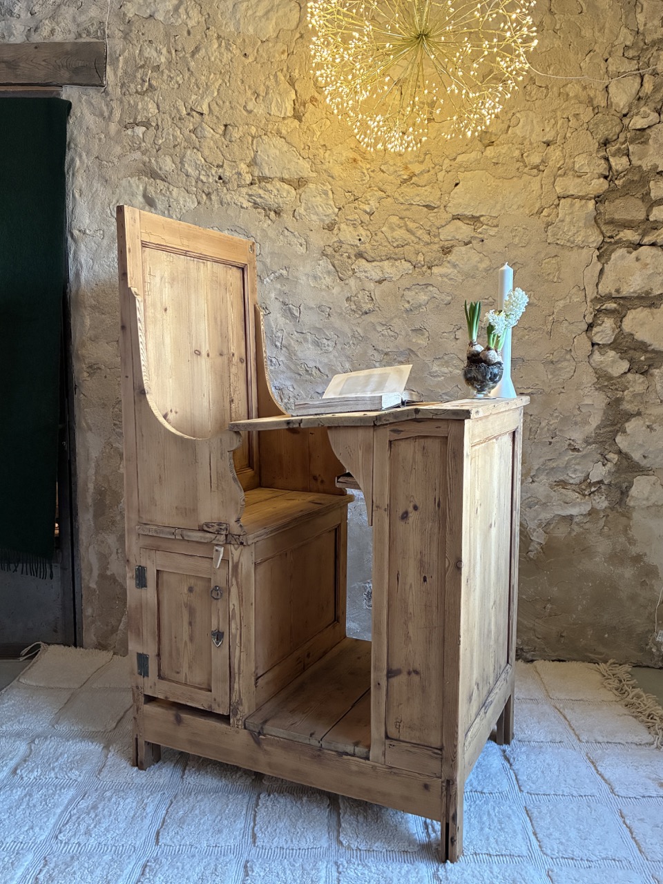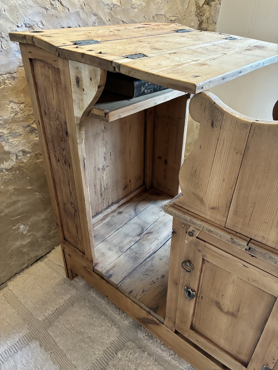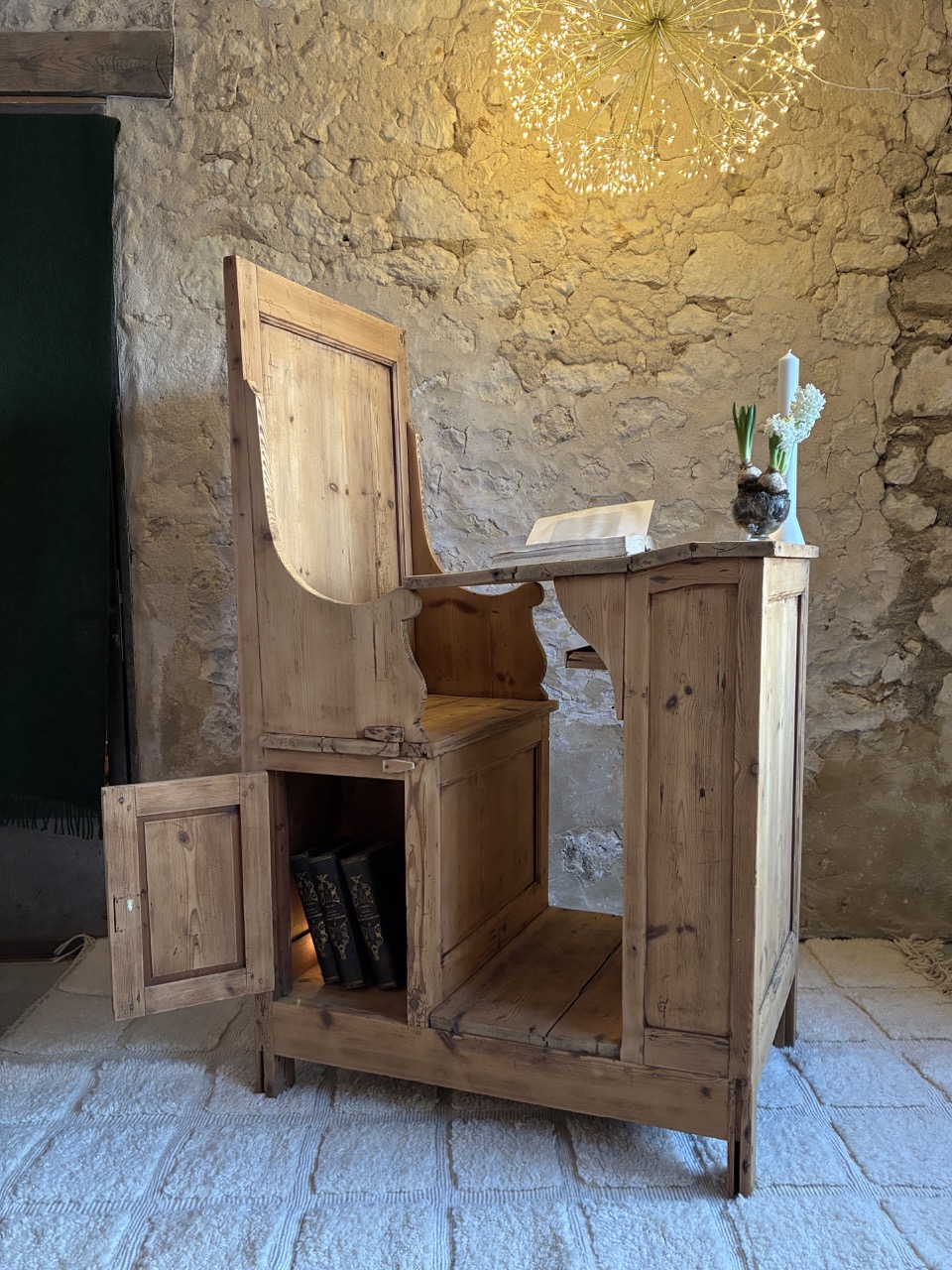 Poncée, traitée et retravaillé, elle est unique et donnera beaucoup de cachet à votre pièce. Cet écritoire religieux peut à la fois servir de bureau, mais aussi de pièce décoratives avec ses quelques rangements. À vous de l’adopter, de la détourner pour continuer son histoire. Il possède une écritoire pliable en trois parties, deux placards sous l’assise et une tablette de rangement sous l’écritoire.