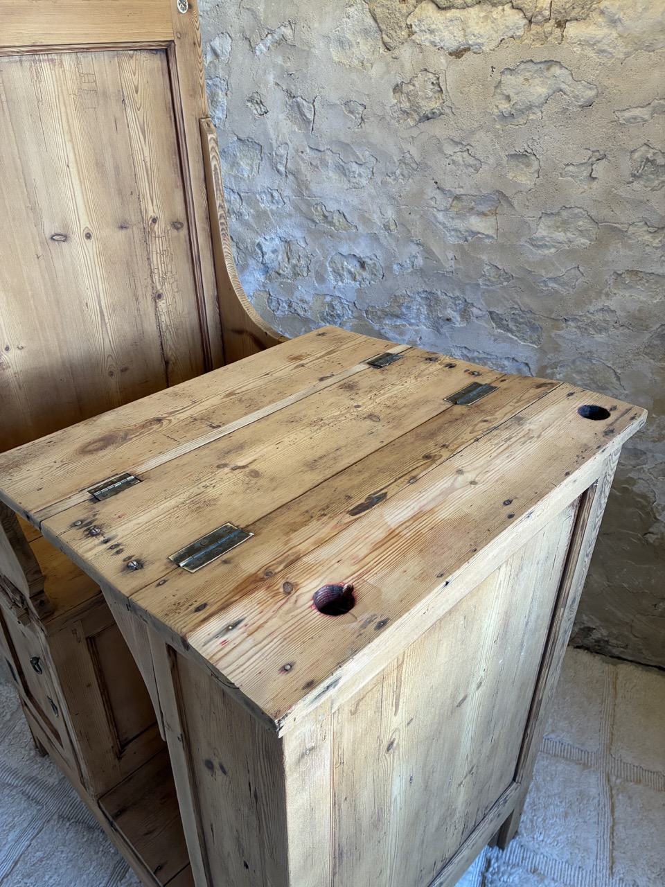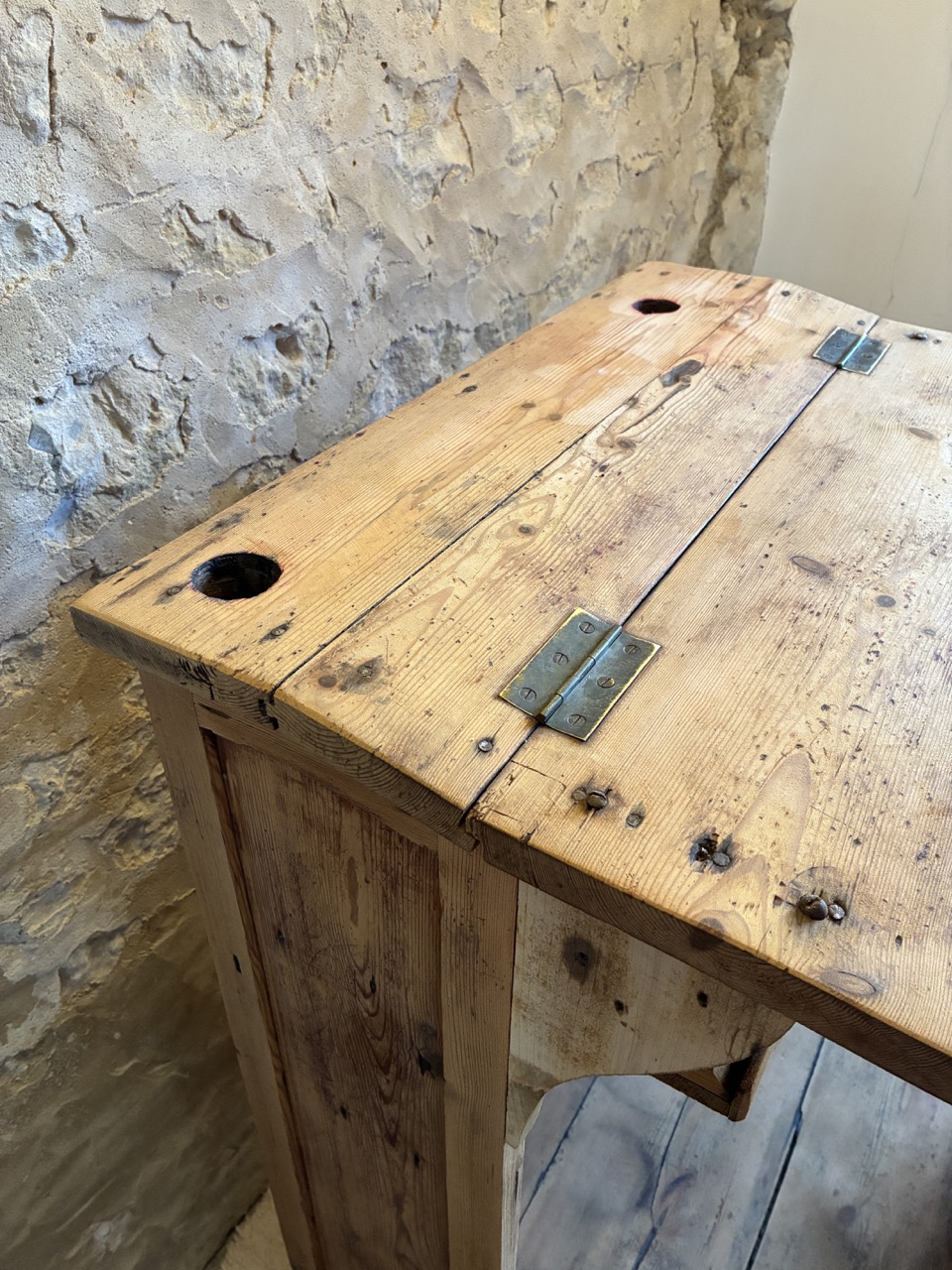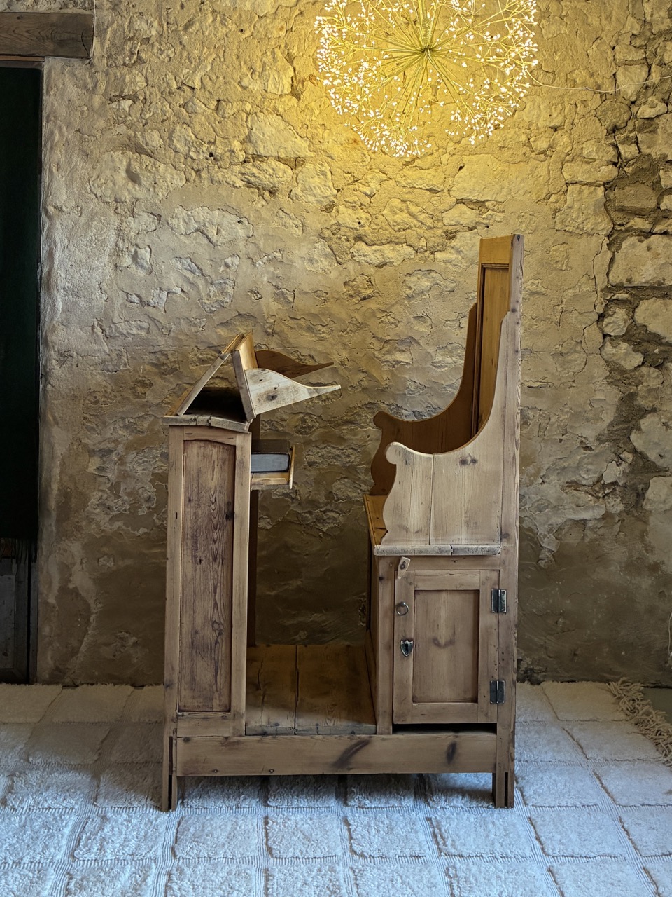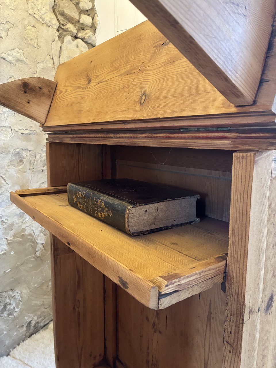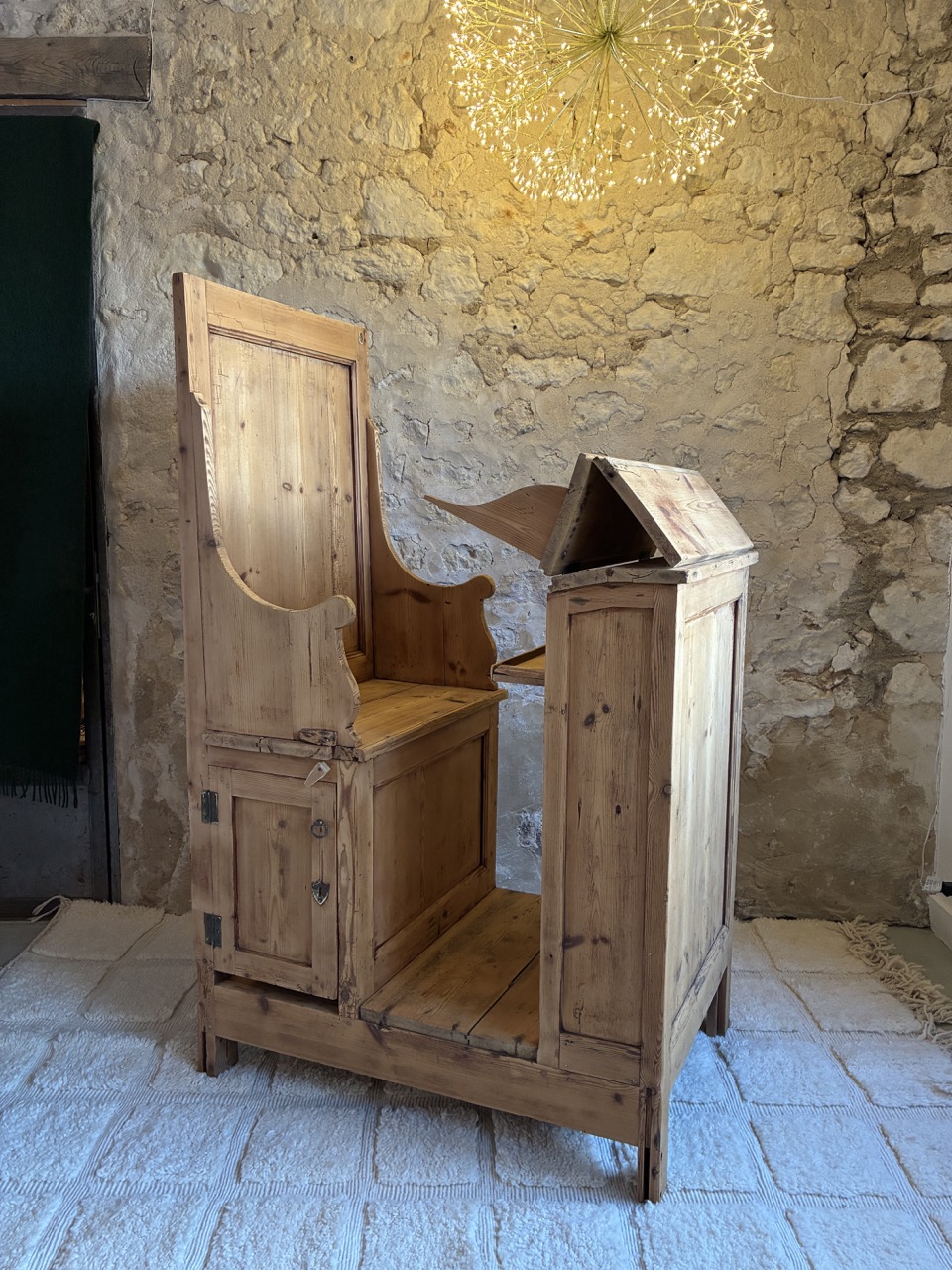 Poncée, traitée et retravaillé, elle est unique et donnera beaucoup de cachet à votre pièce. Cet écritoire religieux peut à la fois servir de bureau, mais aussi de pièce décoratives avec ses quelques rangements. À vous de l’adopter, de la détourner pour continuer son histoire. Il possède une écritoire pliable en trois parties, deux placards sous l’assise et une tablette de rangement sous l’écritoire.