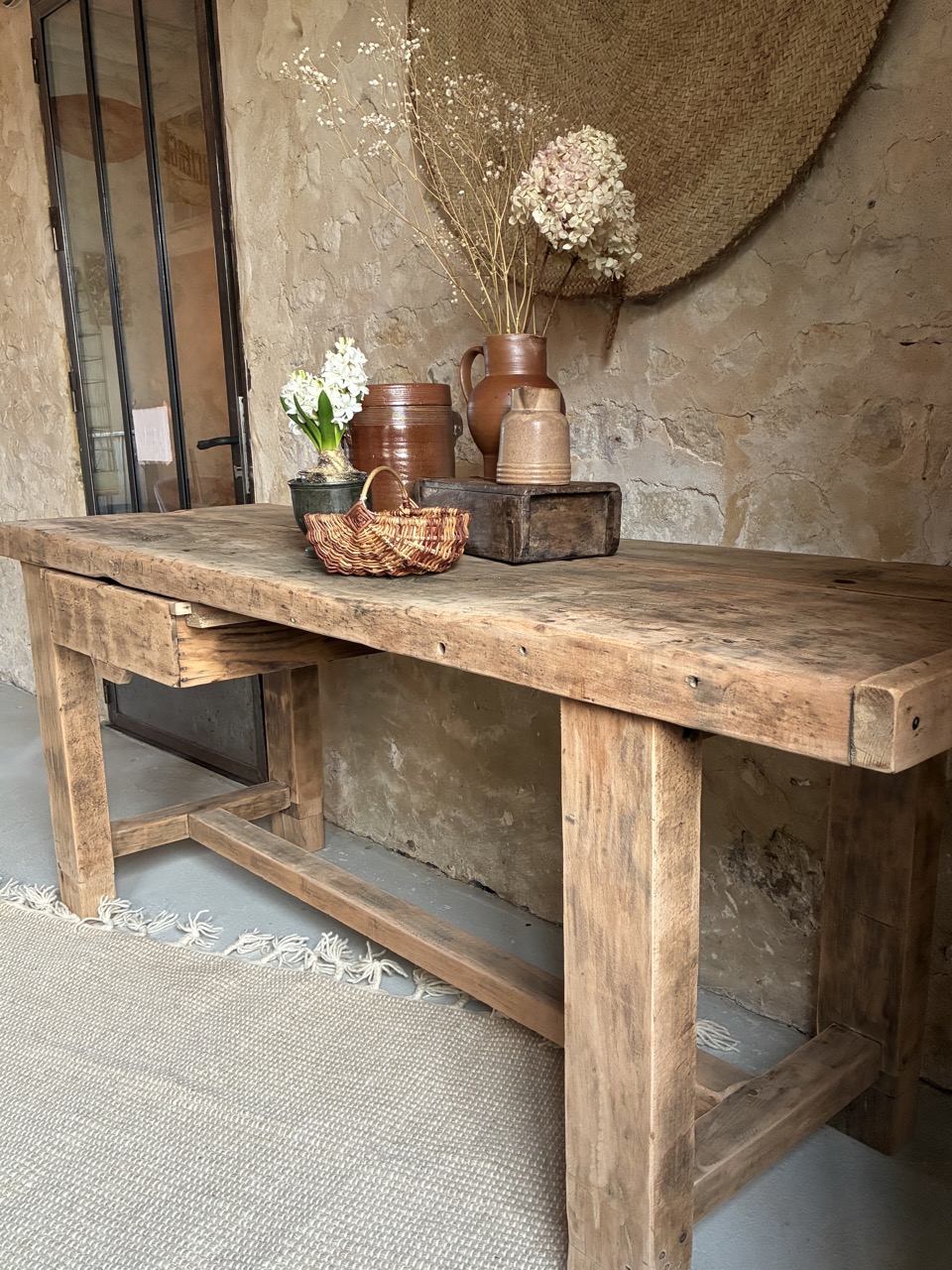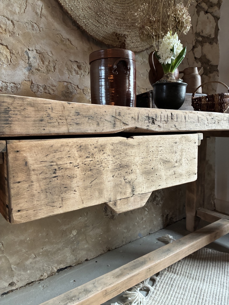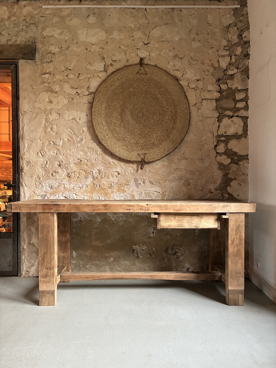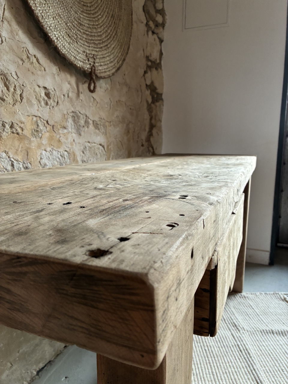 Ce très bel établi doté d’un tiroir, est parfait en console ou plan de travail dans une cuisine. On aime son bois, son plateau chargé d’histoires mais aussi son format. Ni trop profond, ni trop étroit. Pour les amoureux du brut, cette pièce maîtresse apportera du cachet au lieu qu’il habitera. La team atelier vous propose également une finition vernis mat, à préciser au moment de l’achat.