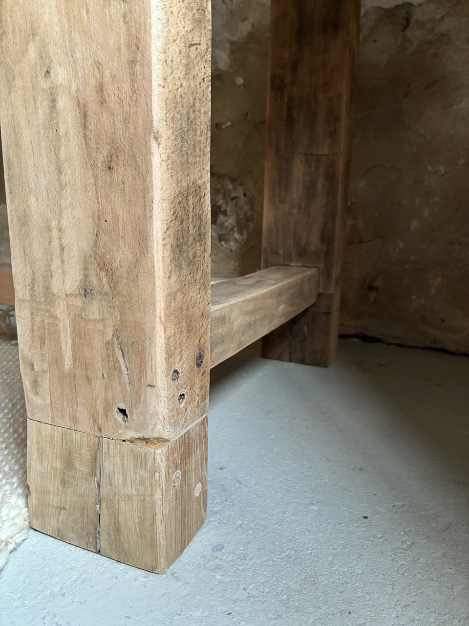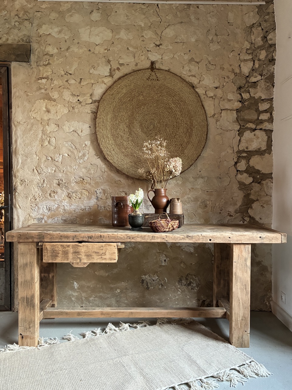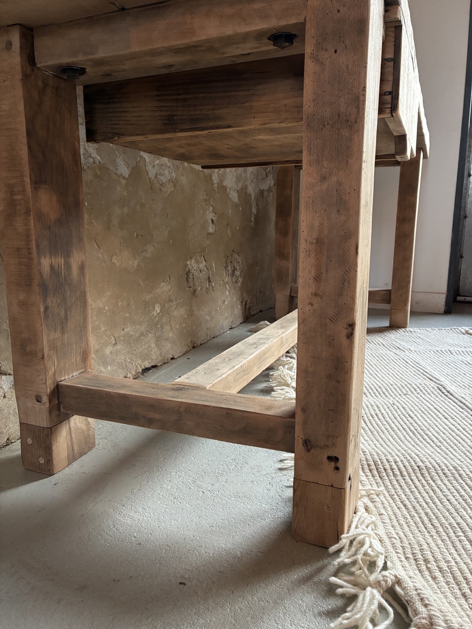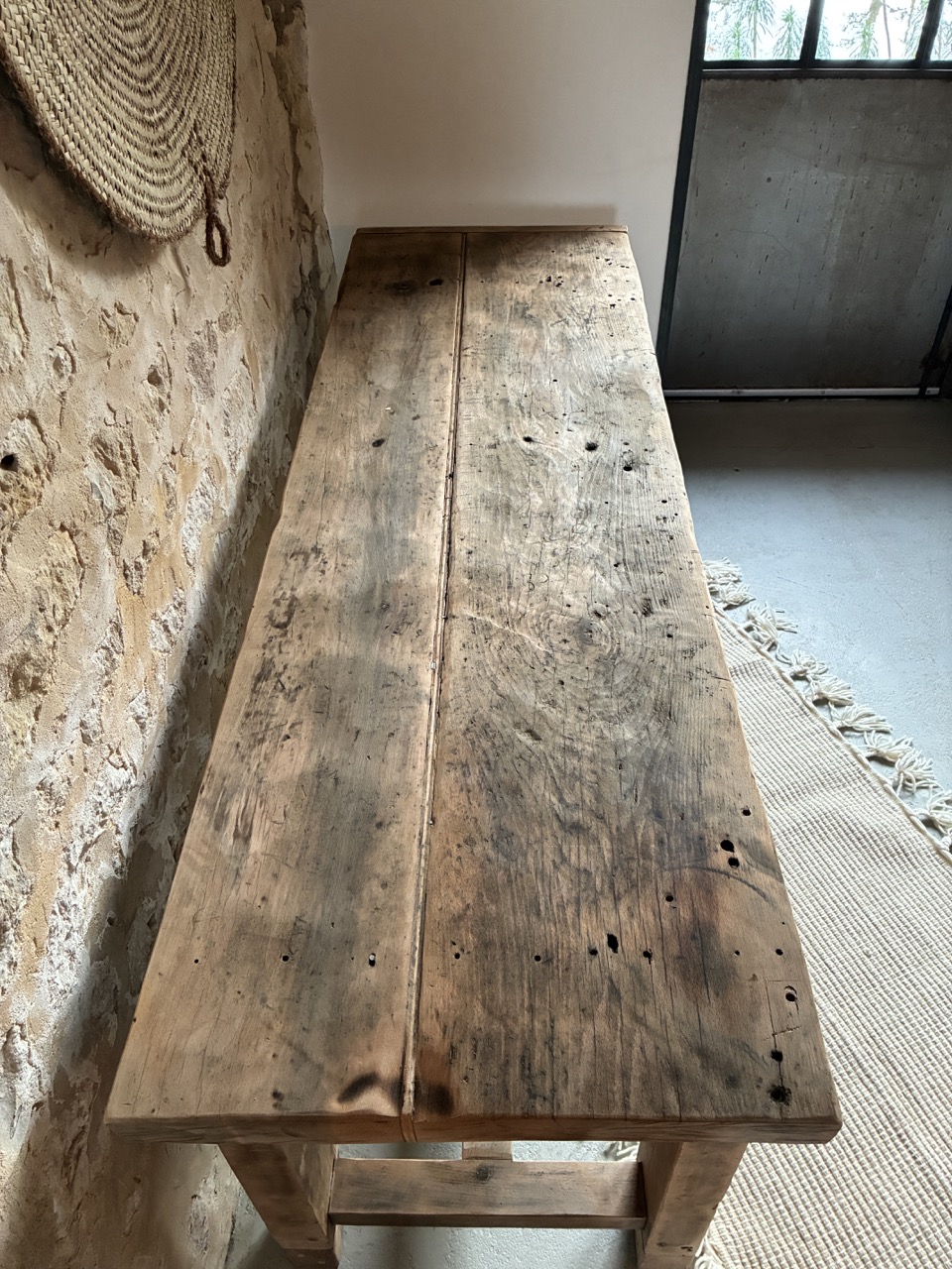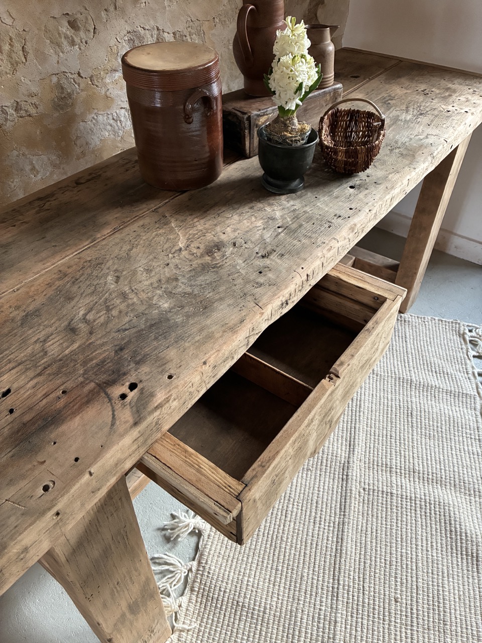 Ce très bel établi doté d’un tiroir, est parfait en console ou plan de travail dans une cuisine. On aime son bois, son plateau chargé d’histoires mais aussi son format. Ni trop profond, ni trop étroit. Pour les amoureux du brut, cette pièce maîtresse apportera du cachet au lieu qu’il habitera. La team atelier vous propose également une finition vernis mat, à préciser au moment de l’achat.