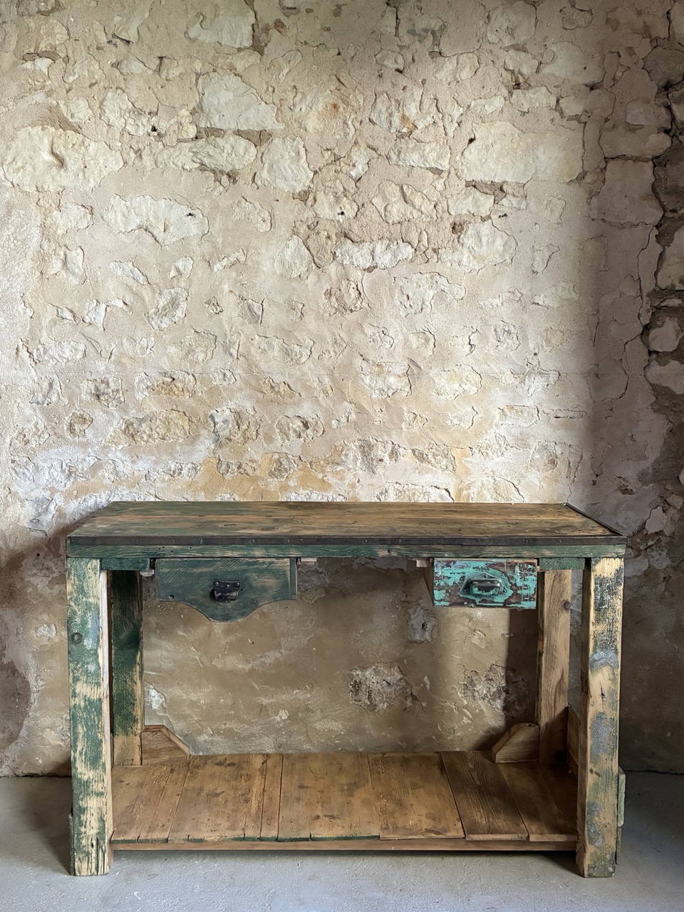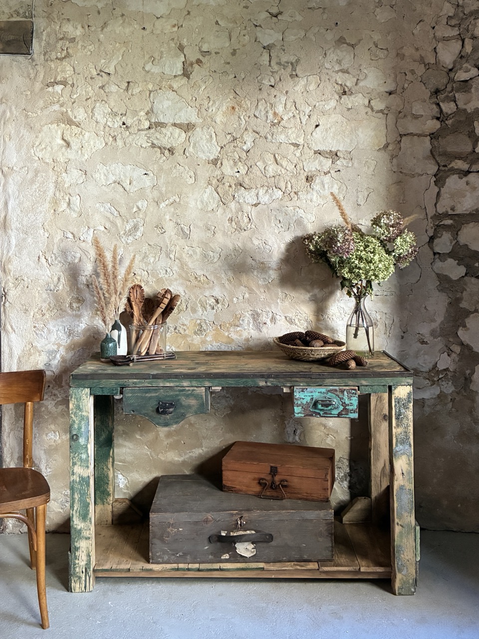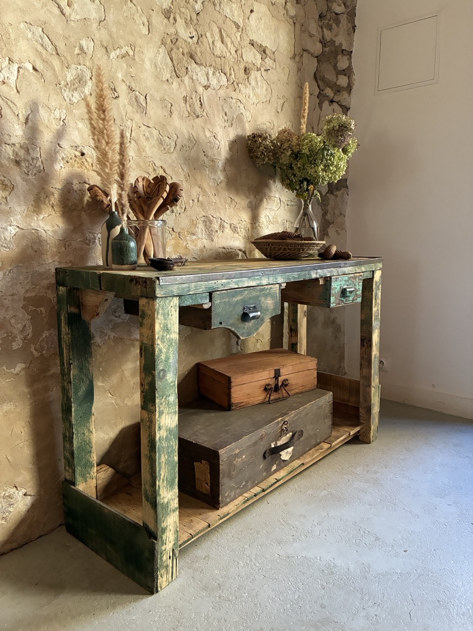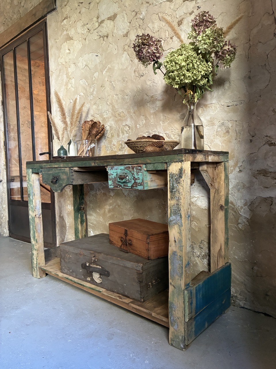 Quel trouvaille ! L’équipe s’est occupé de cet établi qui peut être détourné et habiller de nombreuses pièces de la maison. Hyper fonctionnel avec son étagère et ses 2 grands tiroirs, donnez une touche de couleur avec cette belle pièce authentique au liseret en métal.