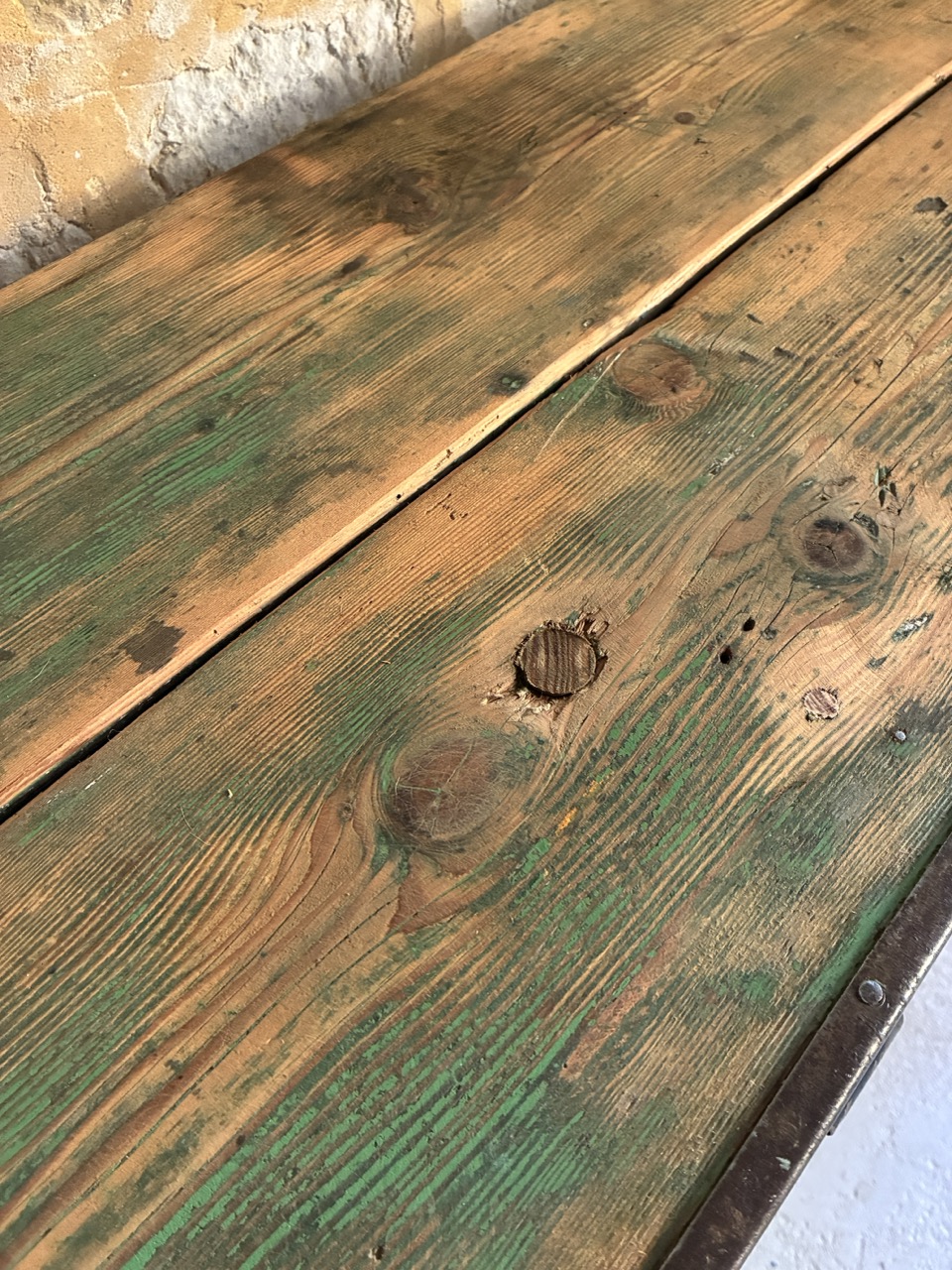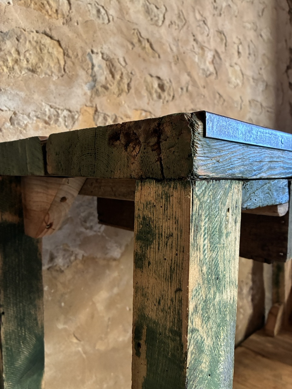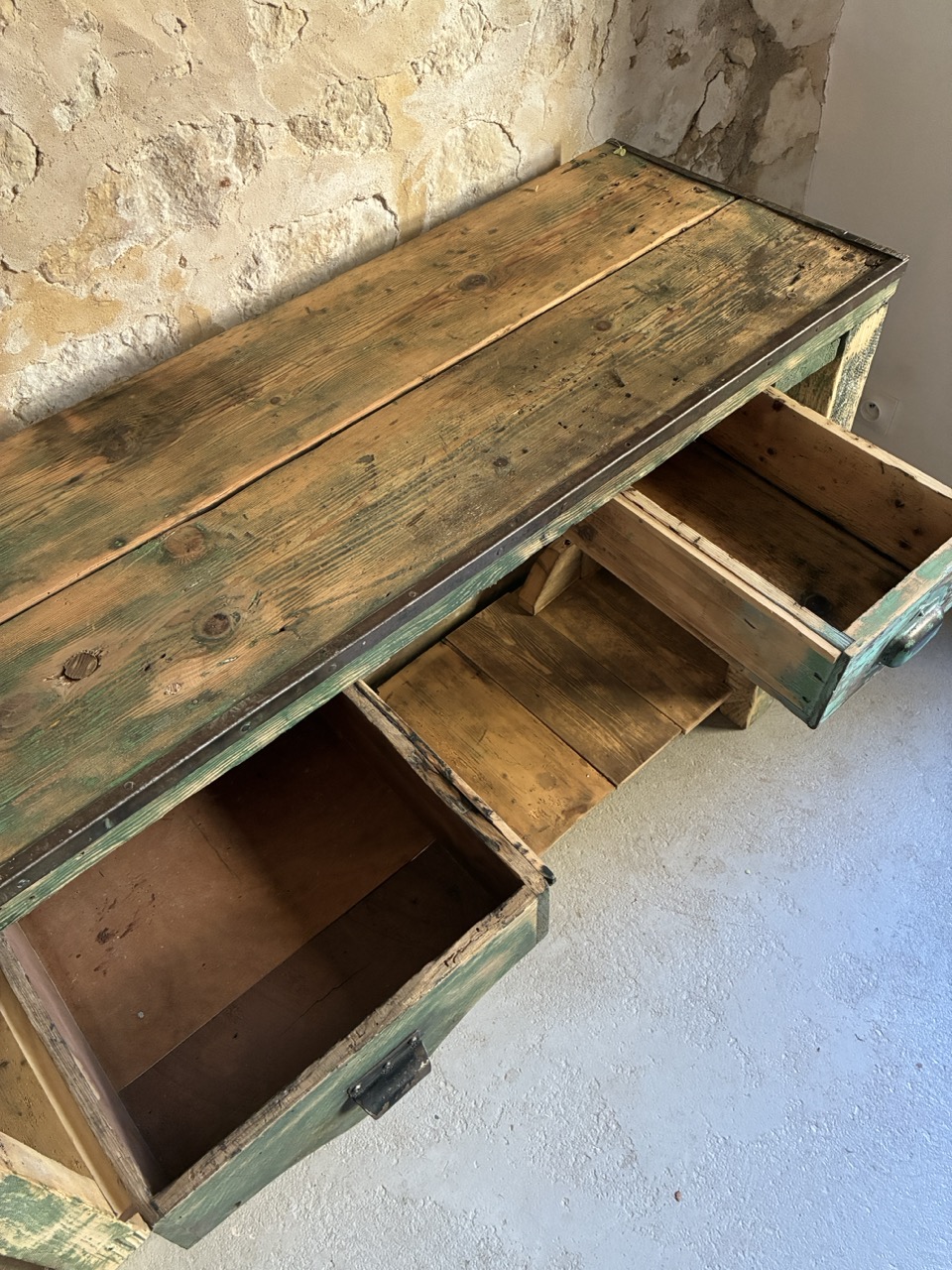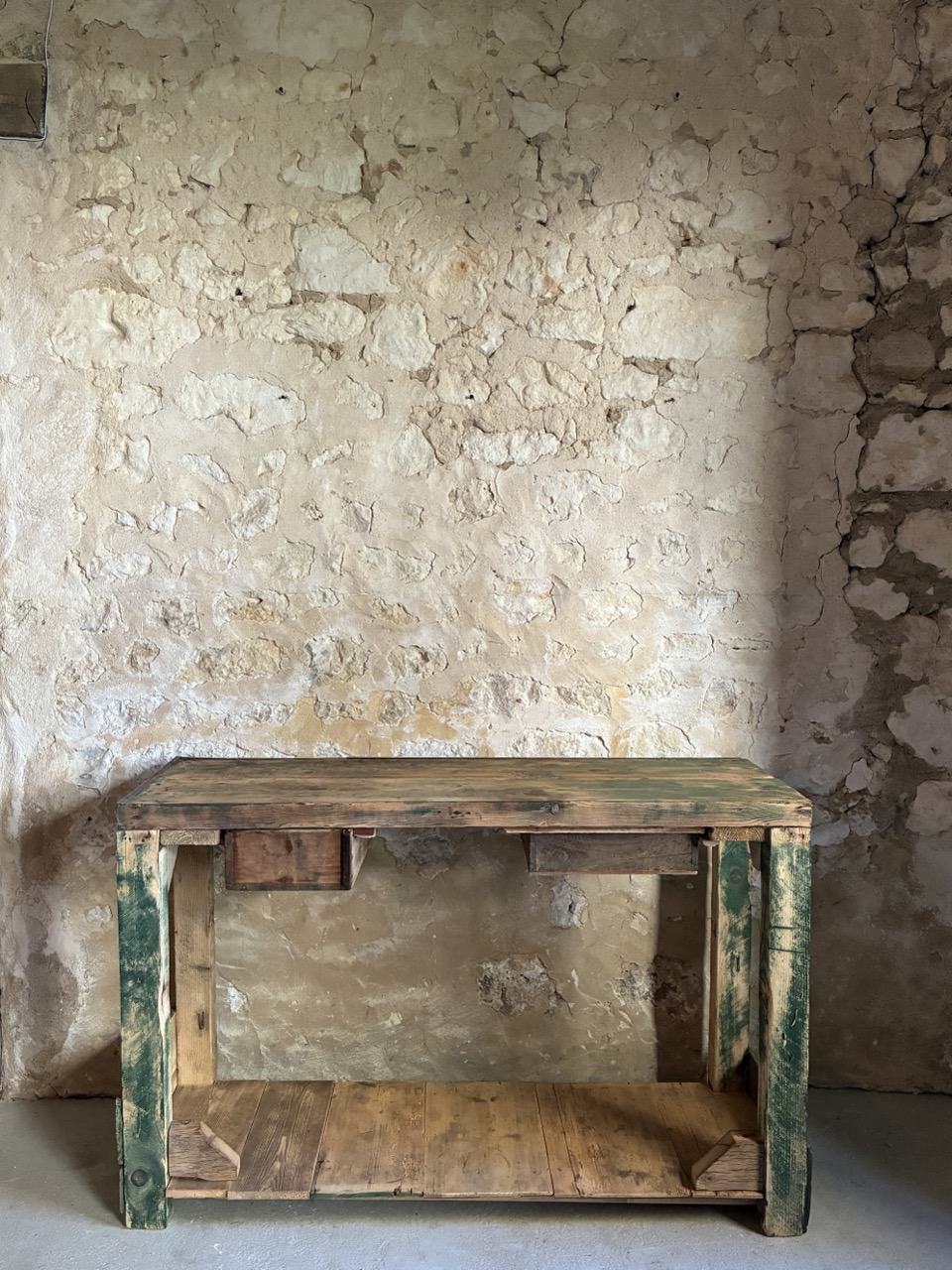 Quel trouvaille ! L’équipe s’est occupé de cet établi qui peut être détourné et habiller de nombreuses pièces de la maison. Hyper fonctionnel avec son étagère et ses 2 grands tiroirs, donnez une touche de couleur avec cette belle pièce authentique au liseret en métal.