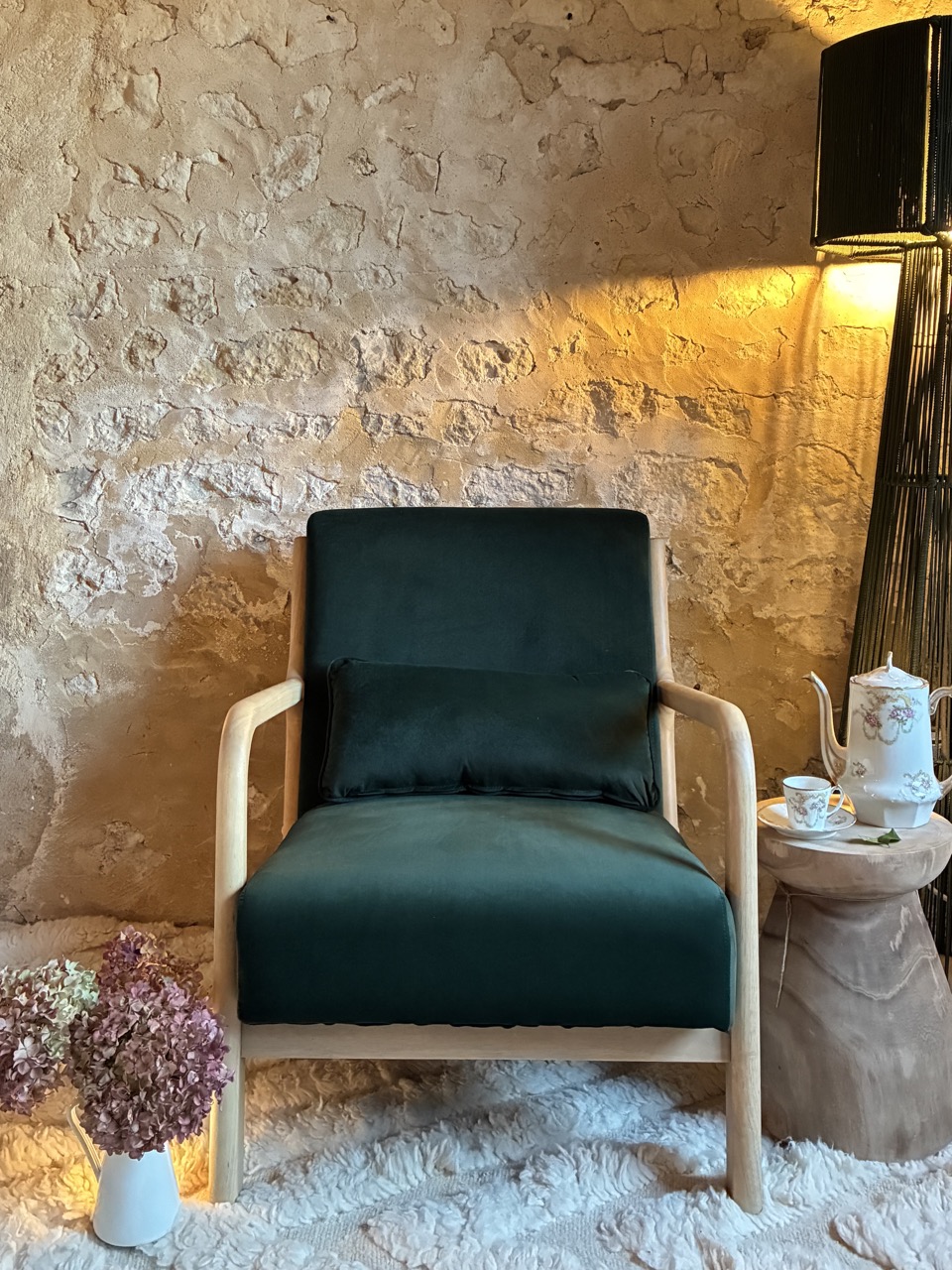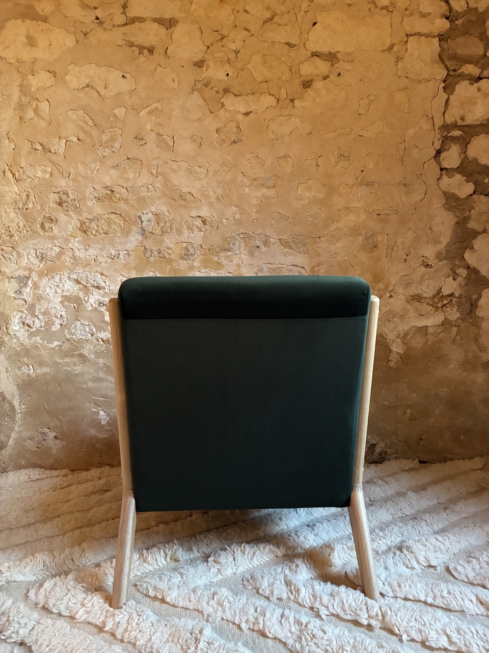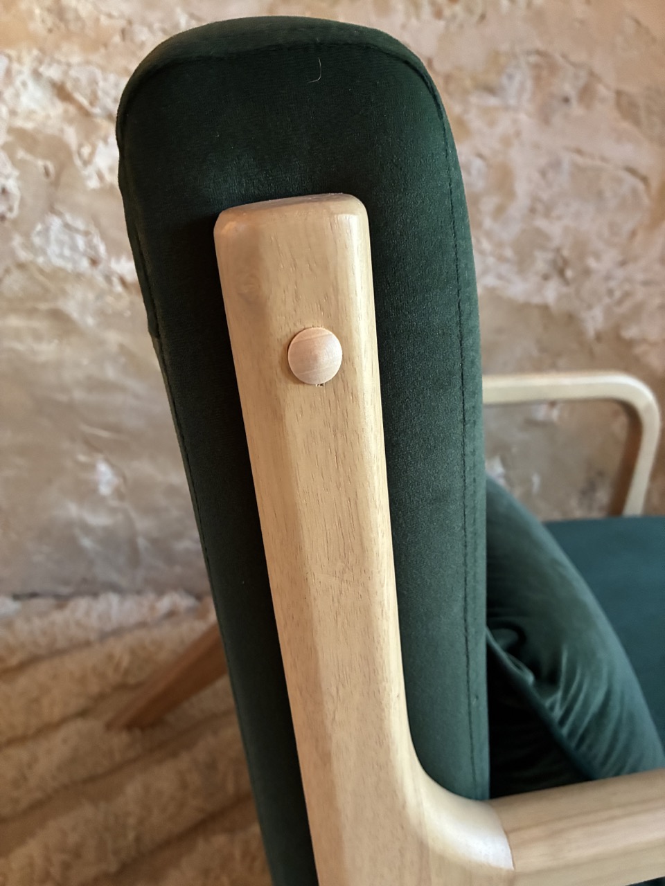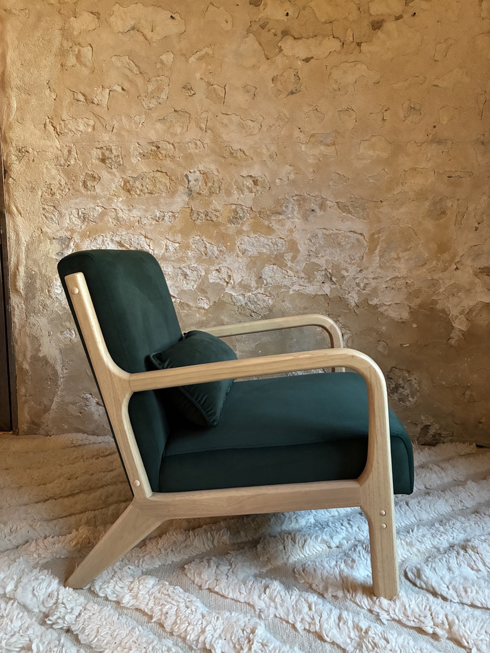 Alliez le design à l’élégance avec ce fauteuil en velours ras, vert foncé, et son piétement en bois clair.