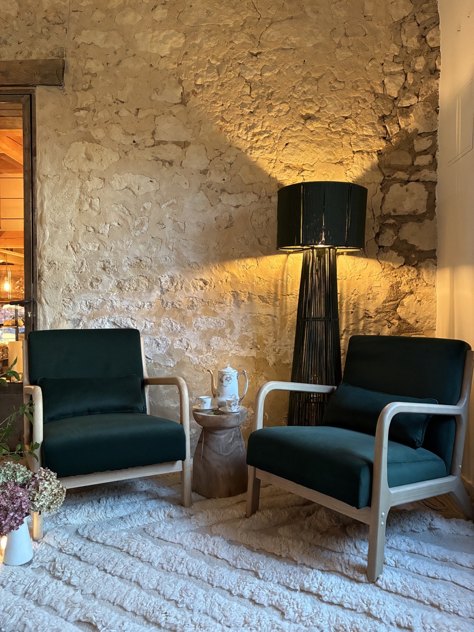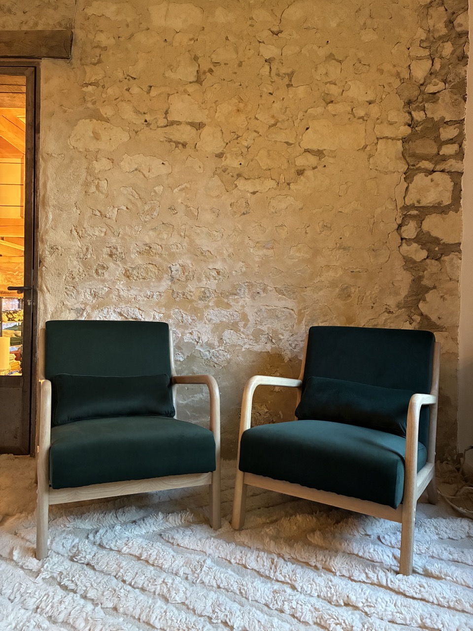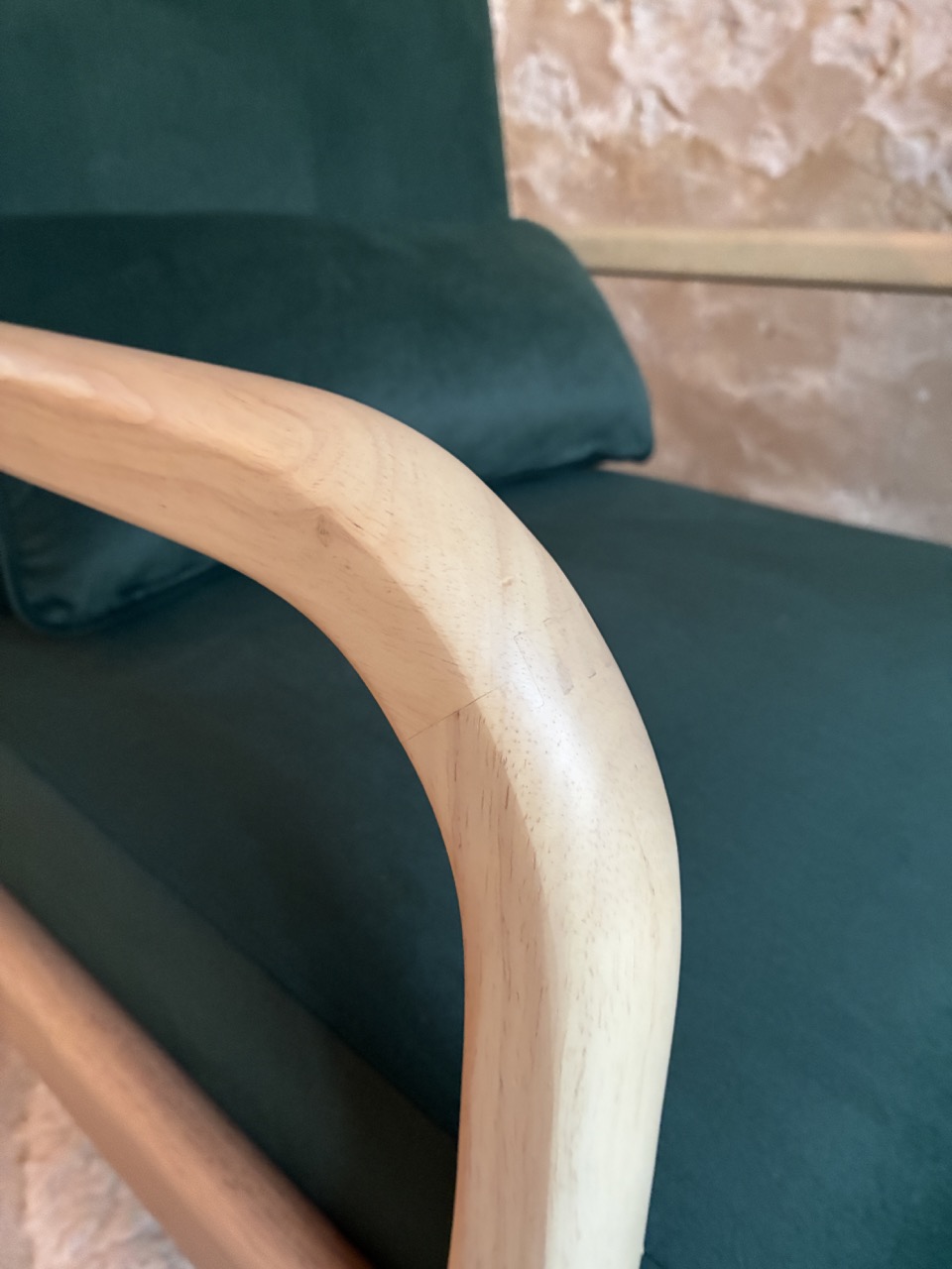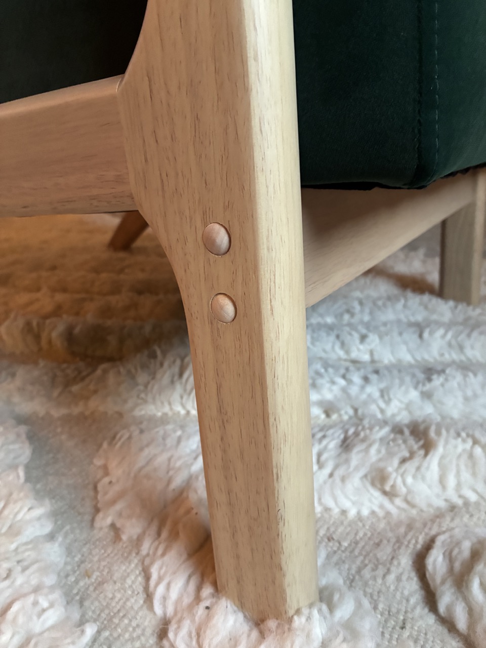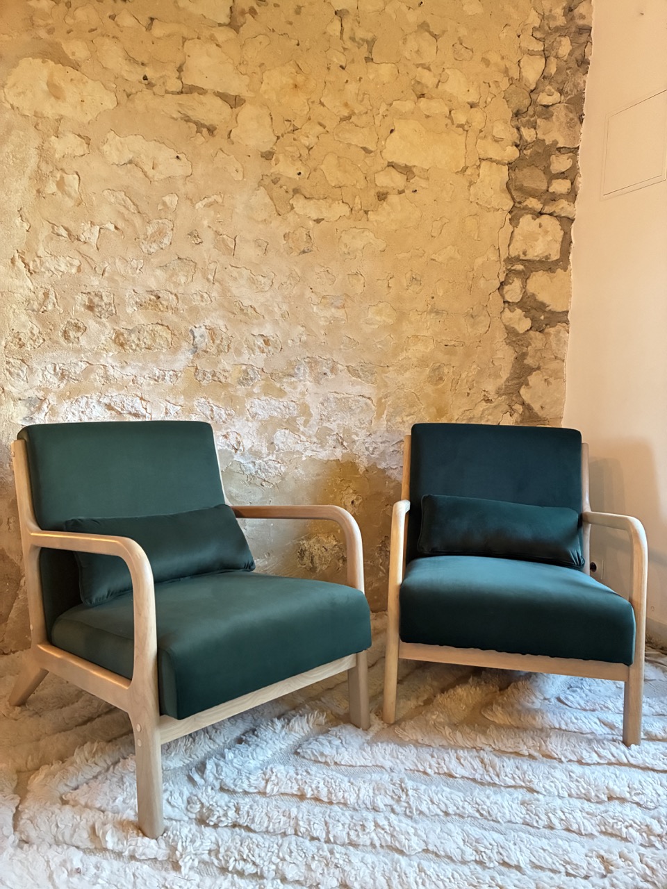 Alliez le design à l’élégance avec ce fauteuil en velours ras, vert foncé, et son piétement en bois clair.