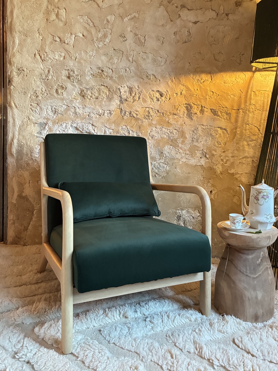 Ce fauteuil est une véritable pièce de déco ! Alliez le design à l’élégance avec ce fauteuil en velours ras, vert foncé, et son piétement en bois clair. Sa couleur soyeuse apportera du pep’s à votre intérieur. On adore ce contraste entre son tissu vert et son piétement en bois clair. Assise et dossier, généreusement rembourrés, apportent un confort total. Vendu avec un coussin assorti.