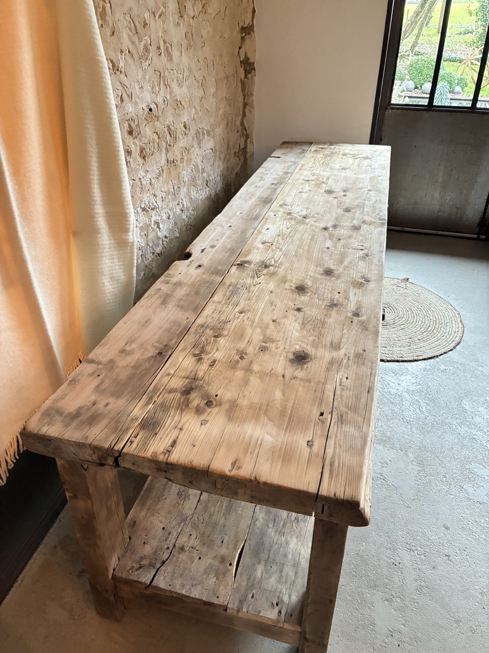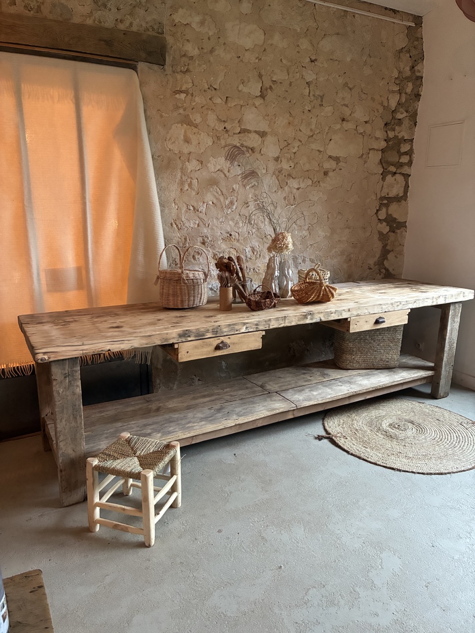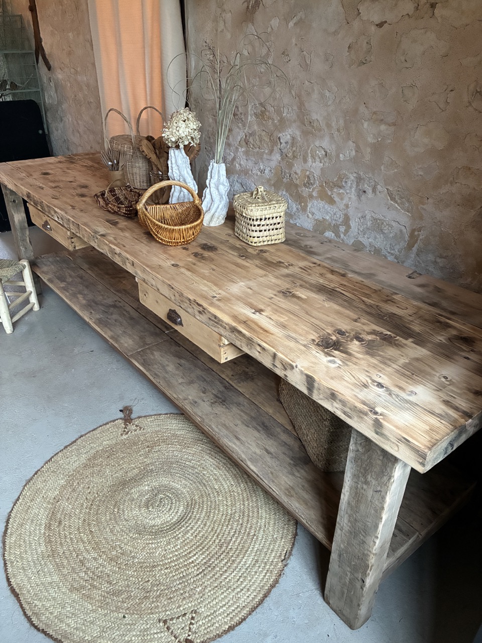 Ne passez pas à coté de cet incroyable établi aux dimensions XXL ! Rico à entièrement rénové cette pièce unique constituée de 2 tiroirs et une grande étagère basse. Il peut servir de console ou d’îlot central !