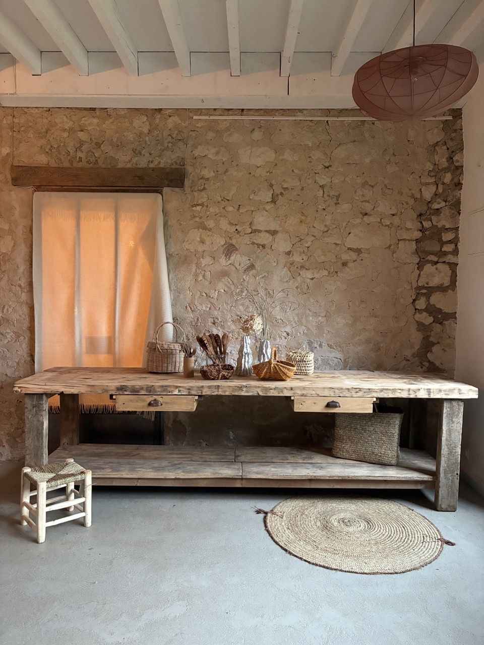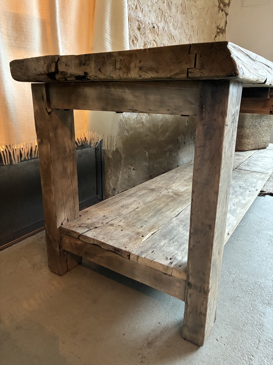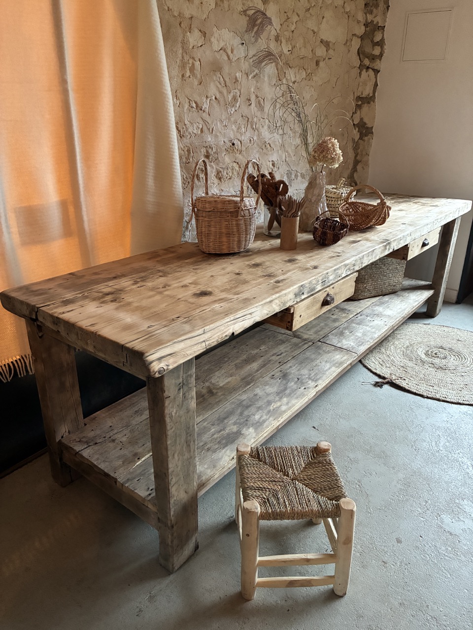 Ne passez pas à coté de cet incroyable établi aux dimensions XXL ! Rico à entièrement rénové cette pièce unique constituée de 2 tiroirs et une grande étagère basse. Il peut servir de console ou d’îlot central !