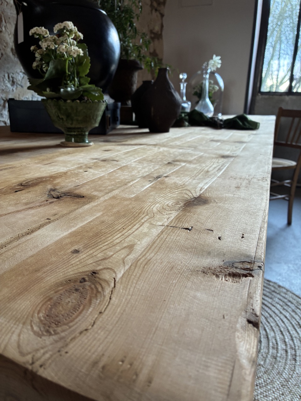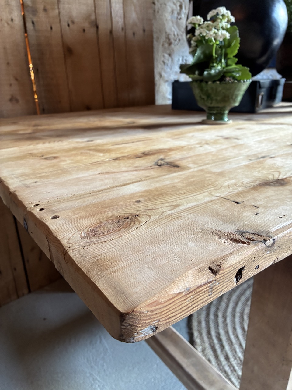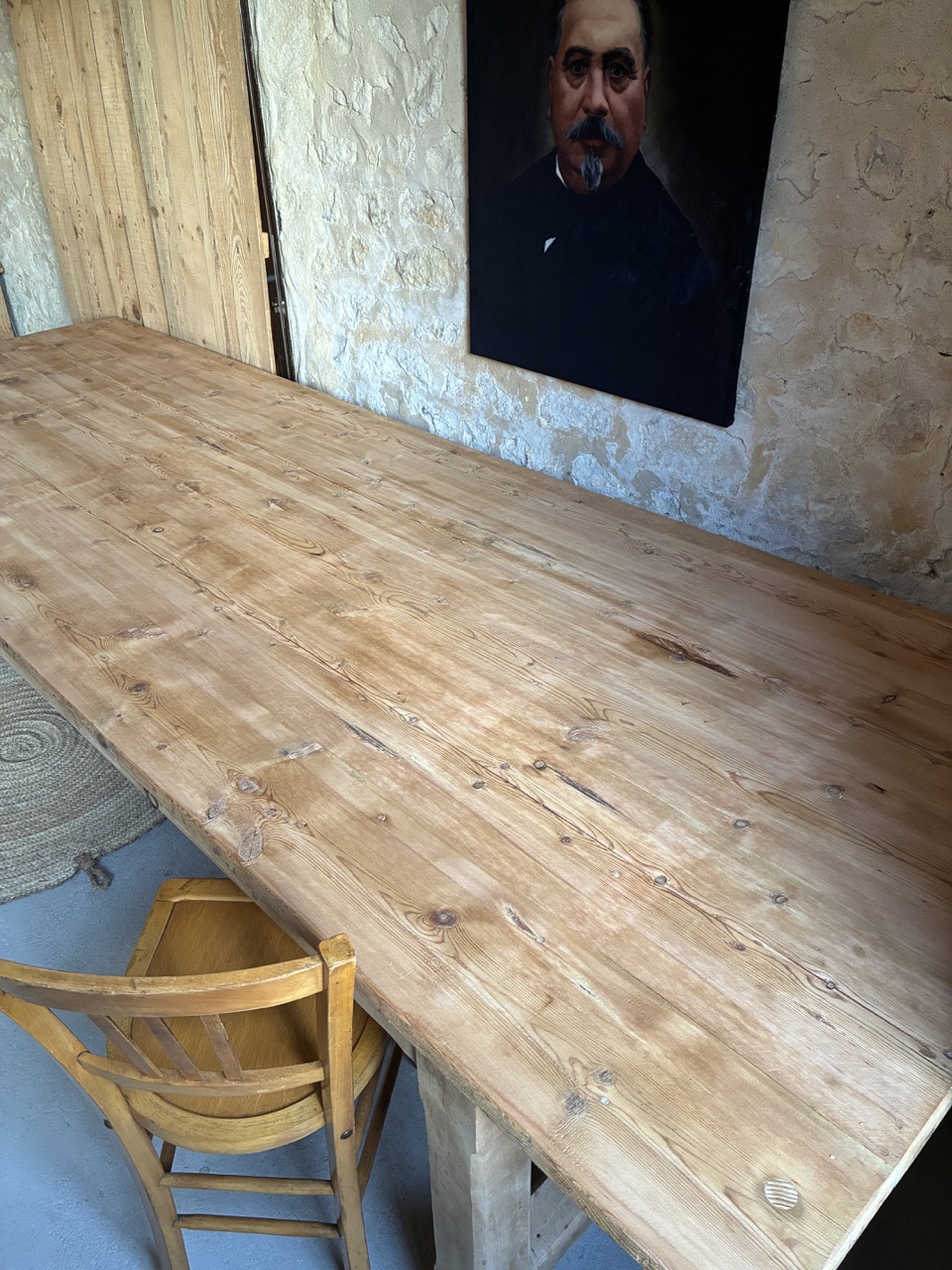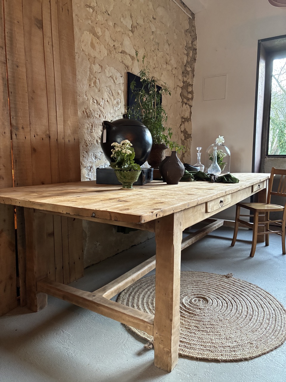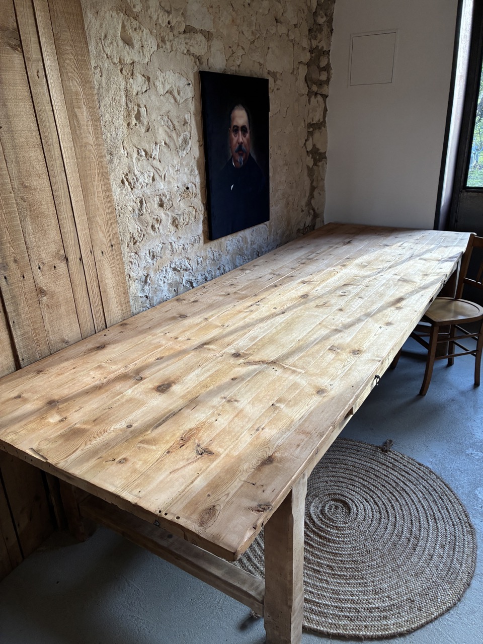 Voici une très grande table de 3m de long, parfaite pour les grandes réceptions en famille ou entre amis. Elle possède deux tiroirs, idéals pour y ranger quelques couverts. Son bois brut accentuera une décoration « campagne chic » et contrastera avec une décoration plus moderne. Elle est imposante et on l’adore !