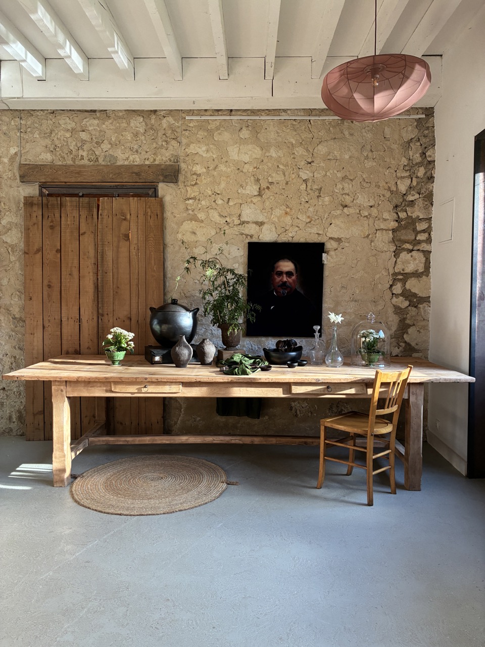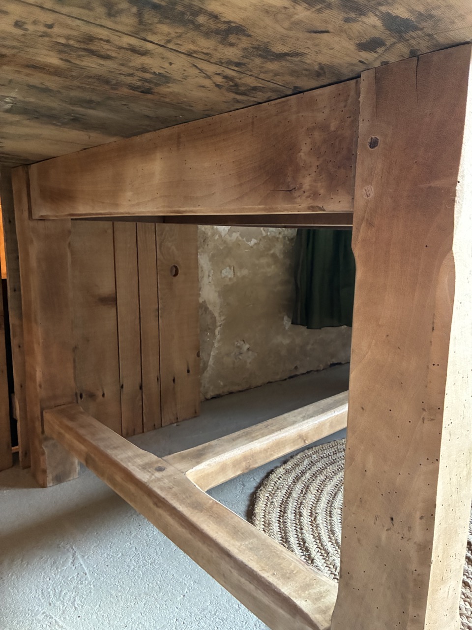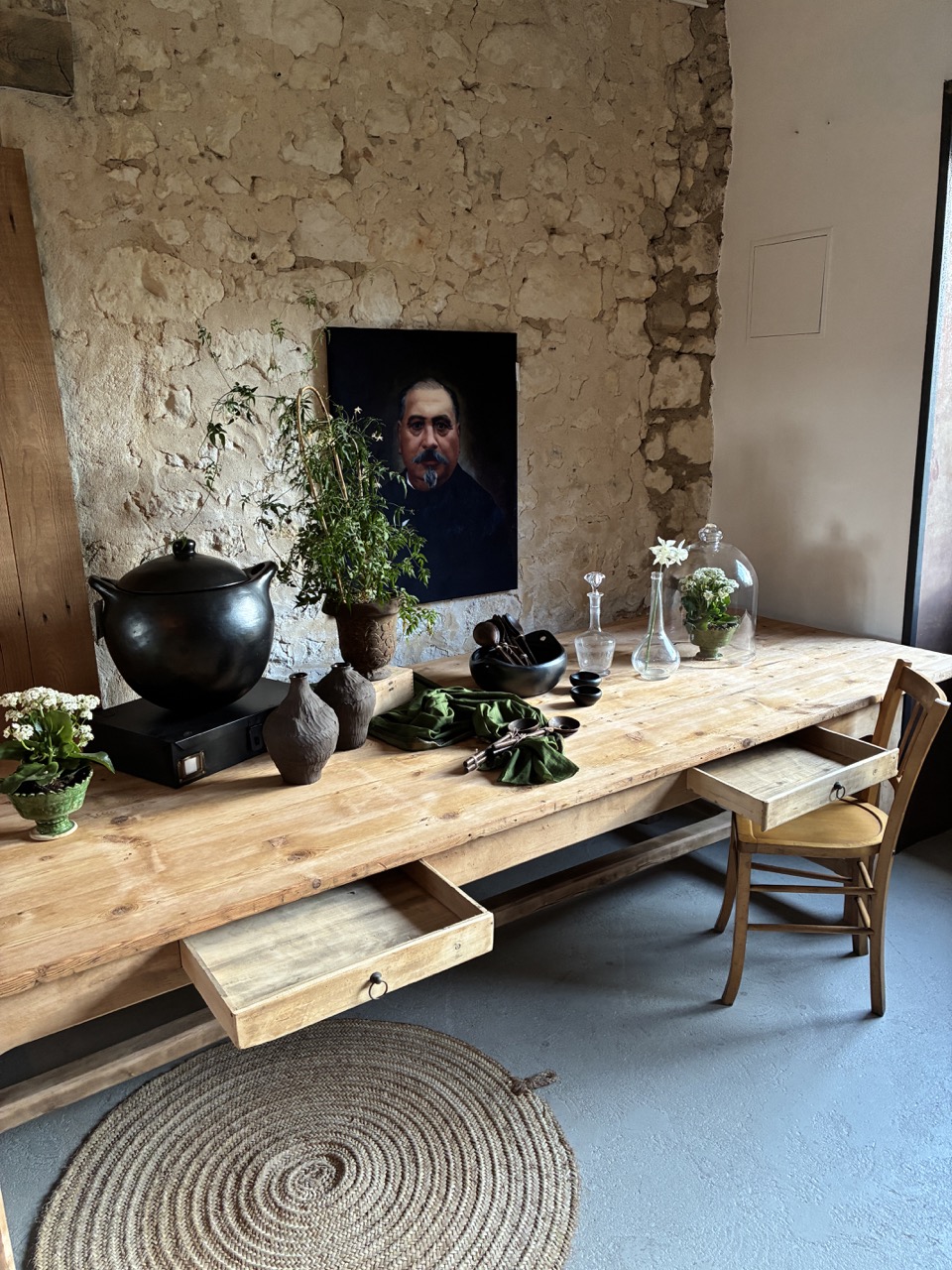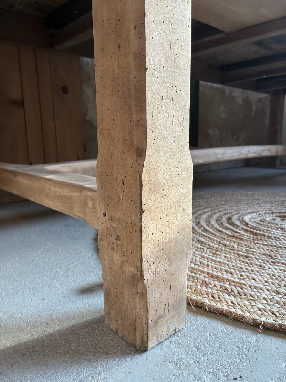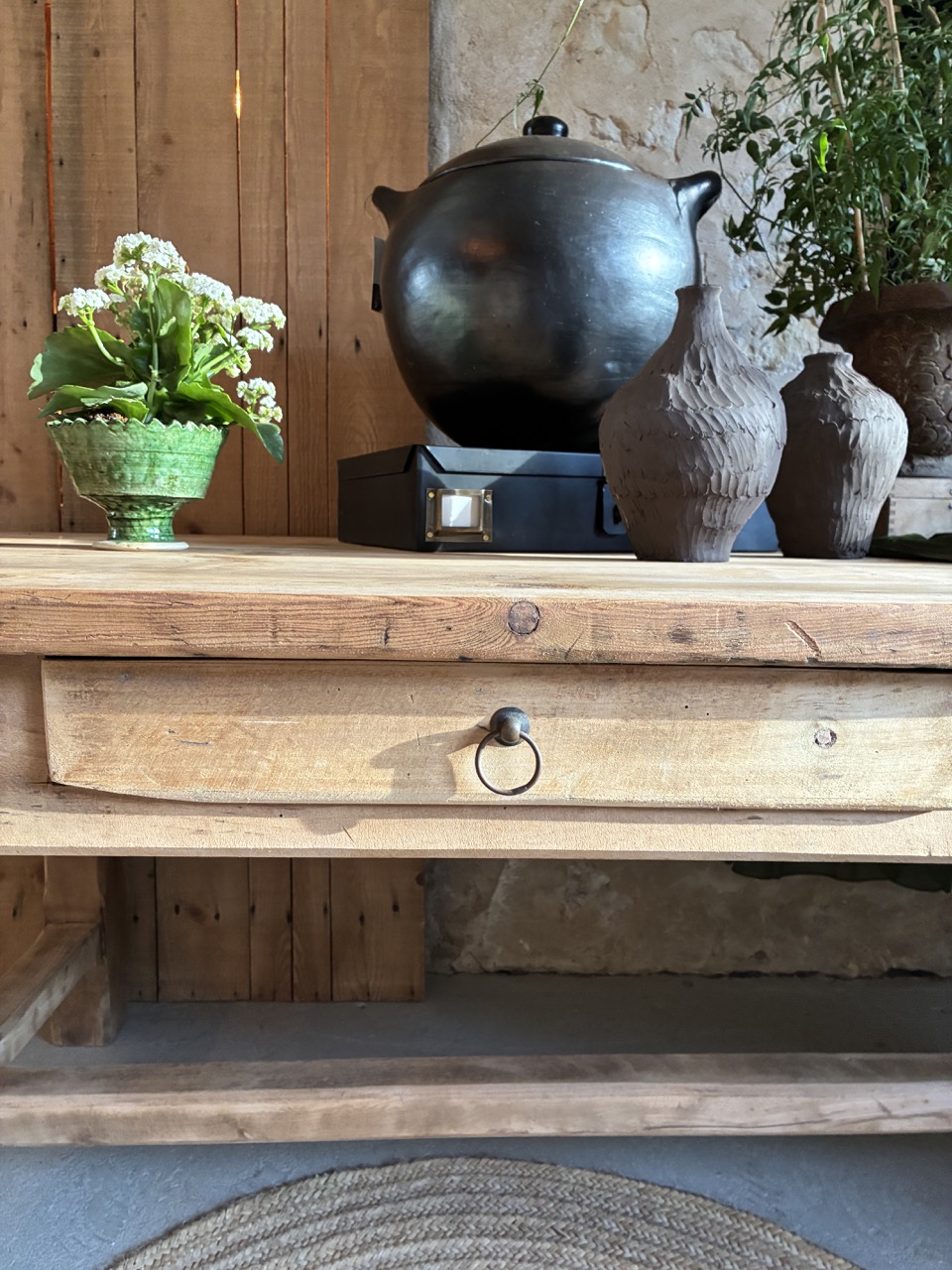Voici une très grande table de 3m de long, parfaite pour les grandes réceptions en famille ou entre amis. Elle possède deux tiroirs, idéals pour y ranger quelques couverts. Son bois brut accentuera une décoration « campagne chic » et contrastera avec une décoration plus moderne. Elle est imposante et on l’adore !