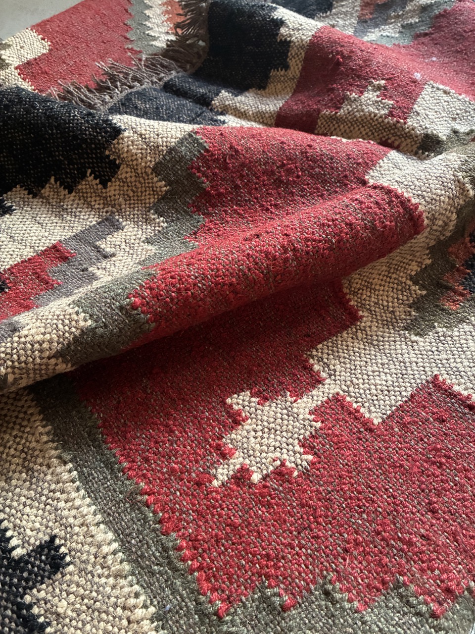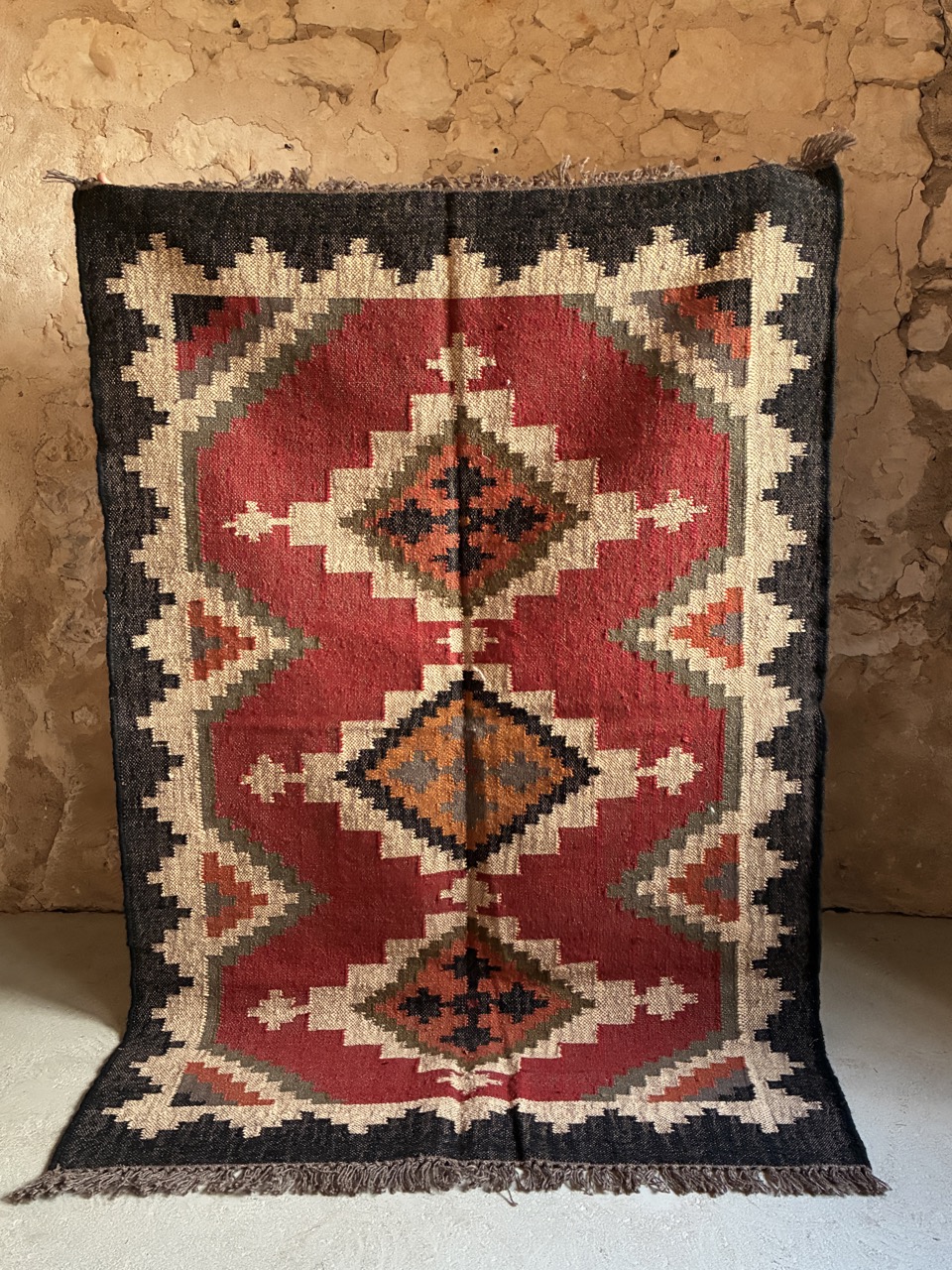 Tapis Kilim Indien. Dominante rouge, noire et beige.