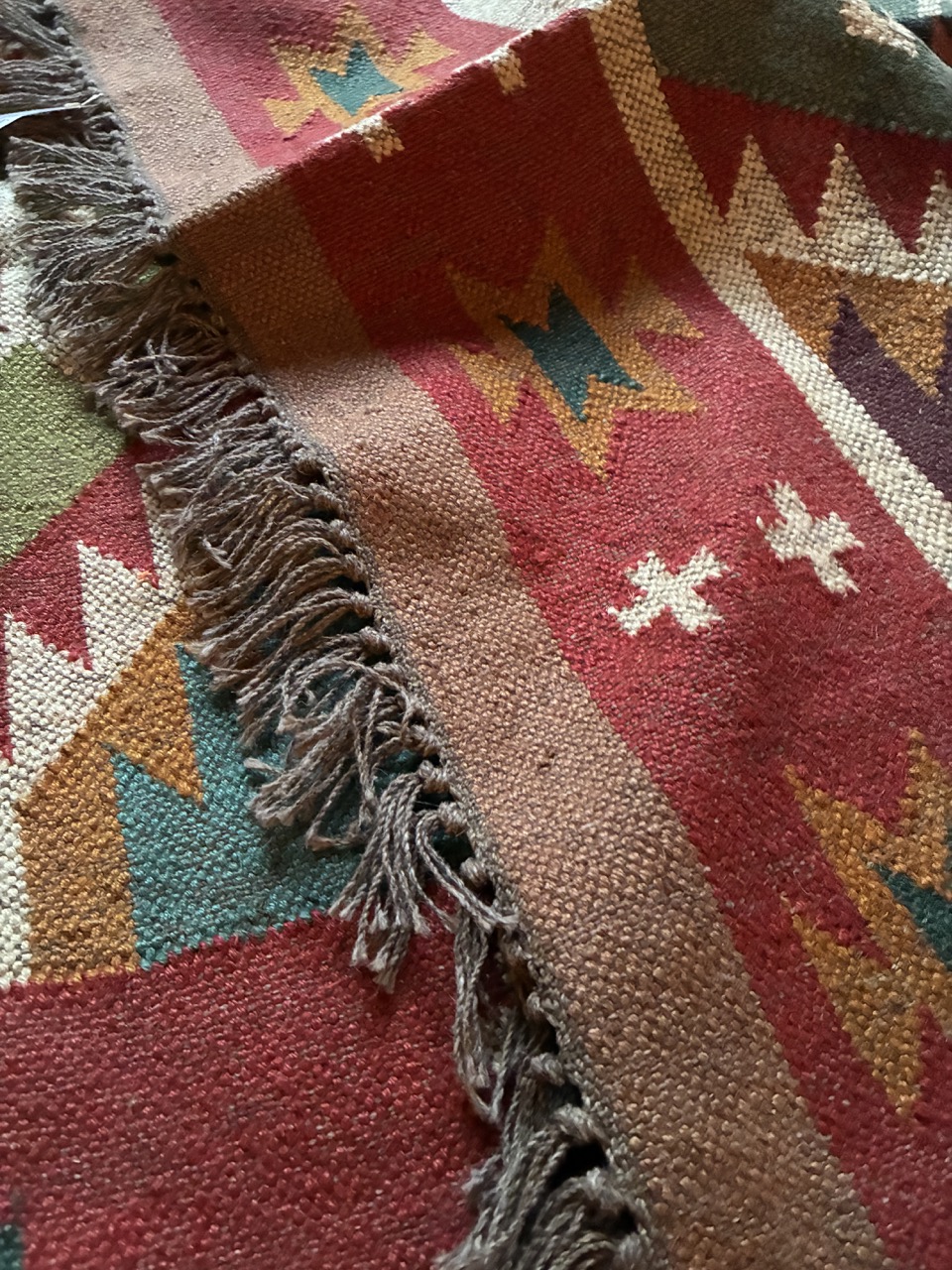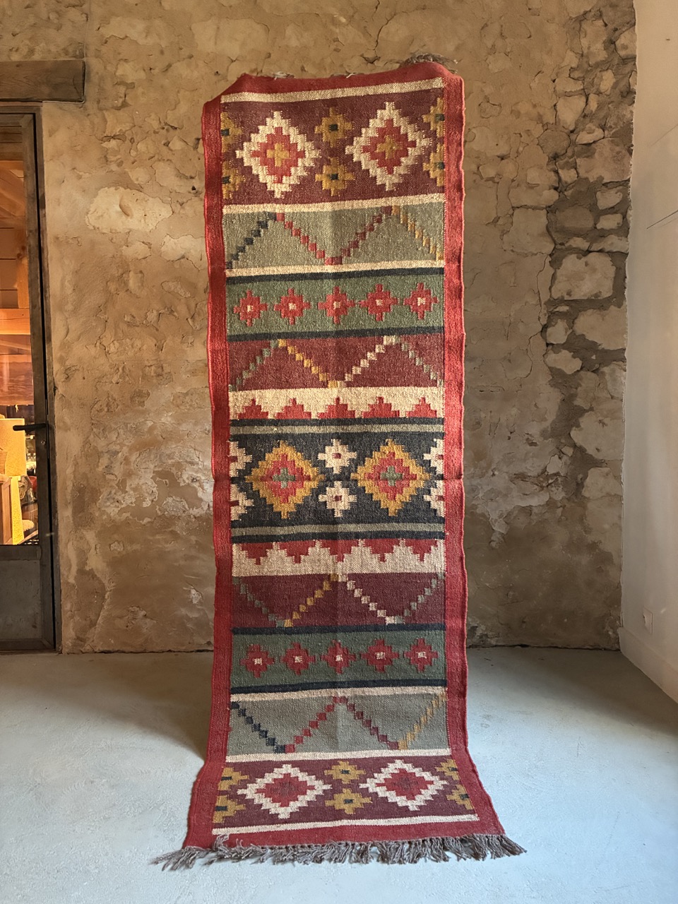 Tapis Kilim Indien. Dominante rouge, touches de vert, orange, beige et noir.