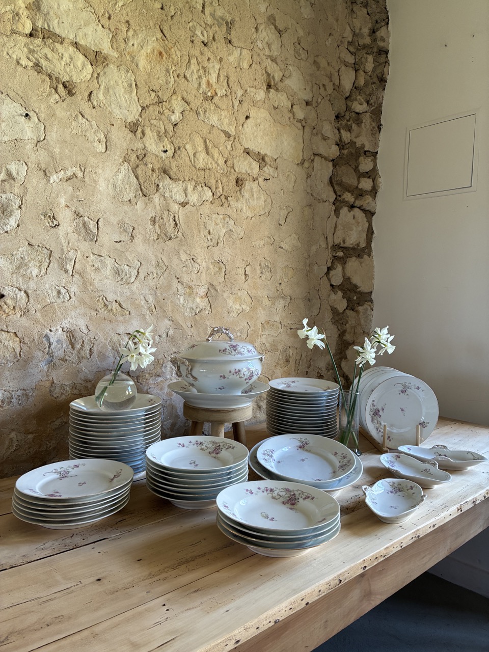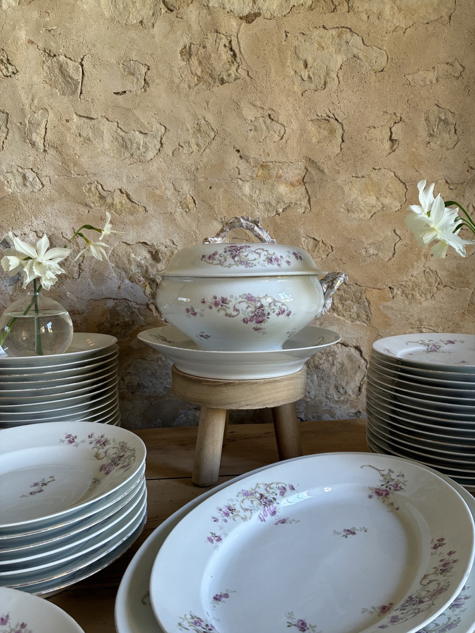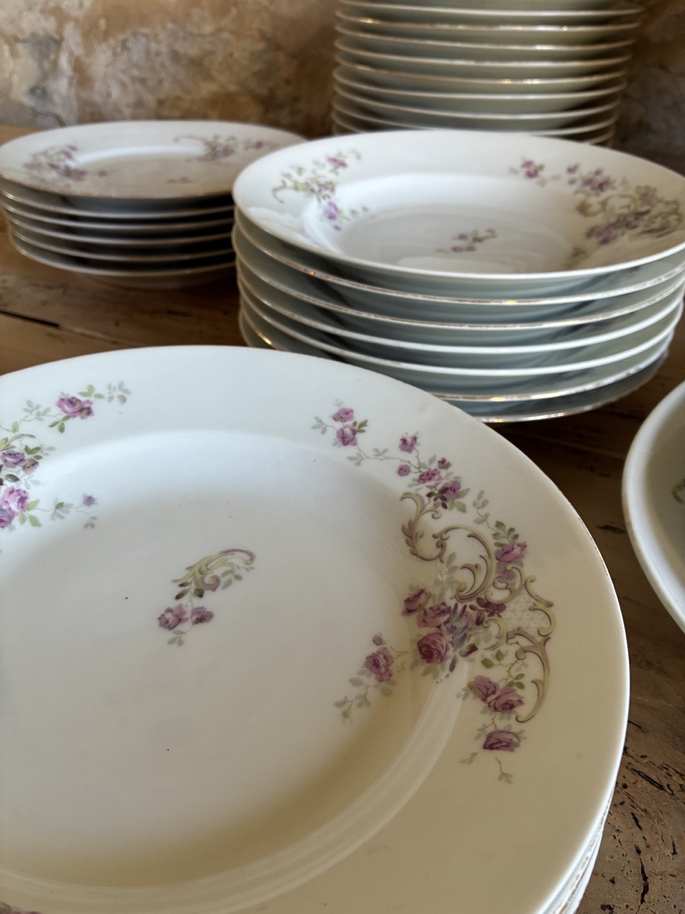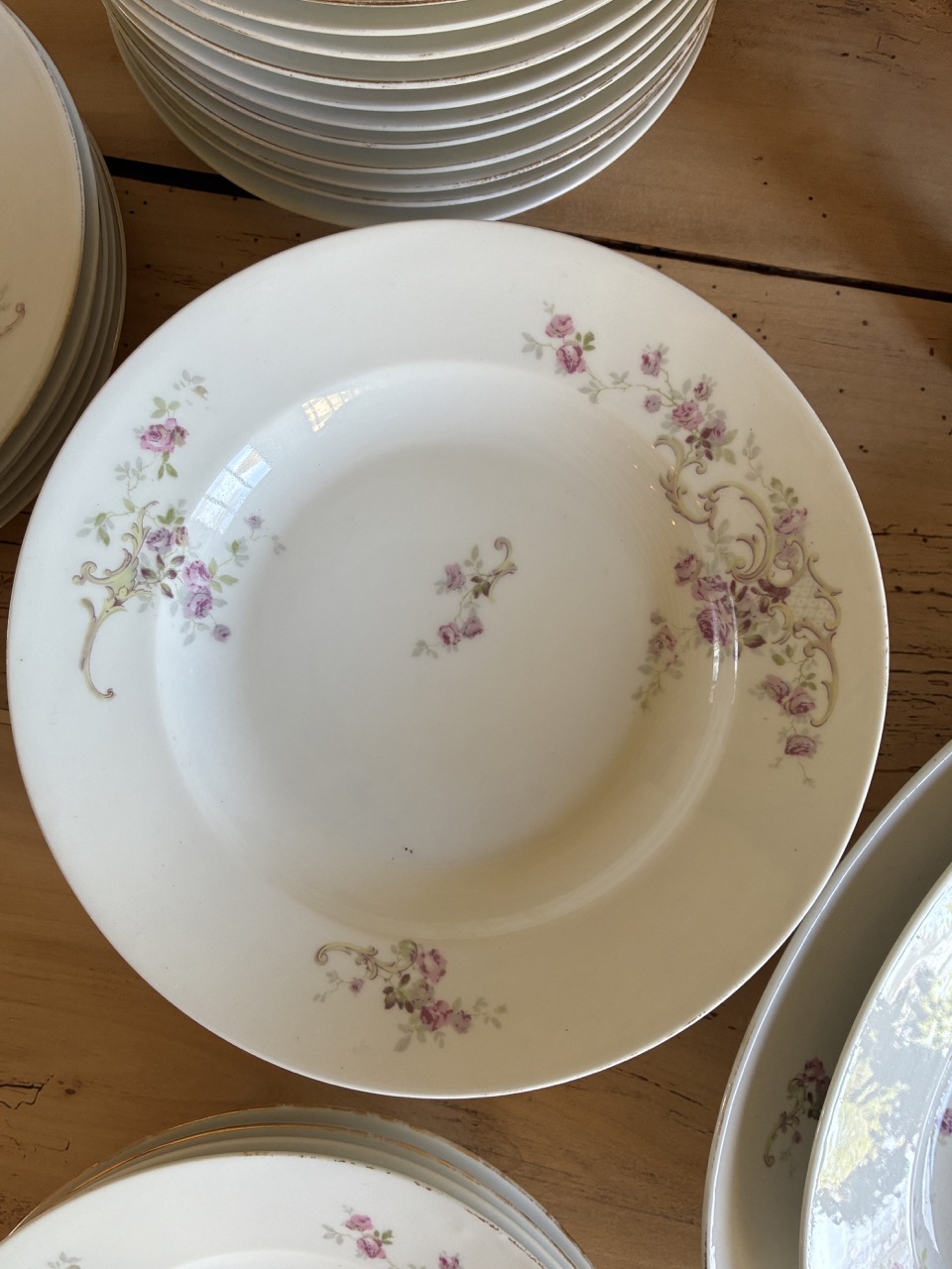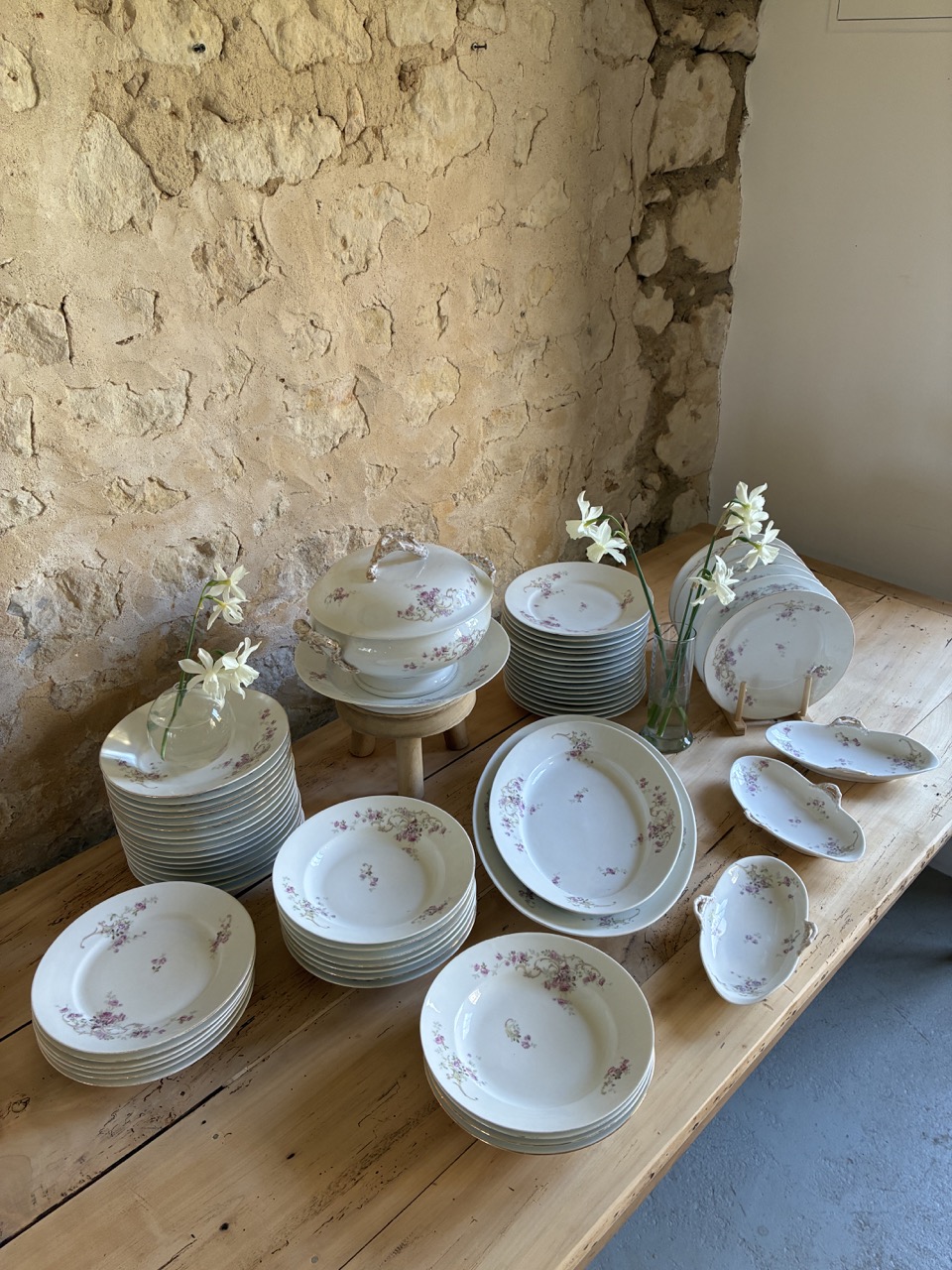 Voici un très beau lot de vaisselle en porcelaine avec un joli décor floral rose et blanc.