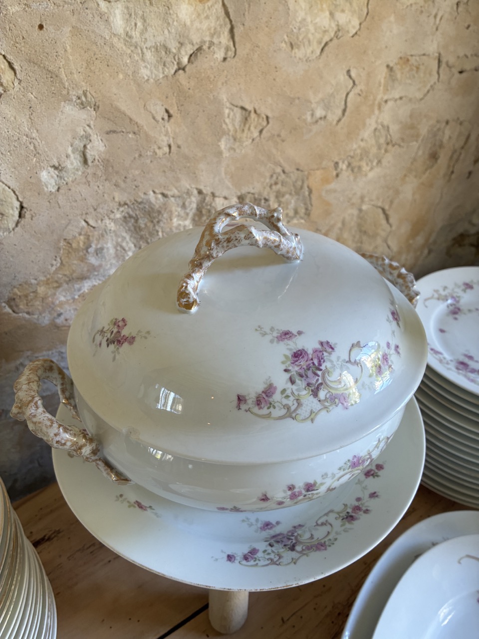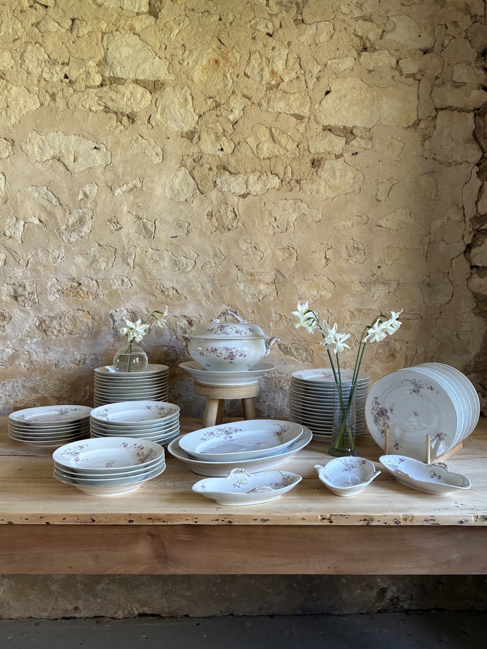 Il constitué de 44 assiettes plates, 11 assiettes à soupe, 3 raviers, 2 plats ovales, un plat rond et une soupière.