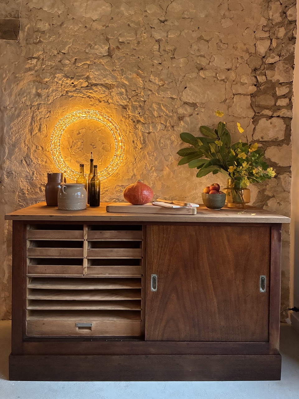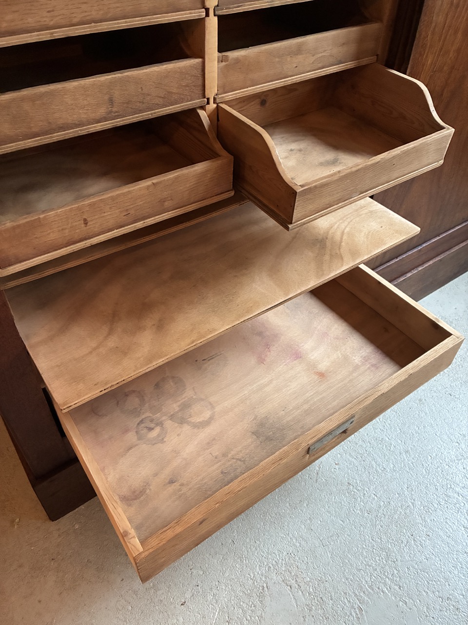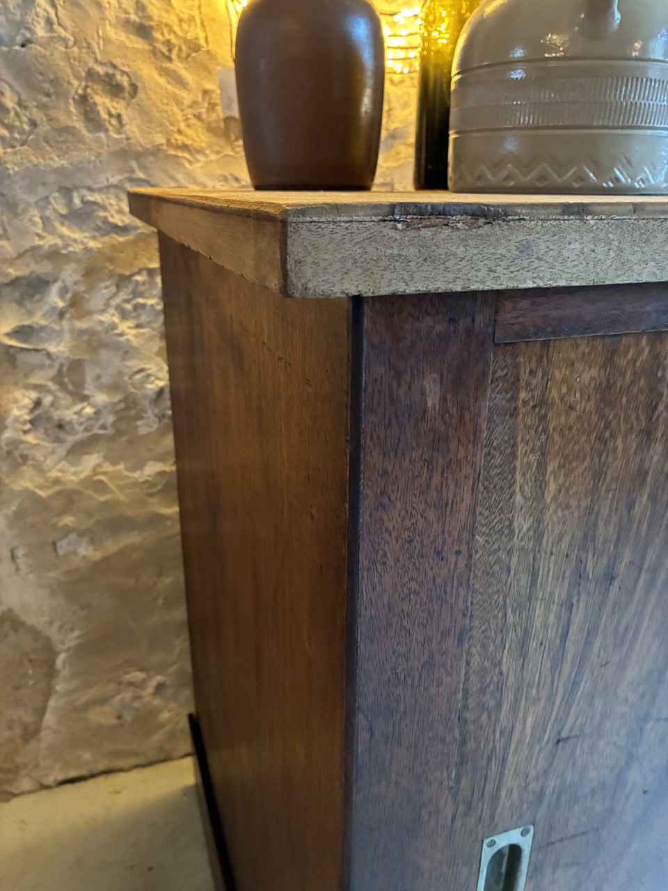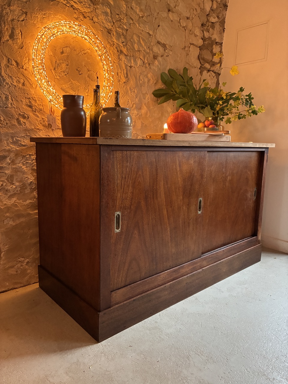 Merveilleuse trouvaille ! L’équipe a entièrement restauré ce meuble de métier couleur chêne foncé.