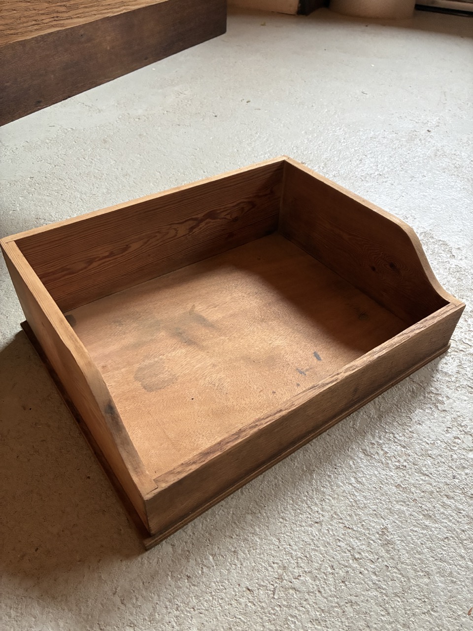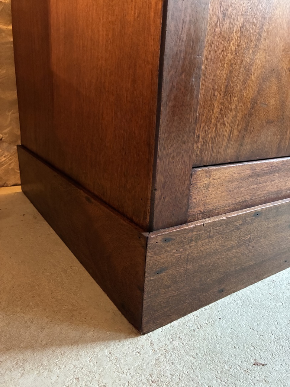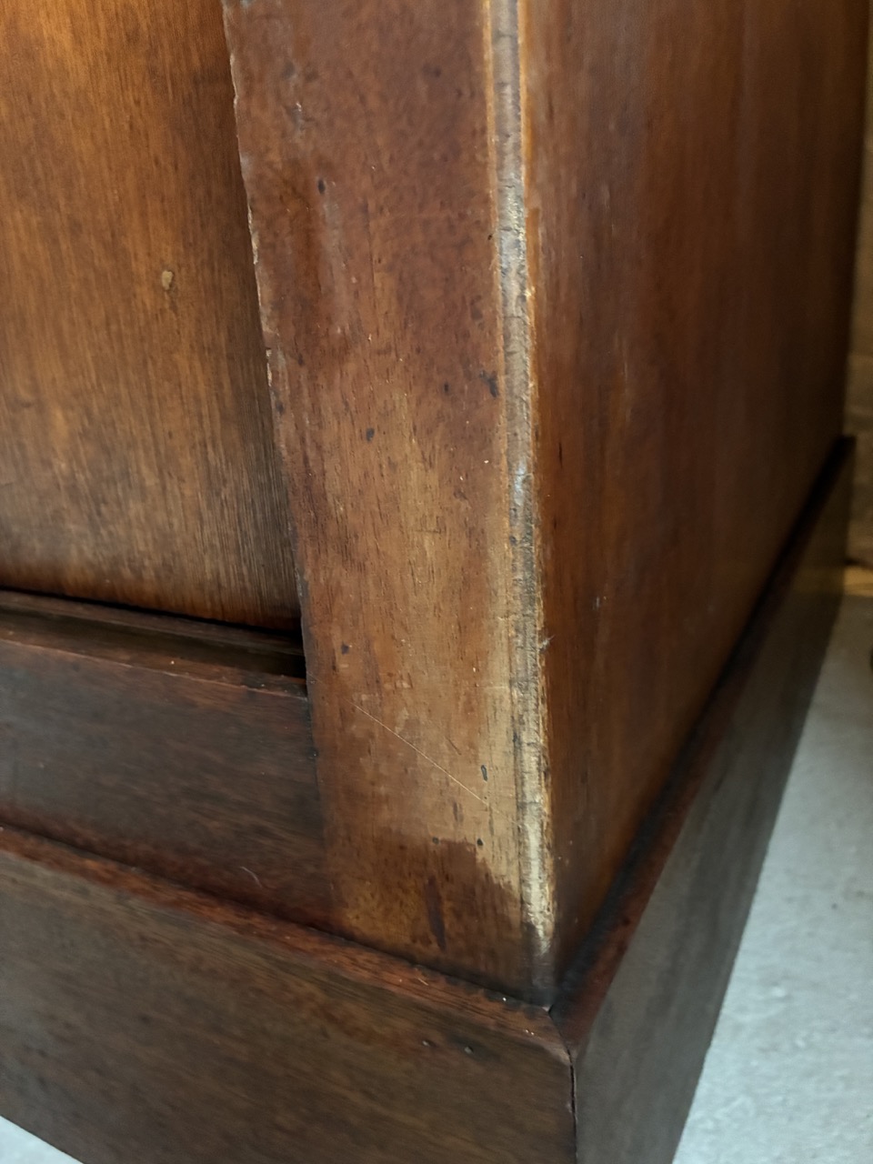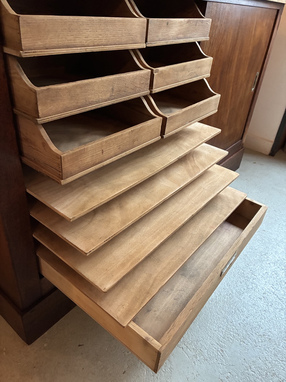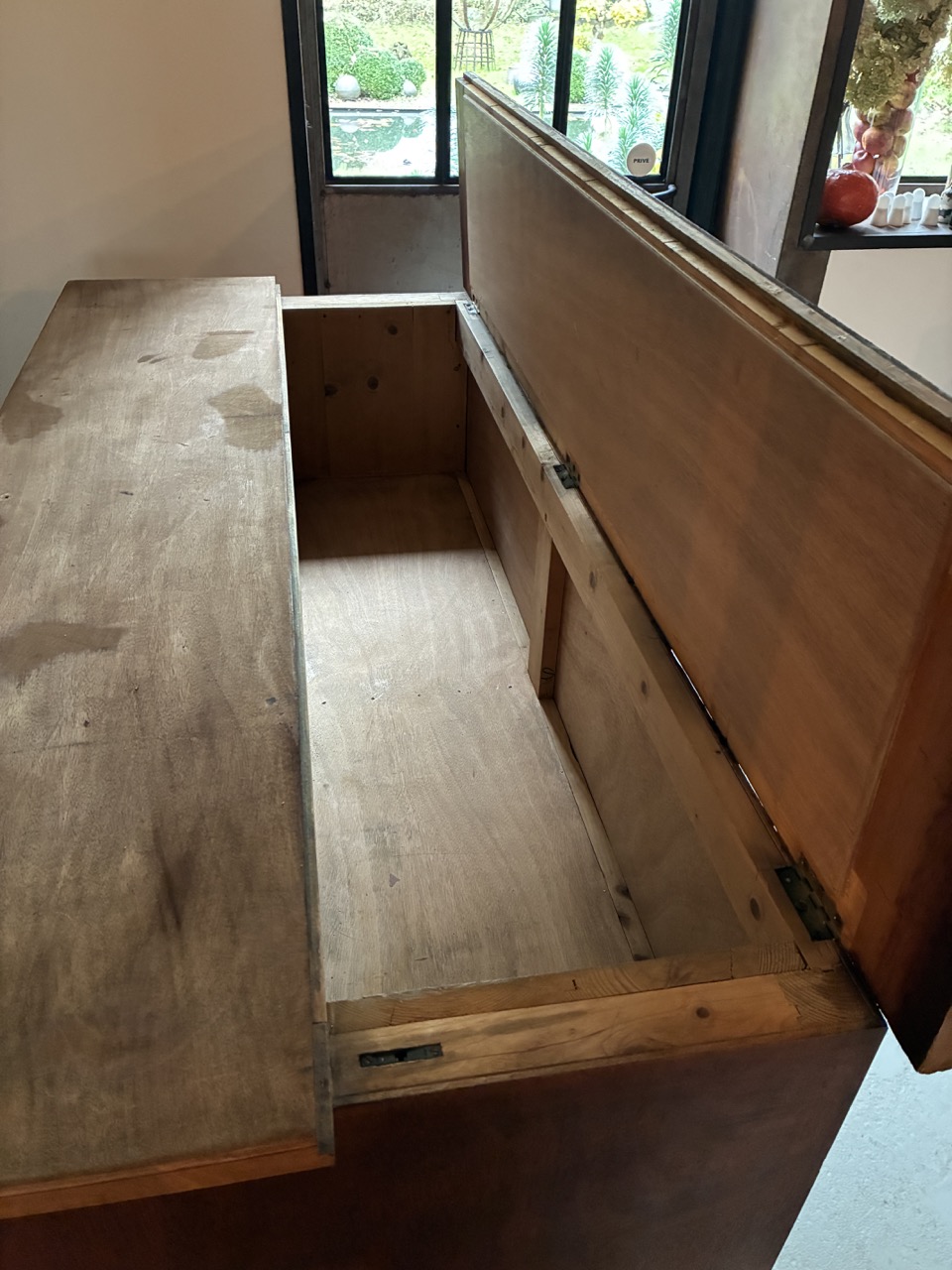 Merveilleuse trouvaille ! L’équipe a entièrement restauré ce meuble de métier couleur chêne foncé.