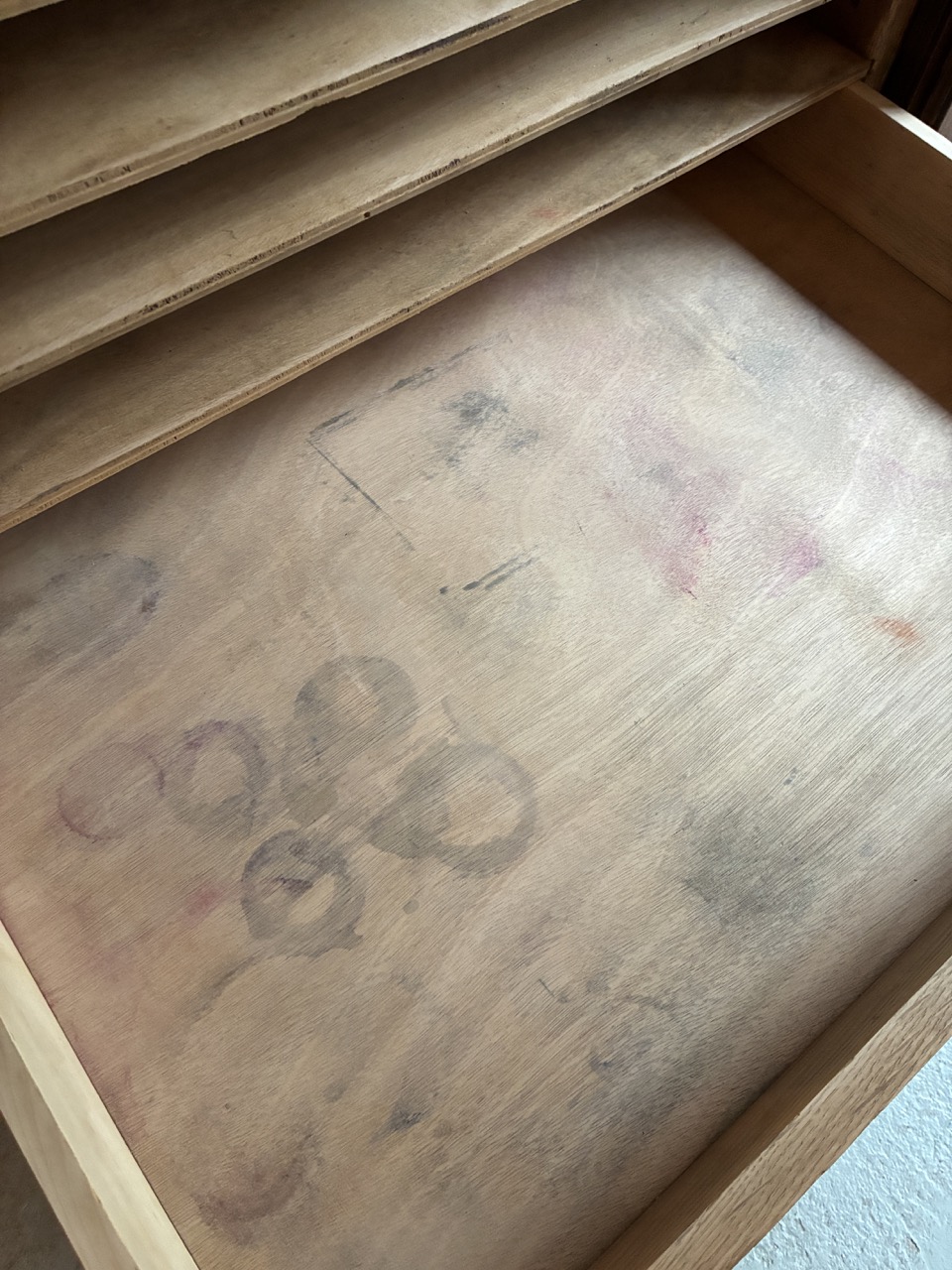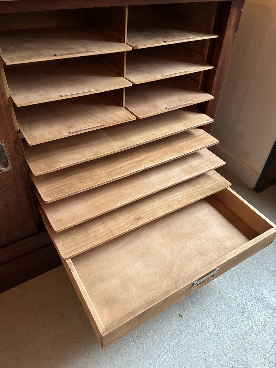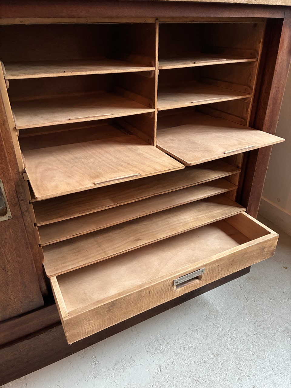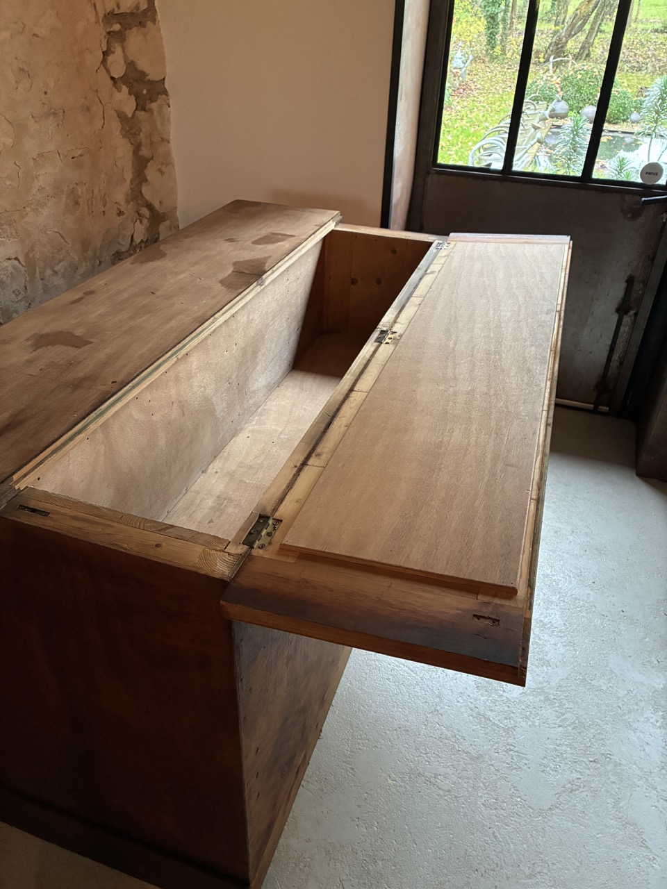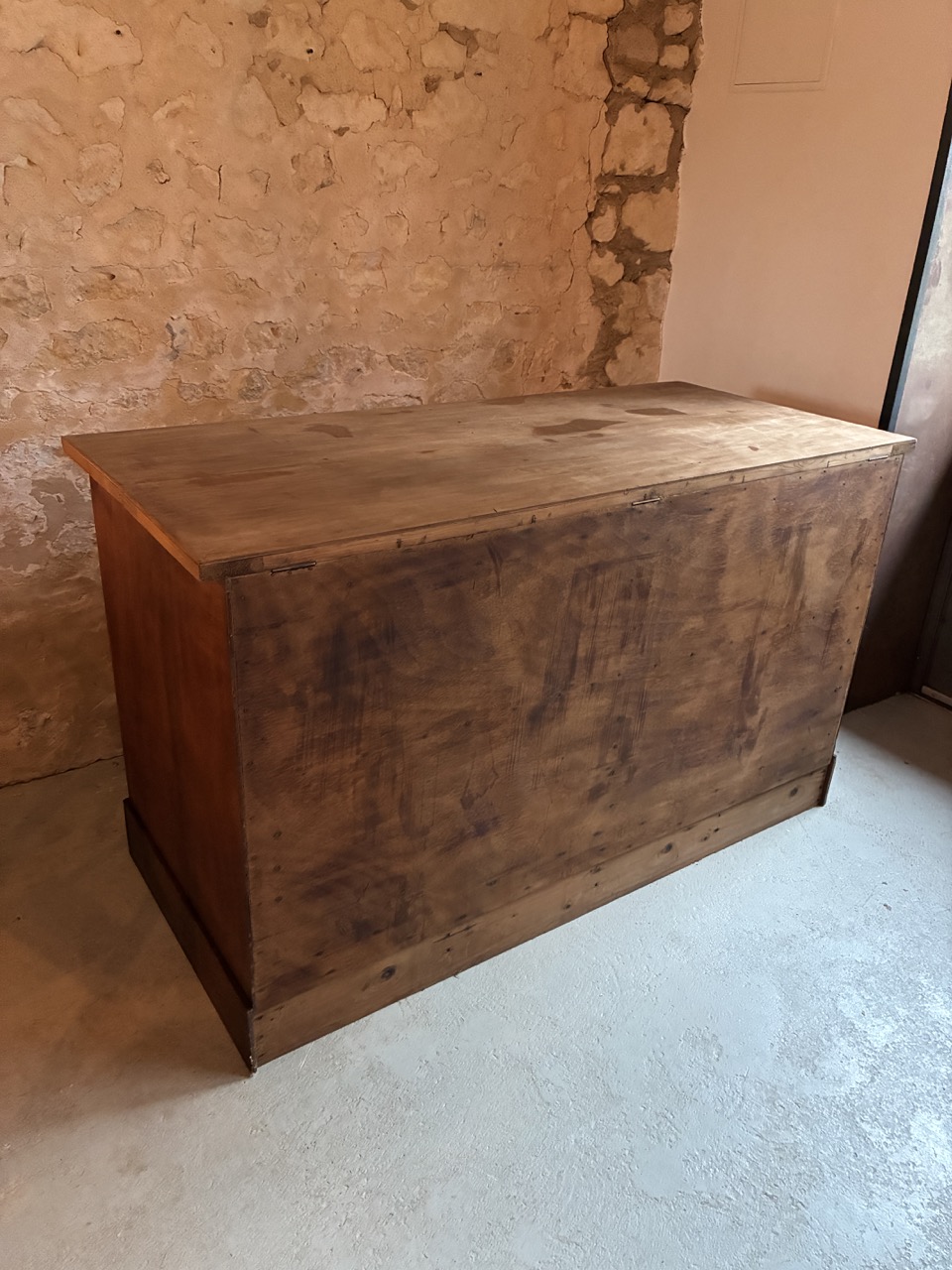 Merveilleuse trouvaille ! L’équipe a entièrement restauré ce meuble de métier couleur chêne foncé. Avec ses nombreux tiroirs (parfois amovibles) et étagères on l’imagine parfaitement en ilot central, bar ou tout simplement en meuble de rangement. Étonnant, son plateau s’ouvre au centre dans la longueur pour un rangement type malle.
