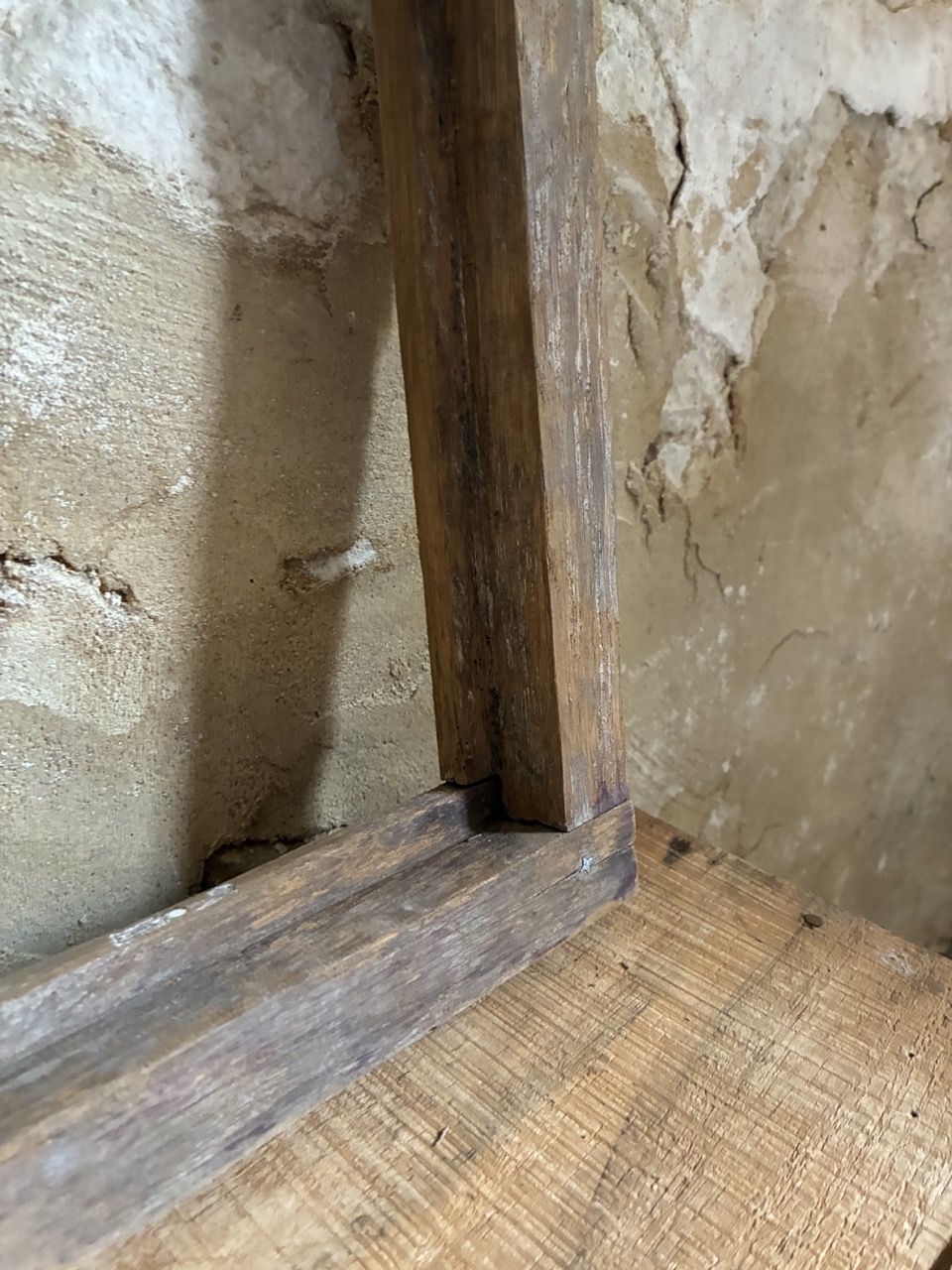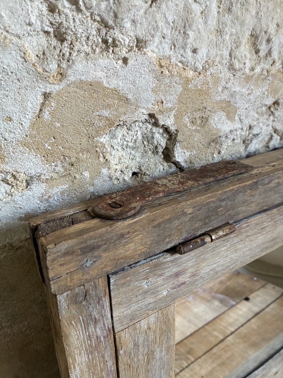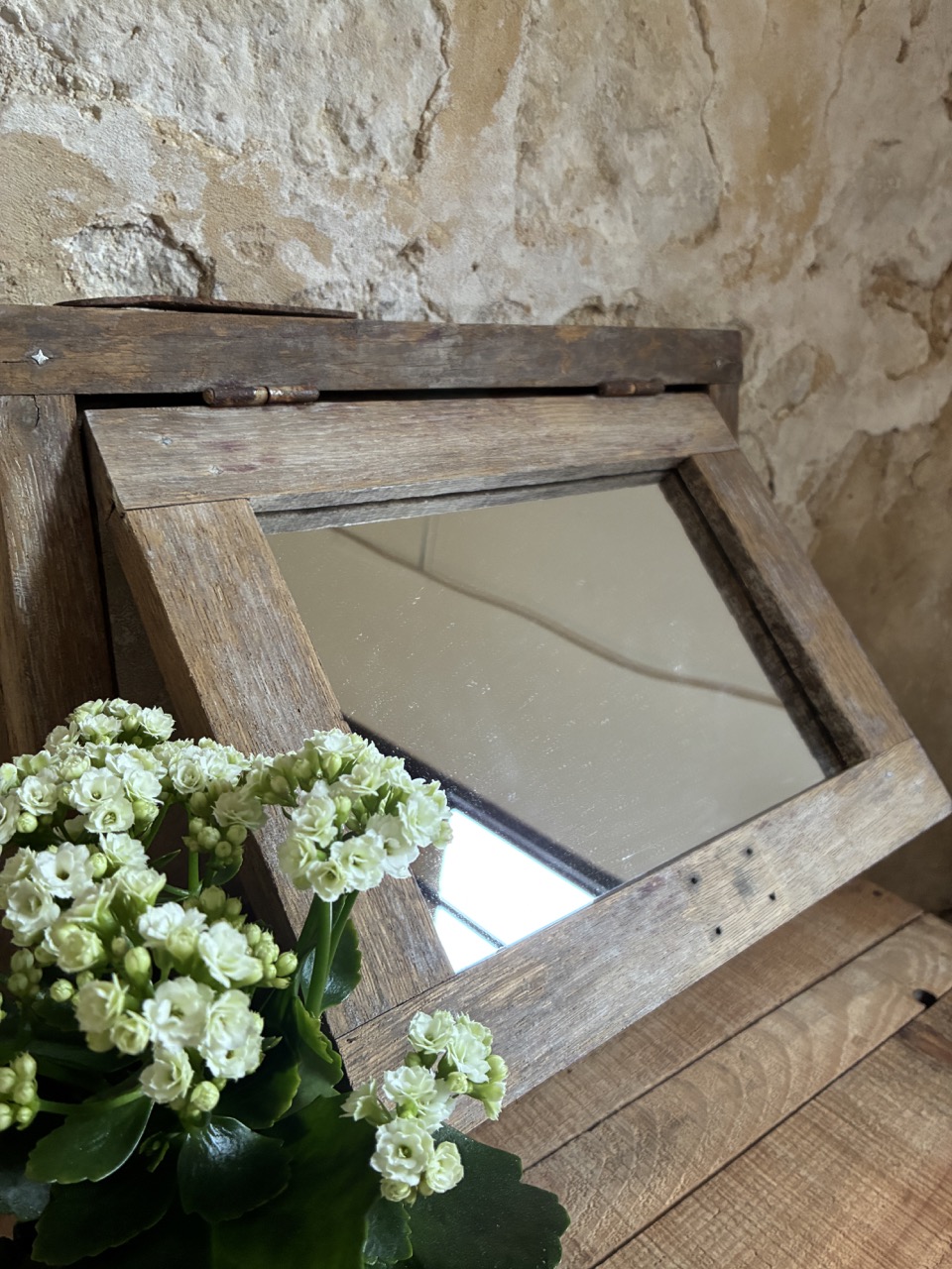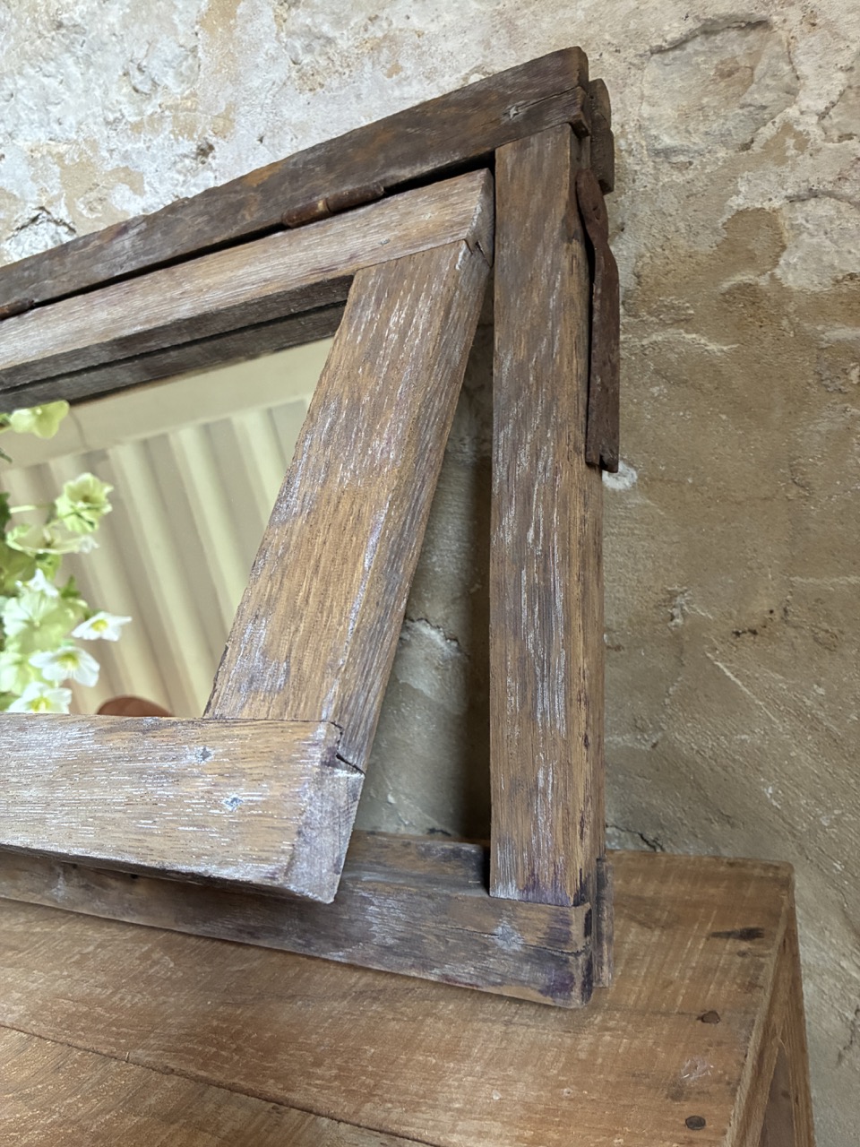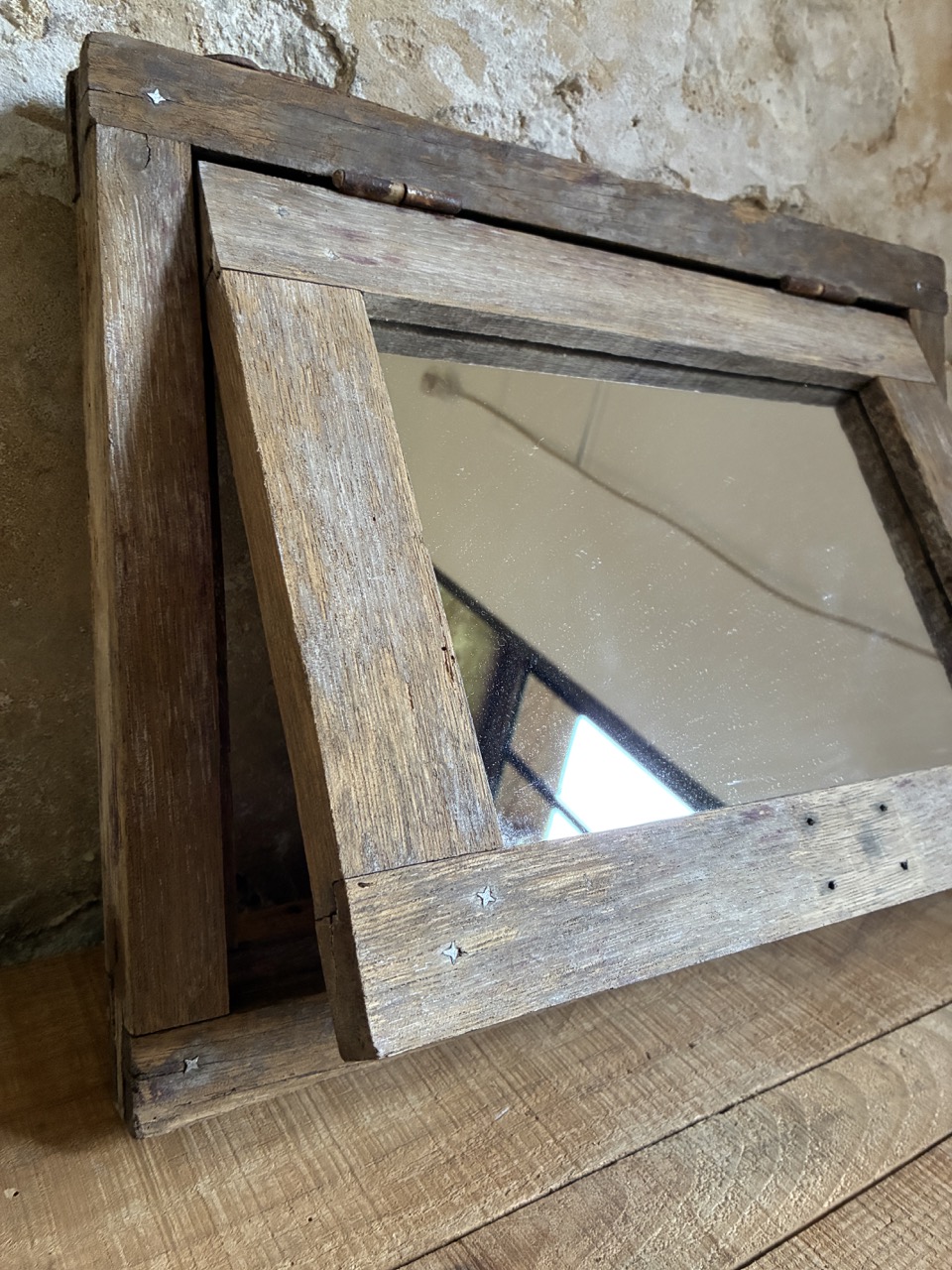 Joli châssis miroité. Celui-ci peut être positionné soit à l’horizontale, soit posé à la verticale. Son battant peut s’ouvrir et être utilisé comme petite trappe. On aime son aspect vieilli.