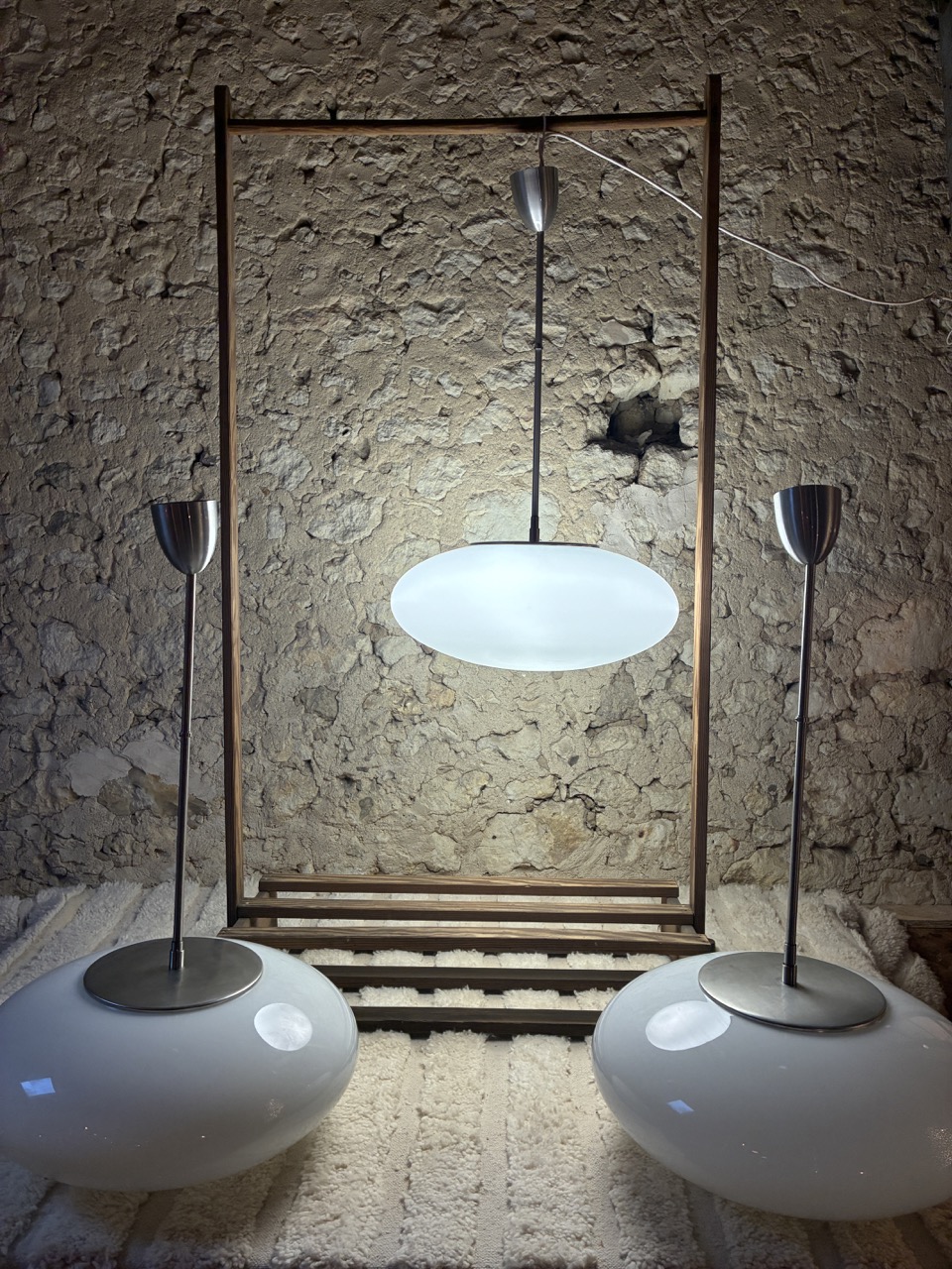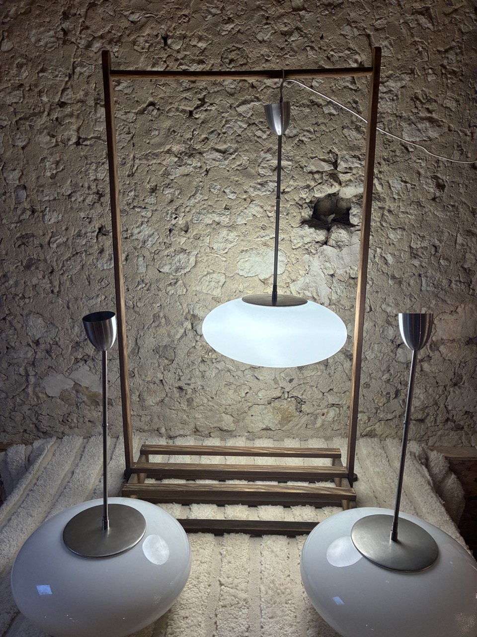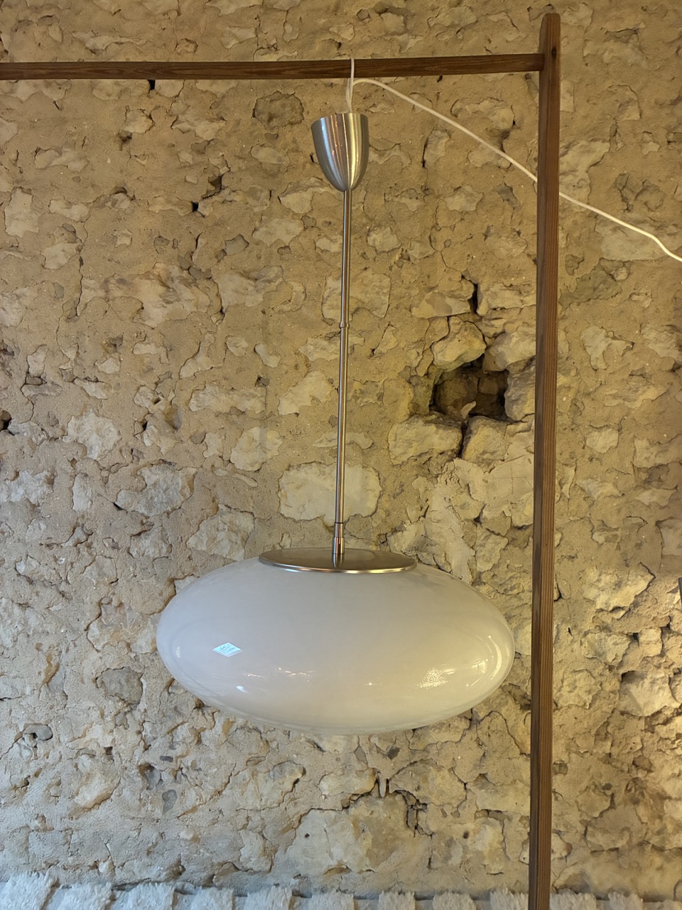 Rare! Nous avons chiné 3 reproductions de la suspension « Pendant UFO » créée par NILS JONSSON, avec led intégré. Son abat jour est en verre blanc opalin, équipé d’une tige tubulaire en métal chromé.