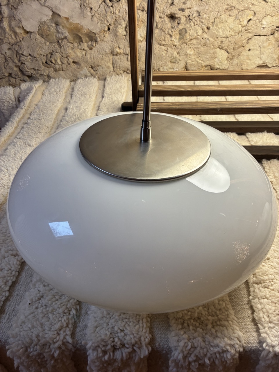 Globe verre blanc opalin, tige en métal chromé.