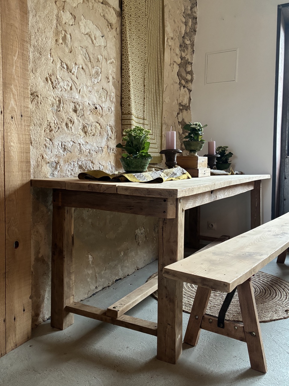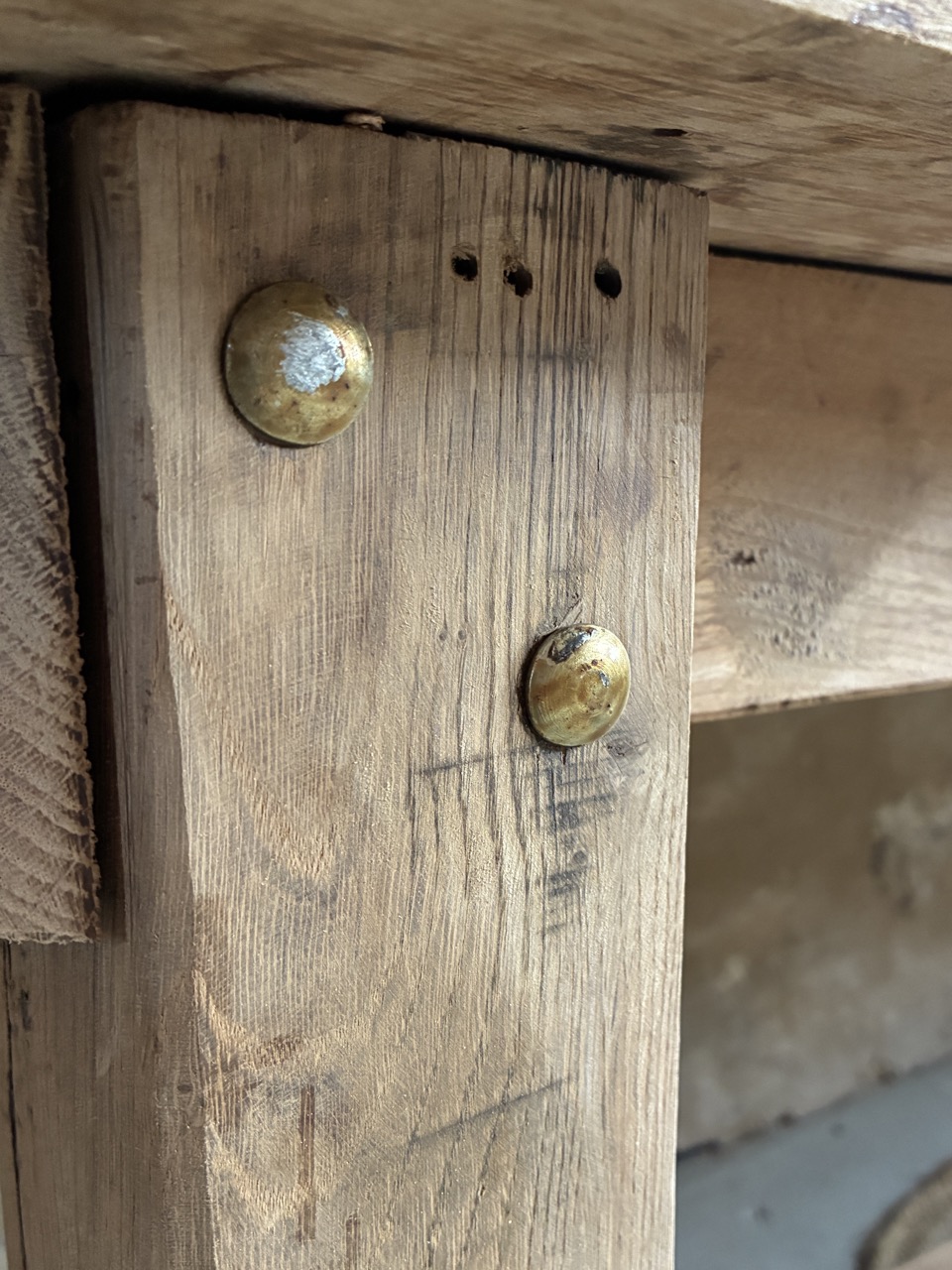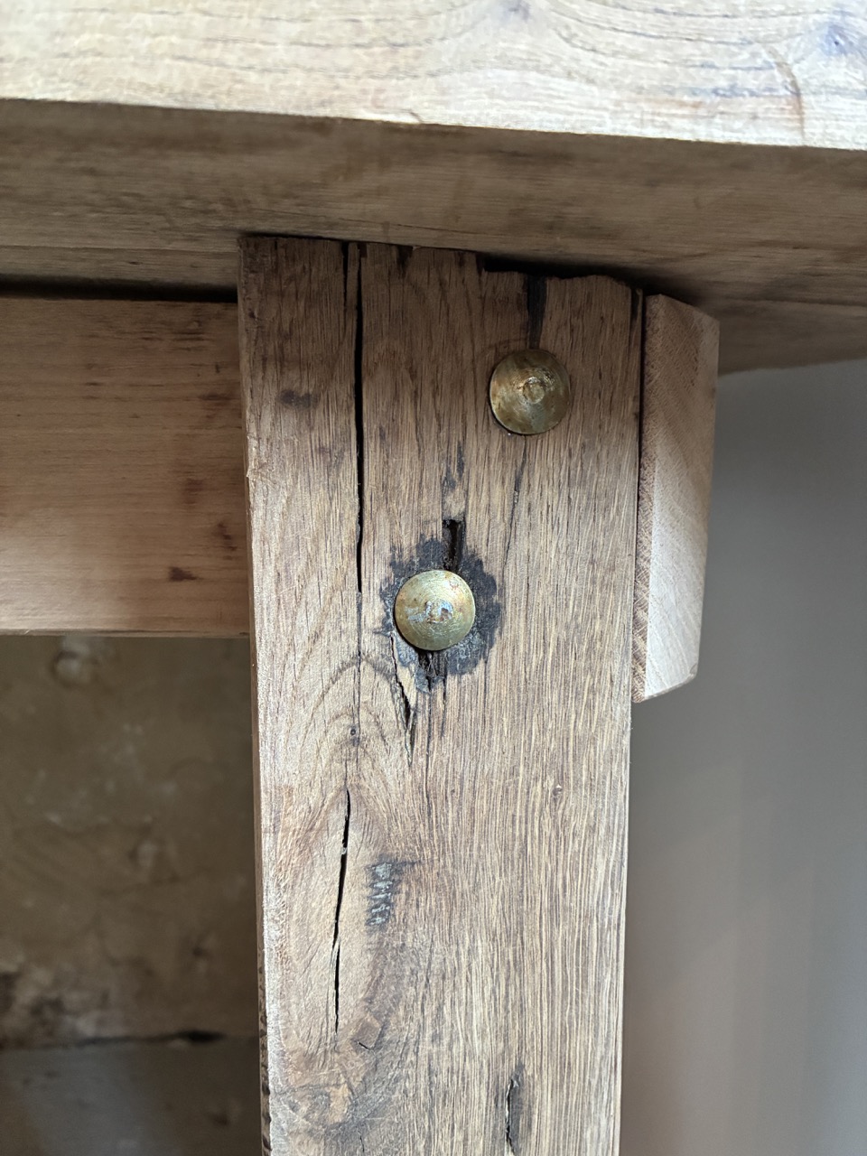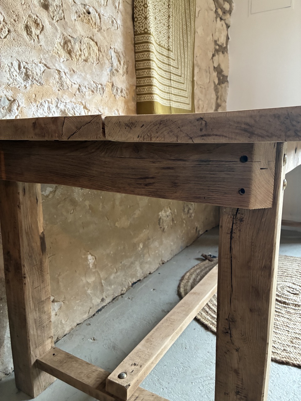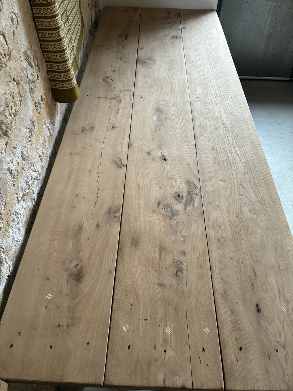 Belle table de salle à manger faite en bois d’orme. Elle peut accueillir jusqu’à 8/10 personnes. On aime ses détails, avec ses rivets dorés, sa structure unique et son plateau massif.