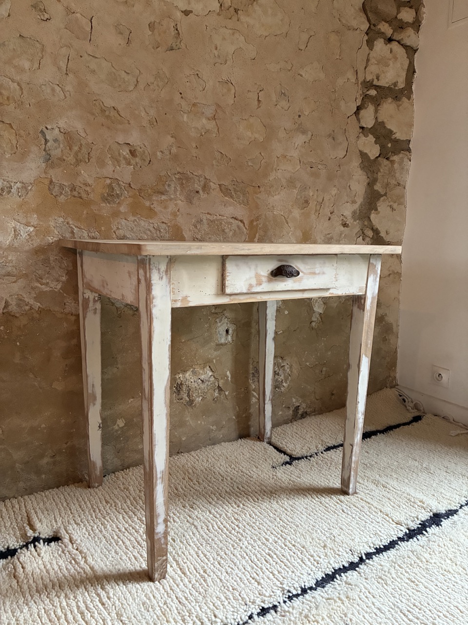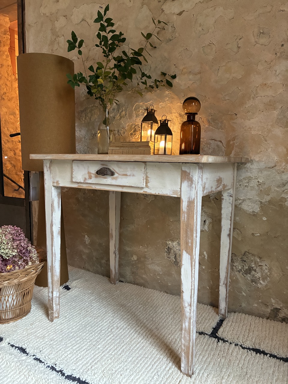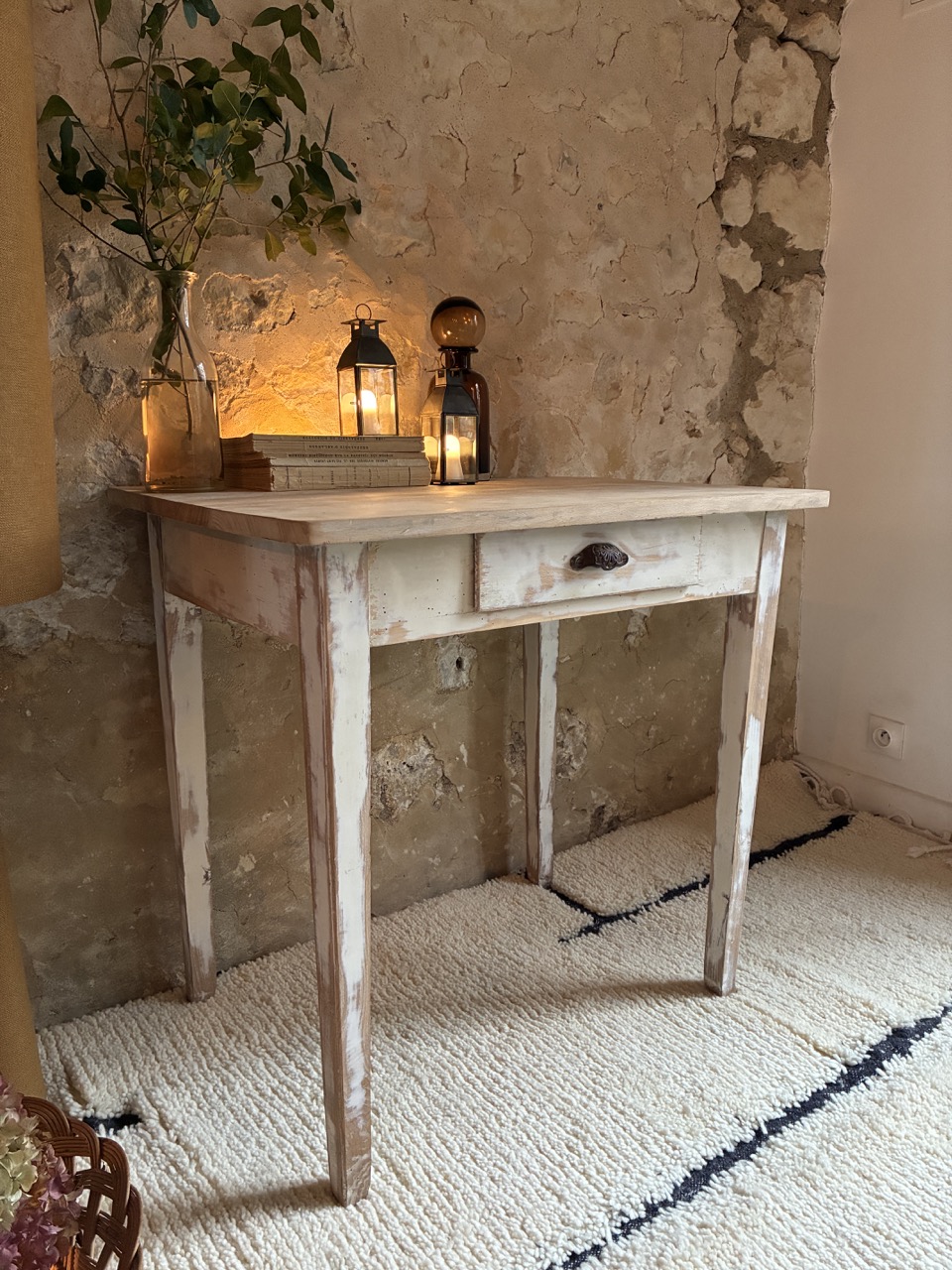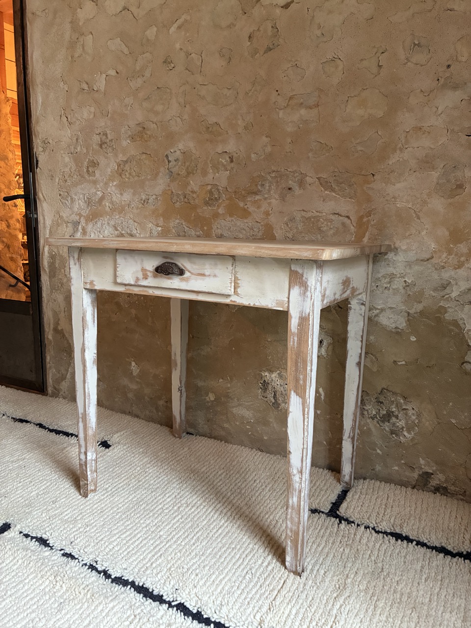 Un bureau ou une table d’appoint, doté d’un tiroir. Plateau brut et pieds patinés blancs. Pour une chambre ou un bureau.