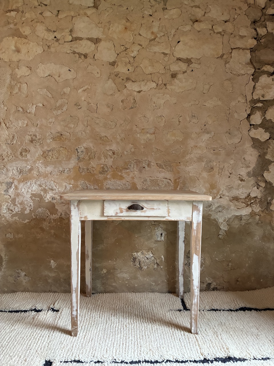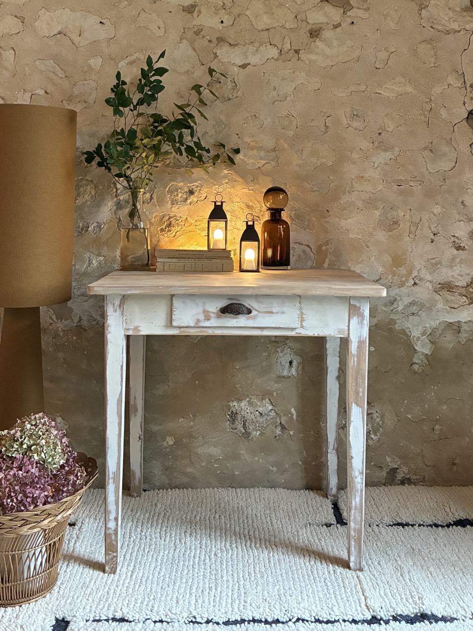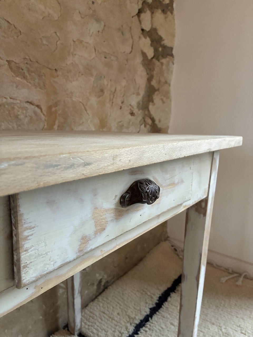 Un bureau ou une table d’appoint, doté d’un tiroir. Plateau brut et pieds patinés blancs. Pour une chambre ou un bureau.