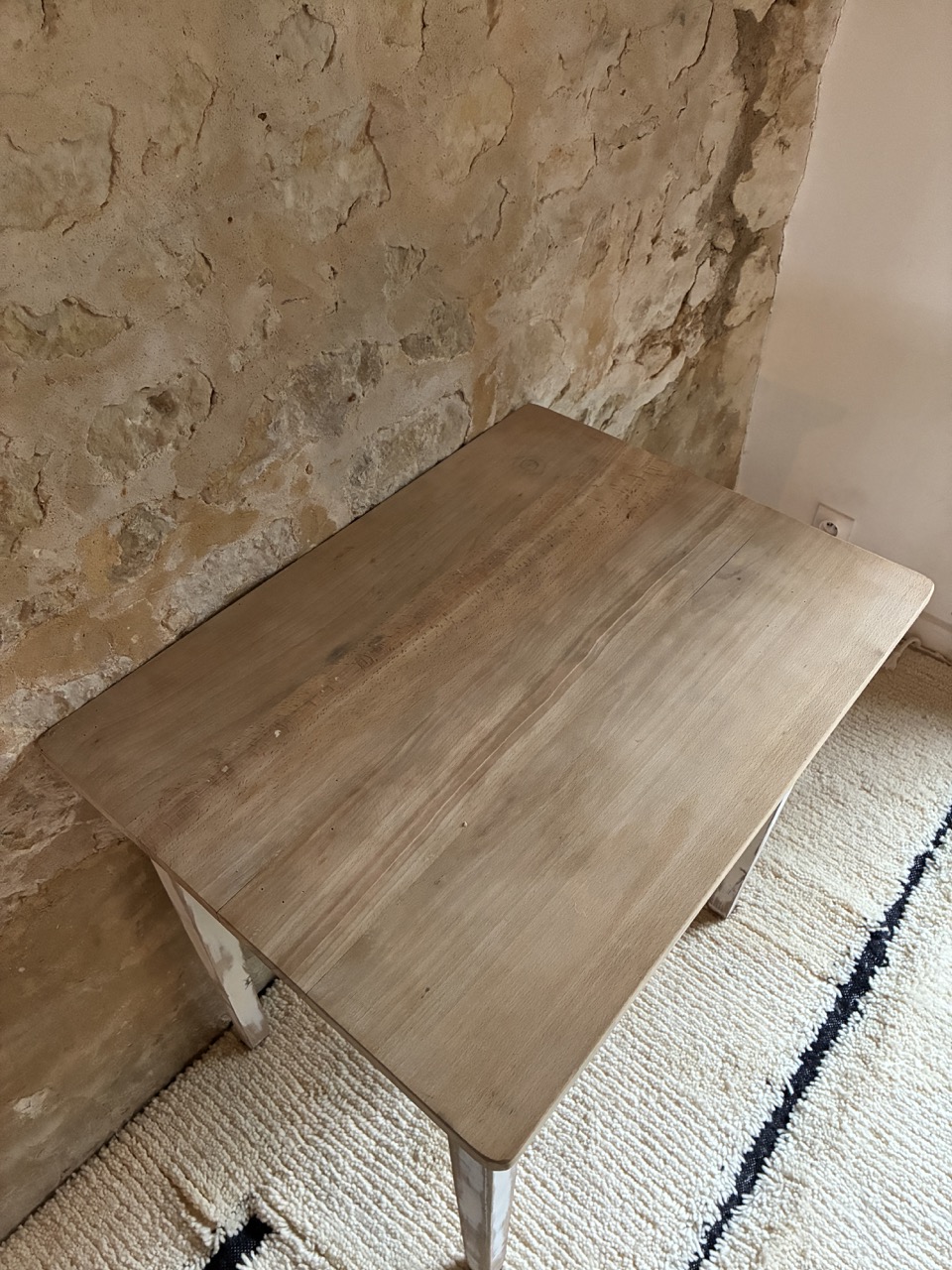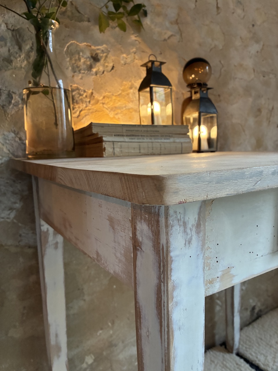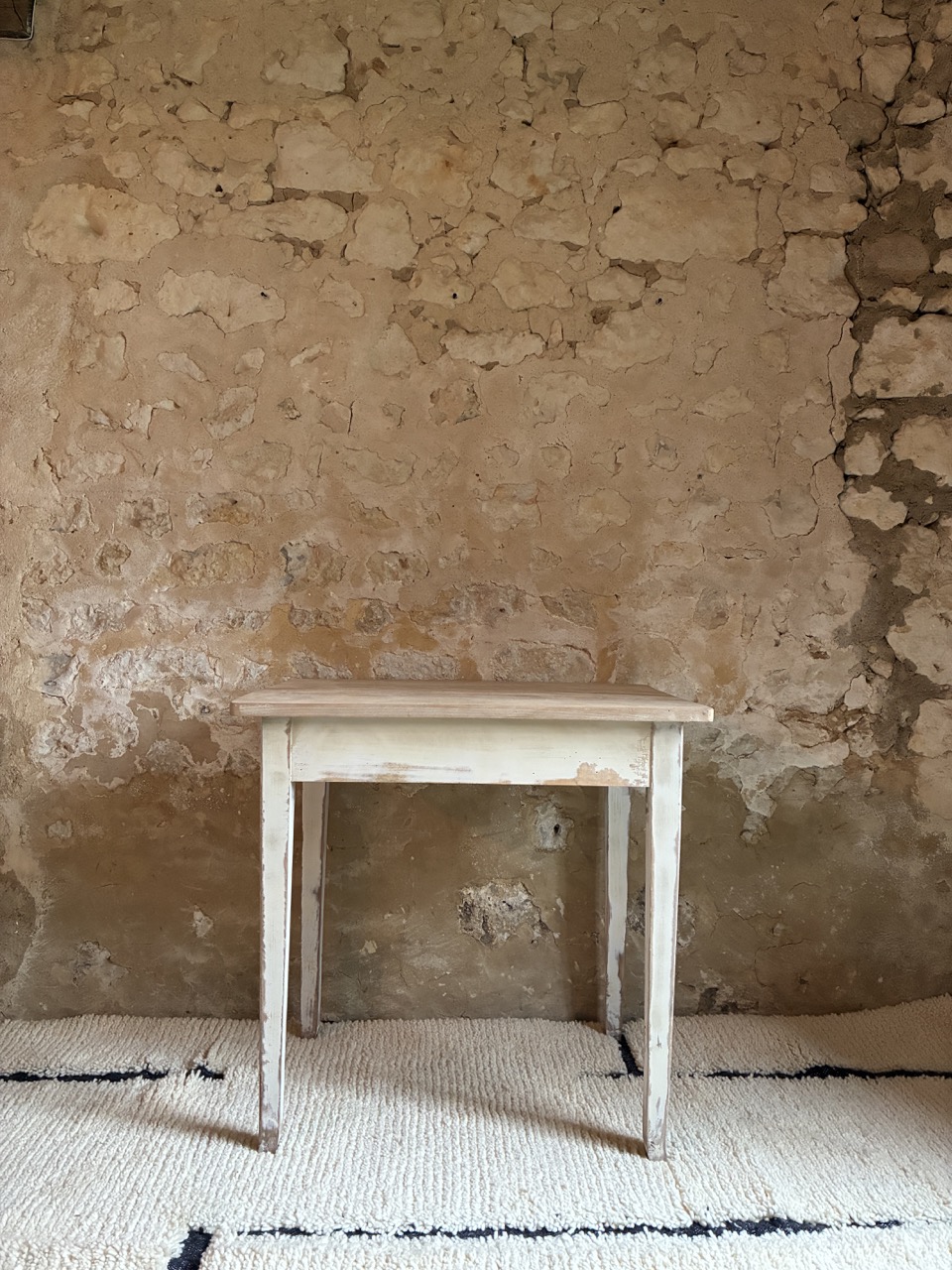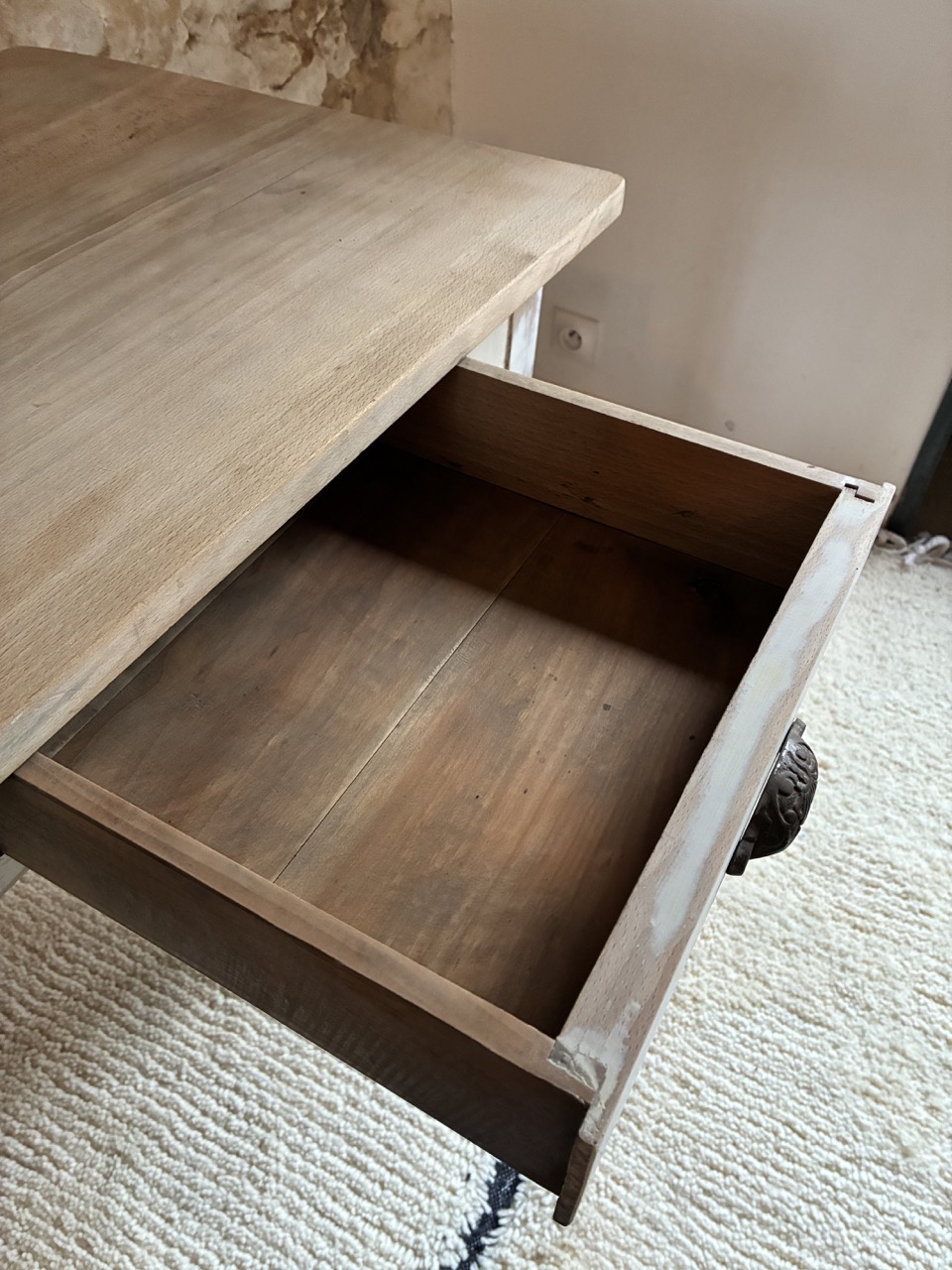 Un bureau ou une table d’appoint, doté d’un tiroir. Plateau brut et pieds patinés blancs. Pour une chambre ou un bureau.