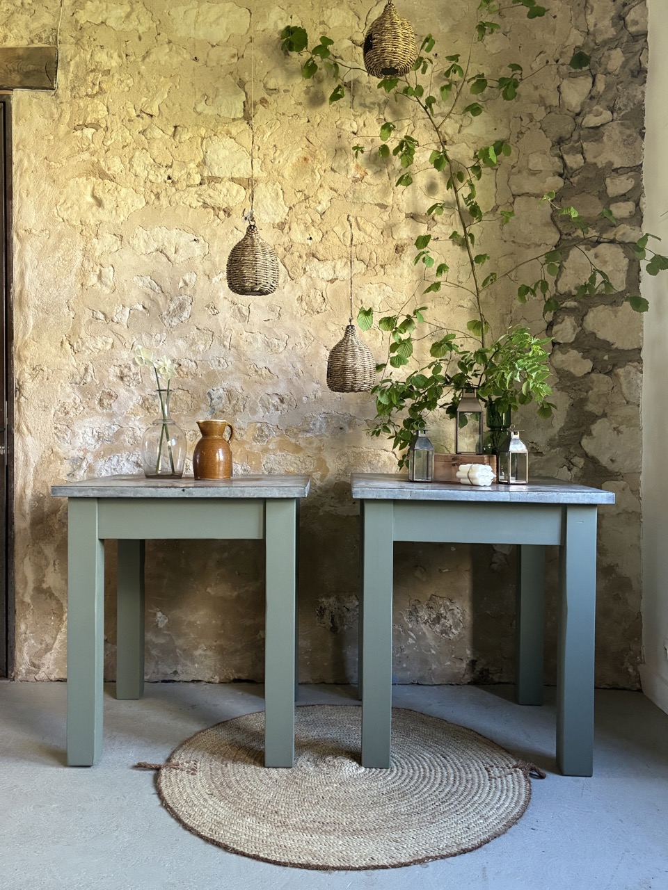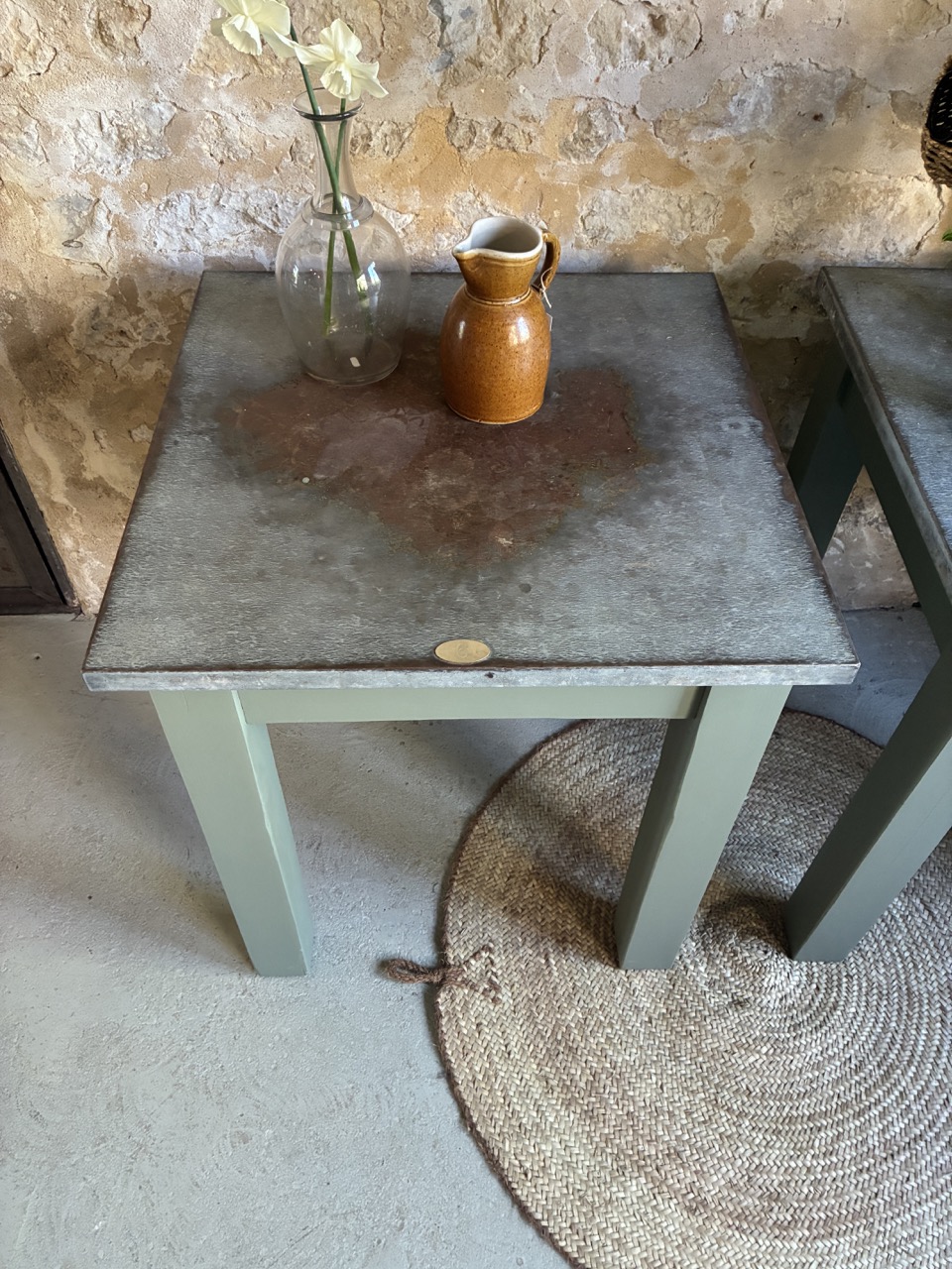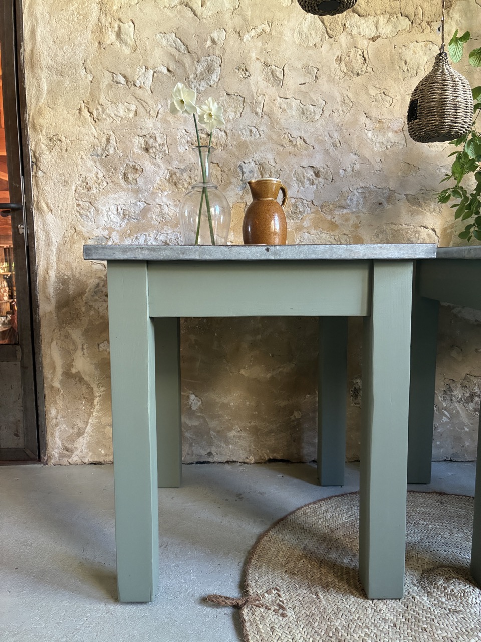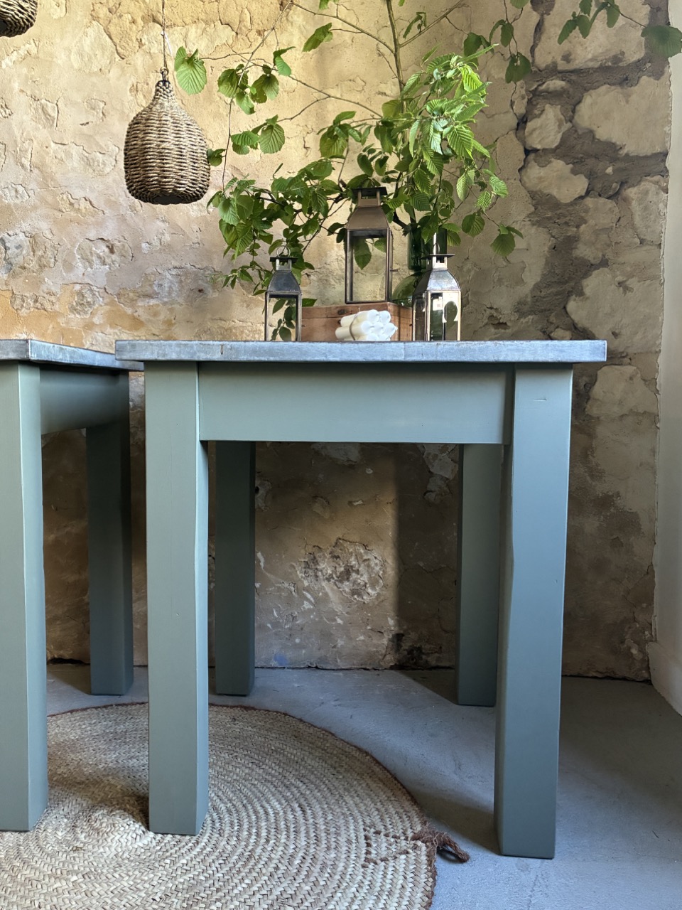 Elles font la paire ! Voici deux tables d’extérieur au piètement kaki et au plateau en zinc. Anciennes tables de bistrot, elles portent encore le numéro du plan de salle. L’une est numérotée 6, l’autre 9. Elles peuvent servir de table de rempotage, de table d’appoint ou même de support à plancha. On adore !