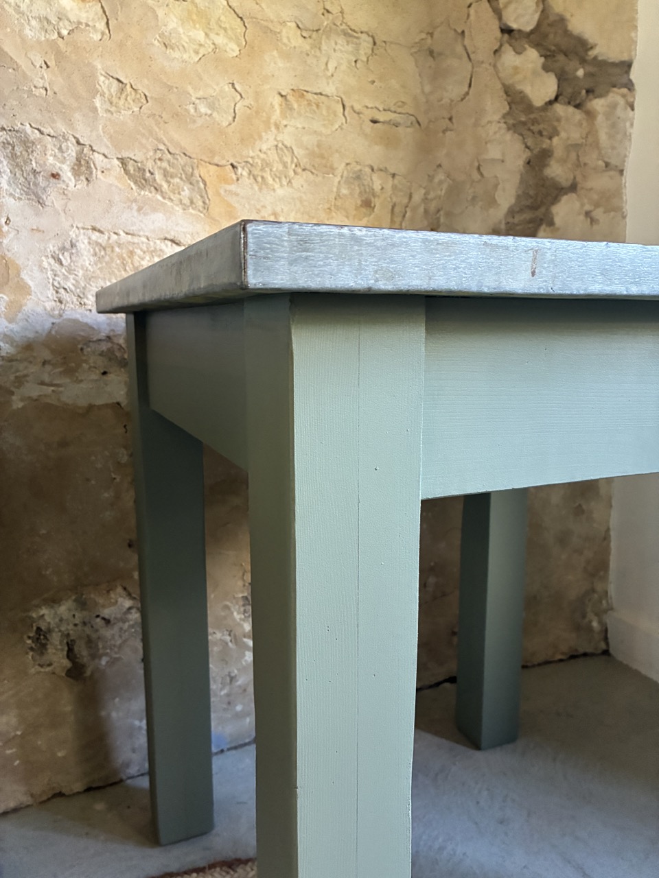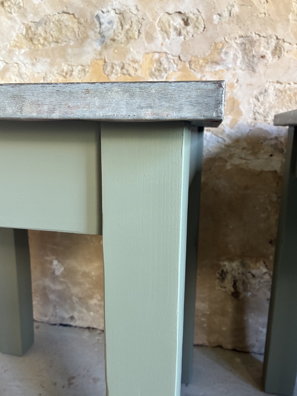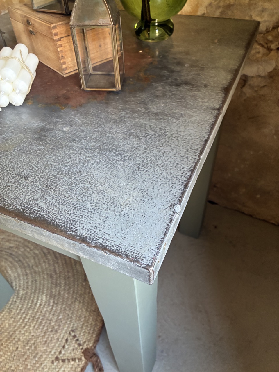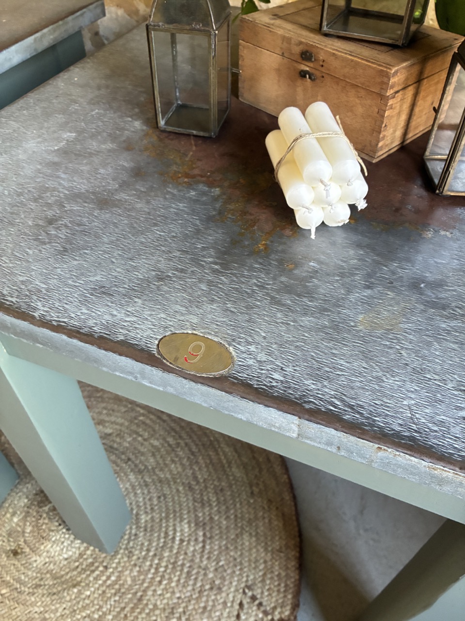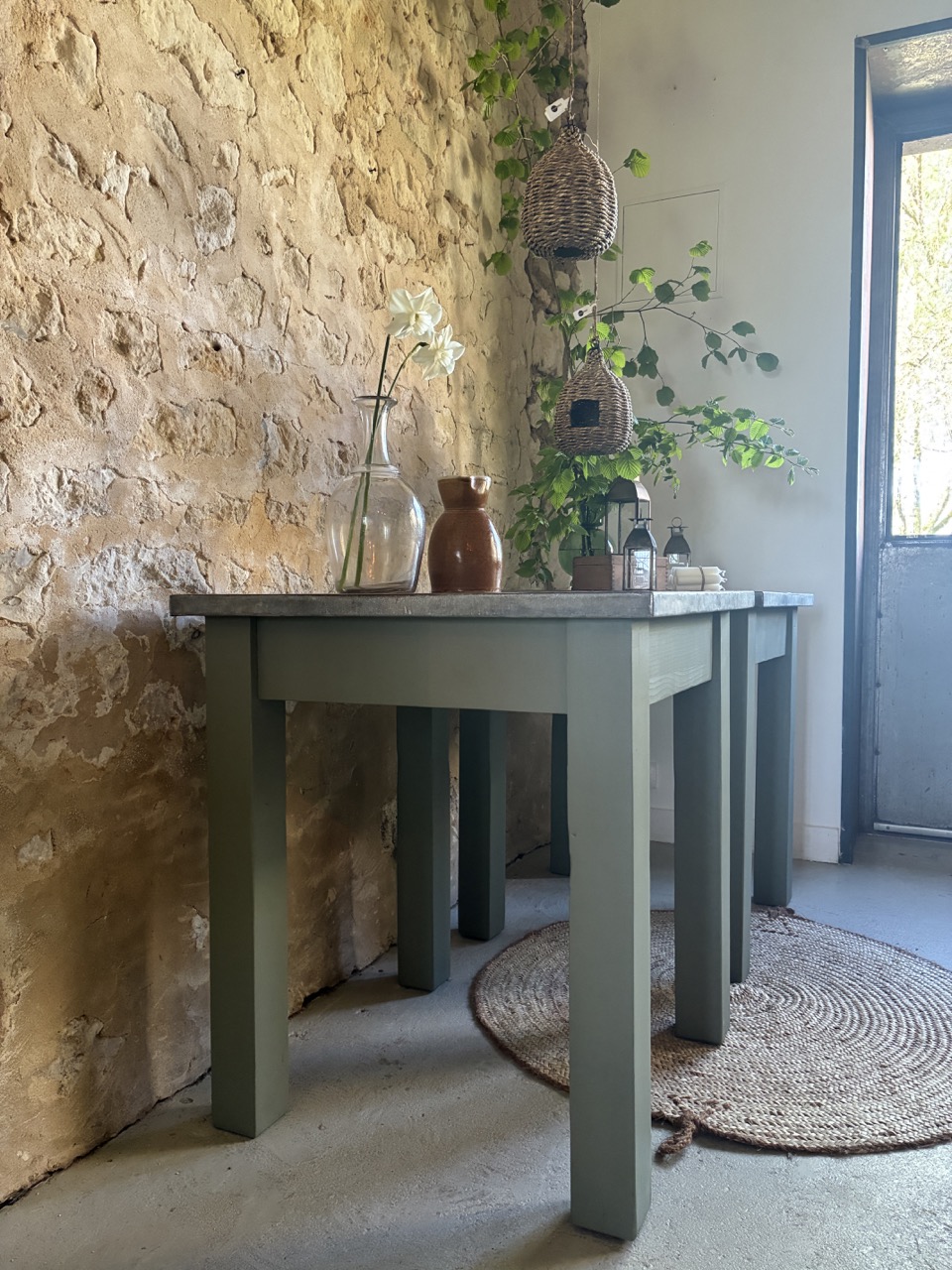 Elles font la paire ! Voici deux tables d’extérieur au piètement kaki et au plateau en zinc. Anciennes tables de bistrot, elles portent encore le numéro du plan de salle. L’une est numérotée 6, l’autre 9. Elles peuvent servir de table de rempotage, de table d’appoint ou même de support à plancha. On adore !