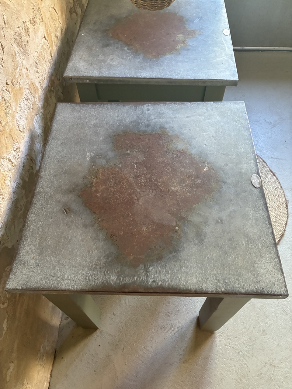 Tables d’extérieur, piètement kaki et plateau en zinc.