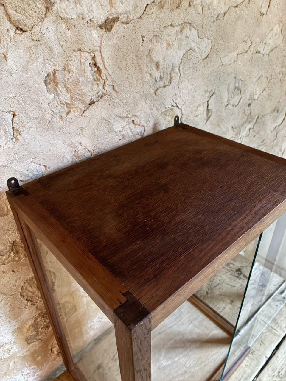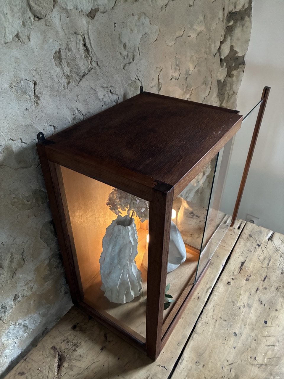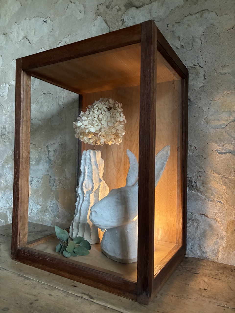 Mignonnerie du jour ! Cette vitrine en chêne avec volet avant coulissant est parfaite pour mettre en avant vos belles pièces de décoration, un bouquet de fleurs séchées, ou même de la lumière. Elle peut soit se poser sur un buffet, une table ou au sol, soit être accrochée au mur grâce à ses attaches en métal.